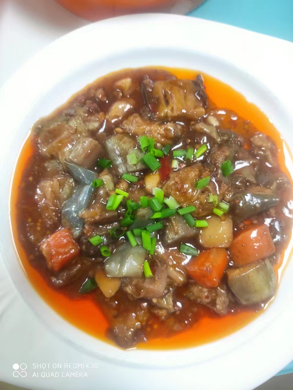 Готовый набор для приготовления из фарша и баклажанов, полуфабрикат для риса на вынос, блюдо в маленькой миске, замороженное готовое блюдо из ресторана для подачи с рисом.