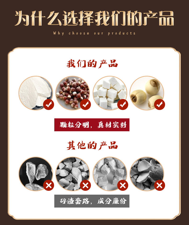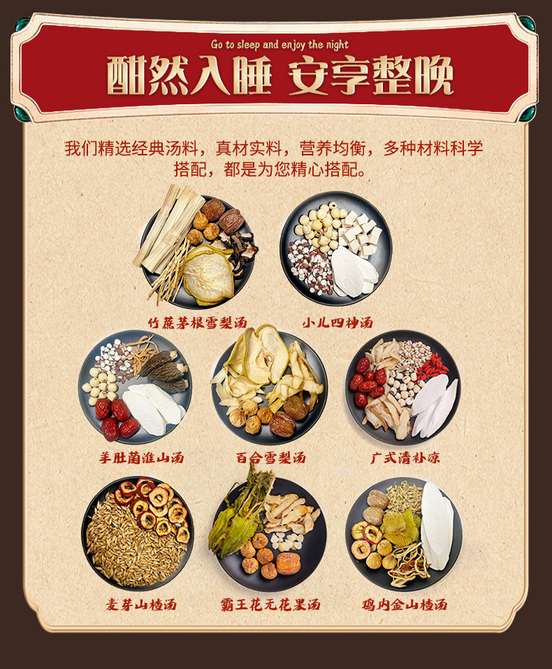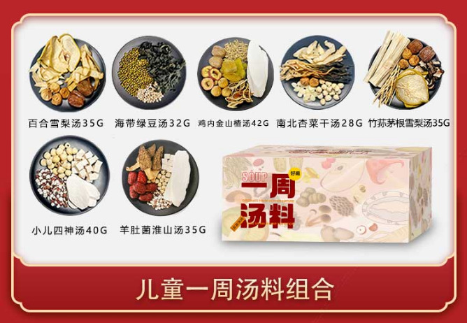 Бамбуковая трость Мао корень Грушевый суп 45 г; 35 г Морчелла Хуайшань суп; Детский отвар Сишень, 40 г; Лилия груша суп 35 г; Cantonese Style освежающий и охлаждающий 45 г; Солодовый Боярышник суп 25 г; Bawang Цветочный Инжирный суп 30 г; Курица внутренняя Золотая Боярышник суп 42 г; Бамбуковая трость Мао корень Грушевый суп 150 г; 85 г сморчки супа Хуайшань; Детский отвар Сишень 200 г; Лилия груша суп 75 г; Охлаждение в широком стиле 90 г; Солодовый Боярышник суп 50 г; Bawang Цветочный Инжирный суп 68 г; Курица внутренняя Золотая Боярышник суп 75 г; Детский недельный суп комбинированный 257 г