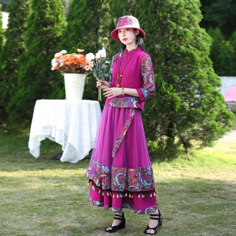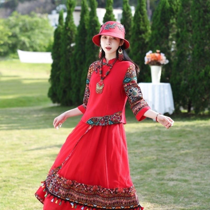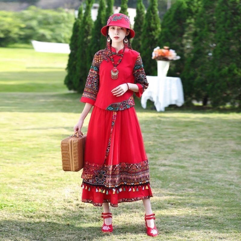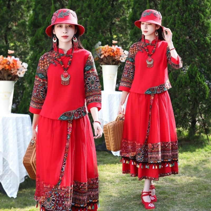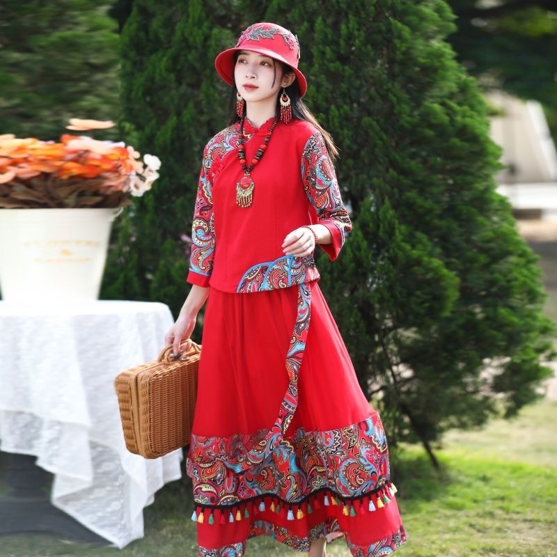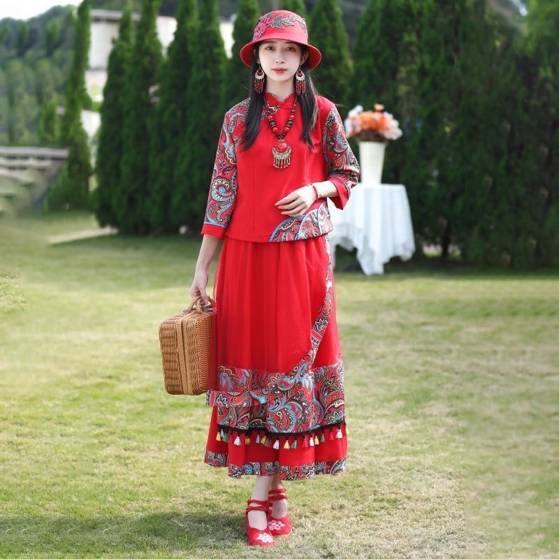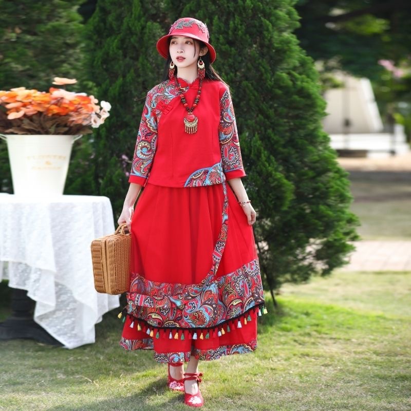Юньнань этнический стиль костюм юбка из двух частей костюм весна и осень новая Этническая Одежда Хлопок Лен костюм юбка в стиле ретро