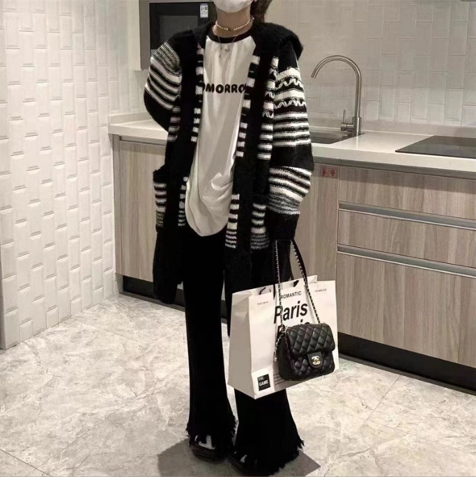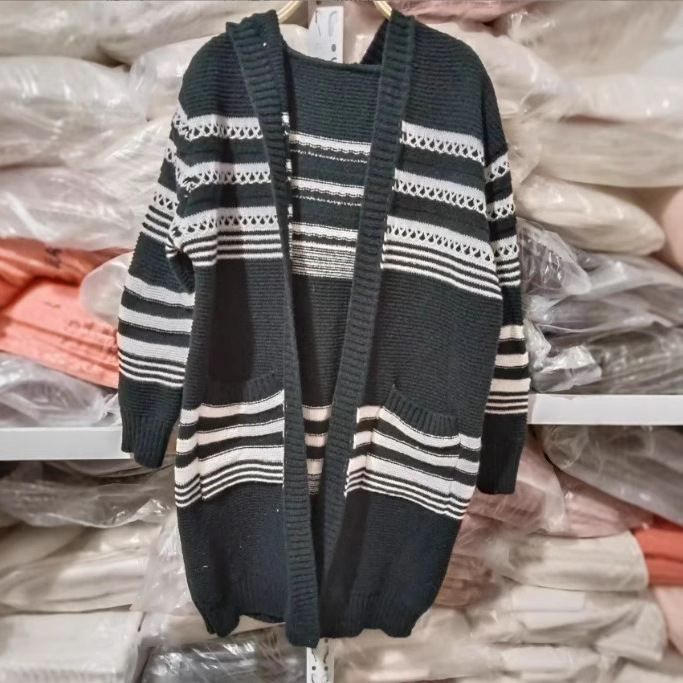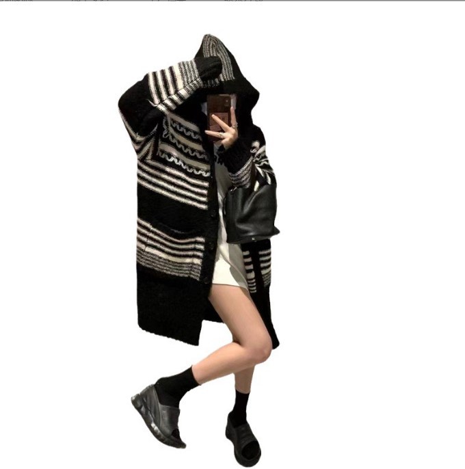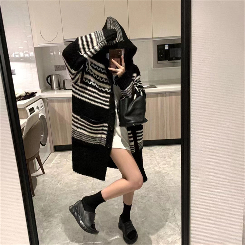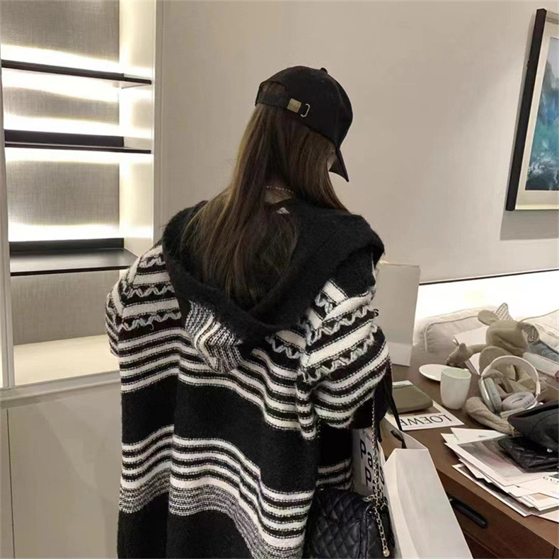 Японский ретро волнистый полосатый свитер черно-белый контрастный кардиган свободный средний длинный свитер с капюшоном большая куртка женская