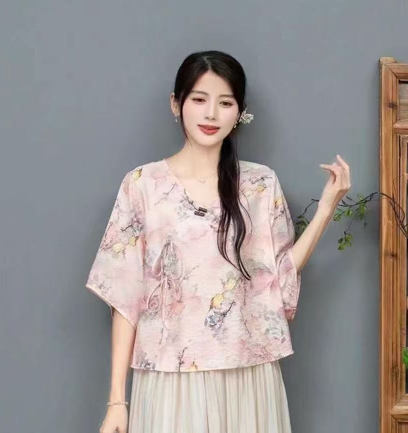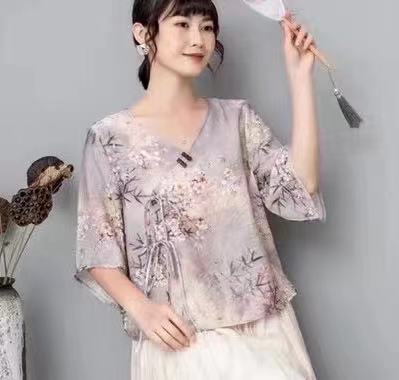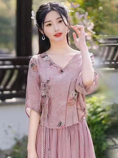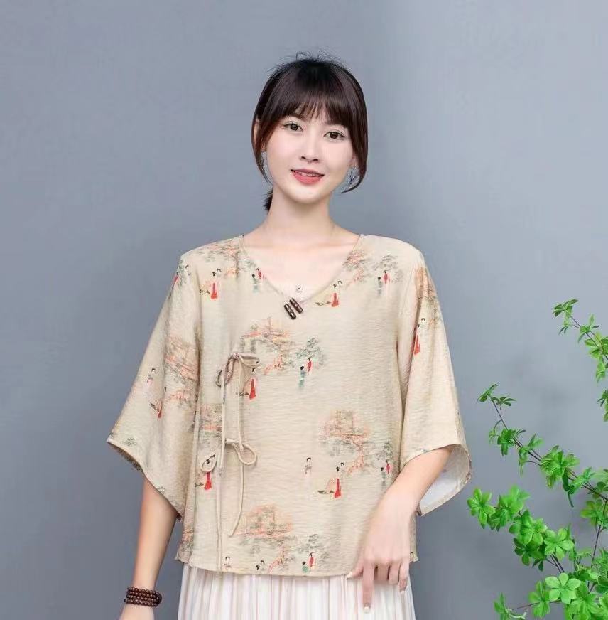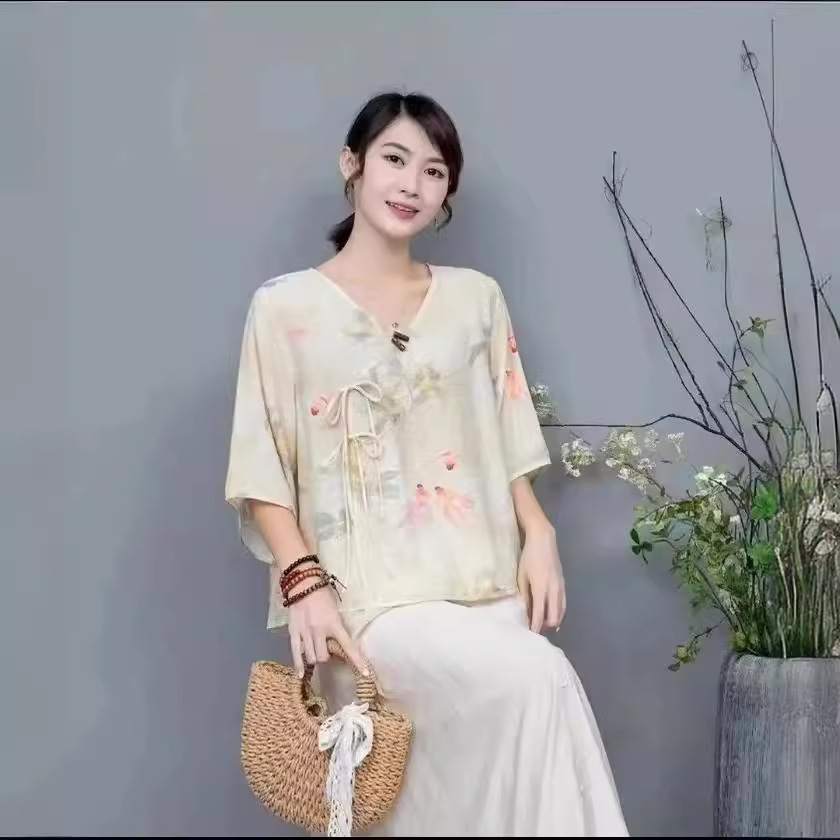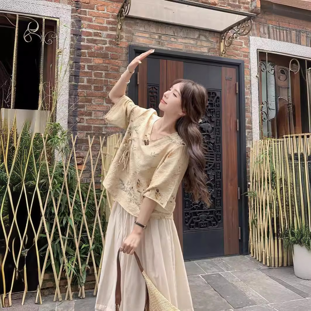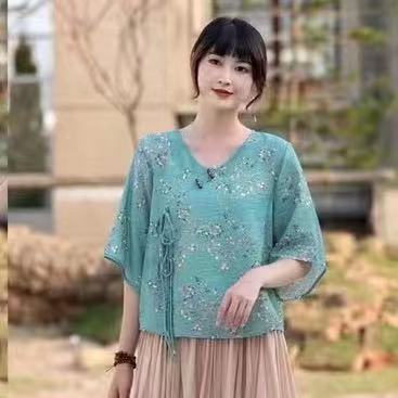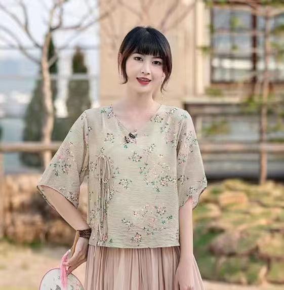 Костюм в этническом стиле, повседневный топ с V-образным вырезом, в китайском стиле, весенне-летняя вышивка, темперамент, шнуровка с коротким рукавом, женская одежда оптом