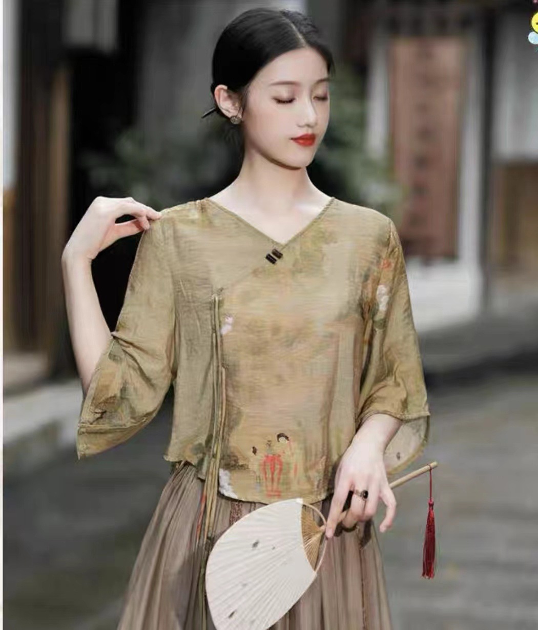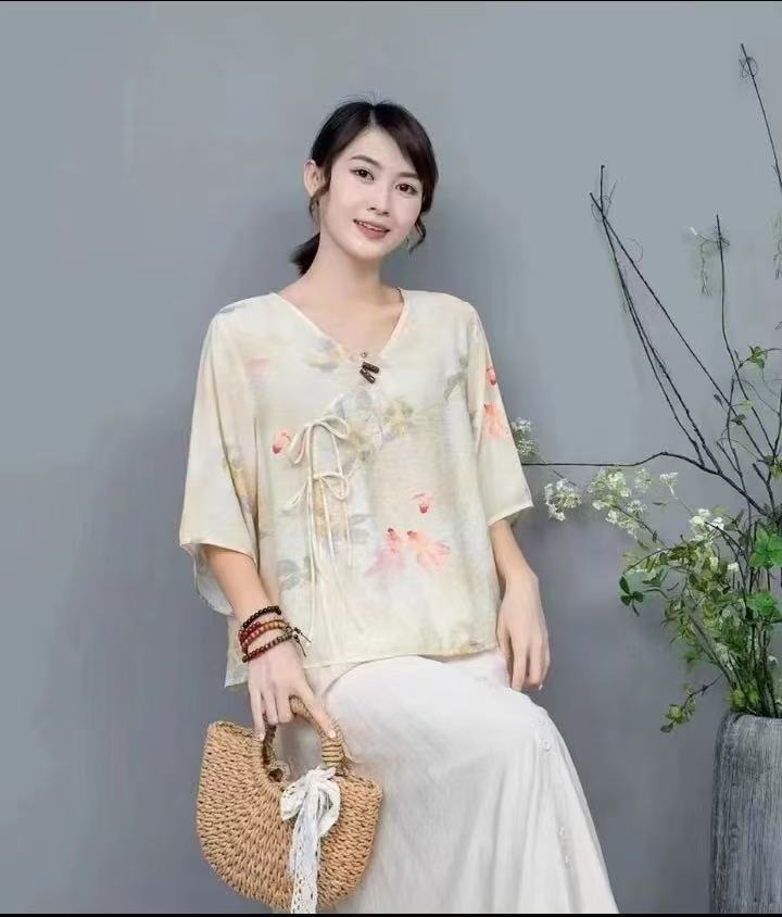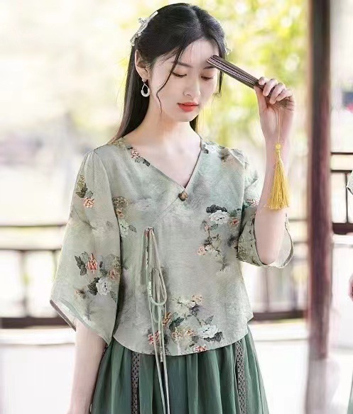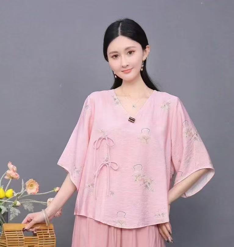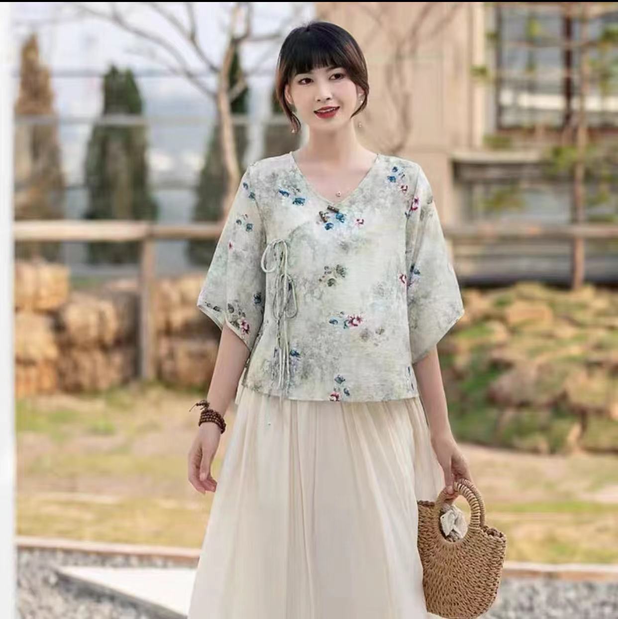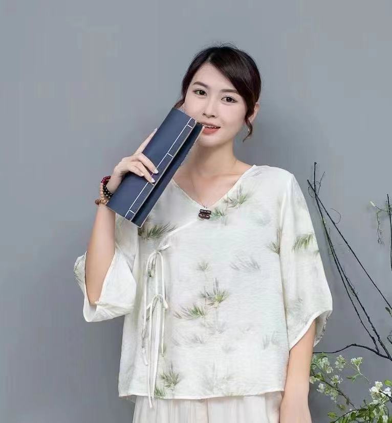 Костюм в этническом стиле, повседневный топ с V-образным вырезом, в китайском стиле, весенне-летняя вышивка, темперамент, шнуровка с коротким рукавом, женская одежда оптом