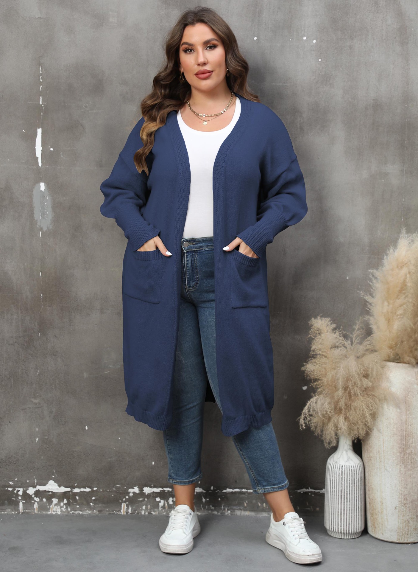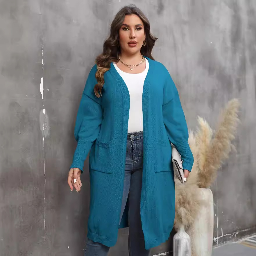 Женское пальто Трансграничный европейский и американский плюс размер Женский свободный тканый свитер средней длины с двойным карманом и рукавом-фонариком Кардиган