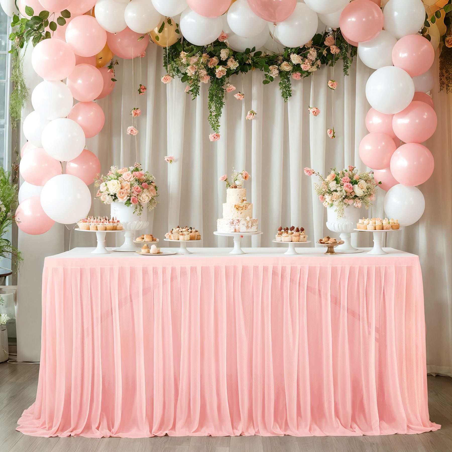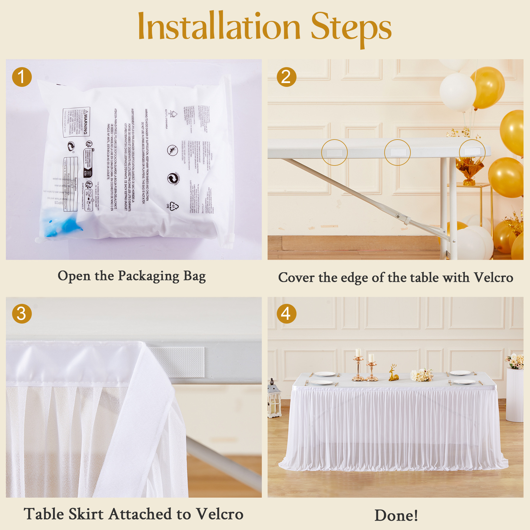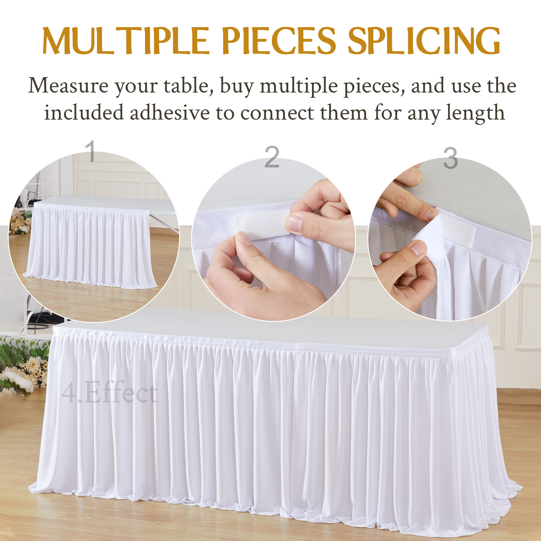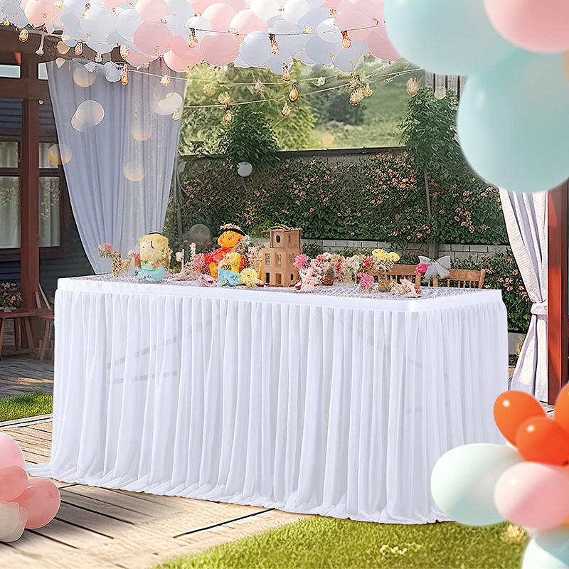- 场合:褶皱桌裙,非常适合贸易展会婚礼招待会、甜点蛋糕桌、自助餐桌、迎婴派对、生日派对、餐厅会议、餐桌、礼品桌,适合各种活动,从日常餐厅使用到高端公司活动,婚礼招待,甚至是贸易展!