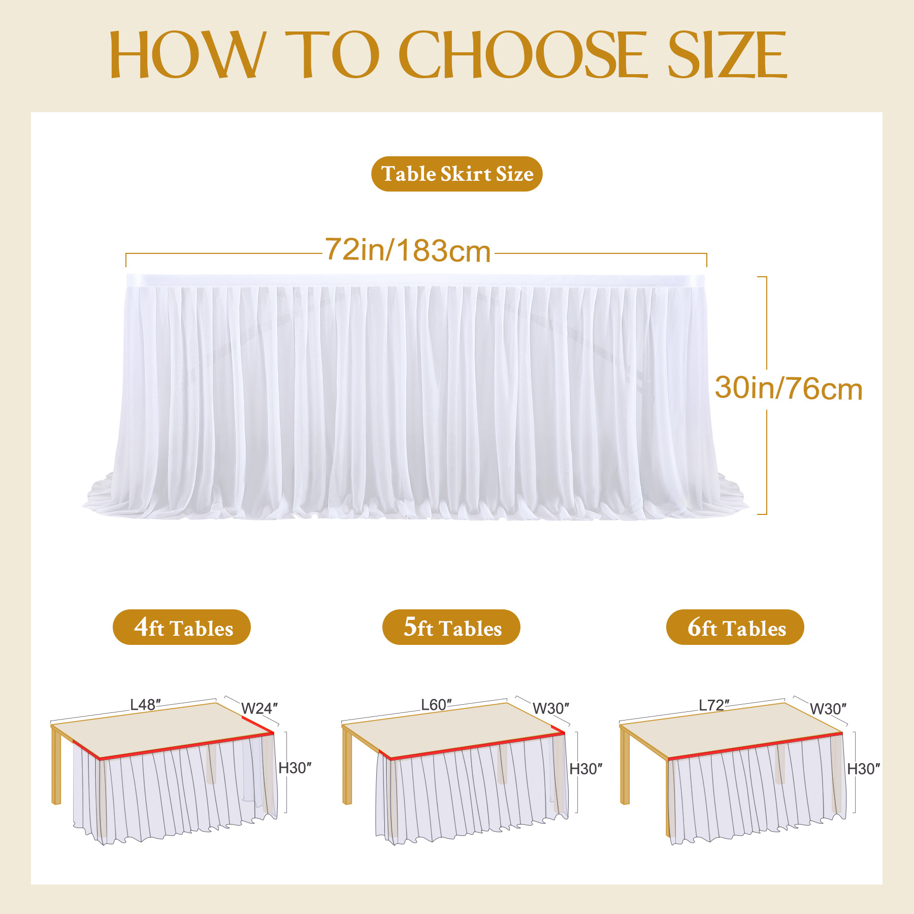 - 尺寸:多个尺寸选择,这是一款长方形桌子和圆桌都可以围的桌裙。请根据您的桌子尺寸以及您想覆盖桌子的侧面选择尺寸。 (6 英尺的桌裙1.83米只能围在 6 英尺的桌子一面长。)也可根据您的需求定制尺寸!联系客服就行!