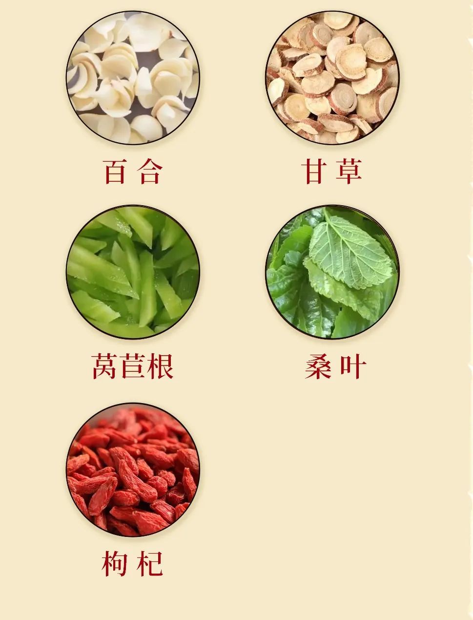 Пория кокосовая, корень одуванчика, боярышник, апельсиновая цедра, лилия, солодка, корень салата, листья шелковицы, сок ягод годжи