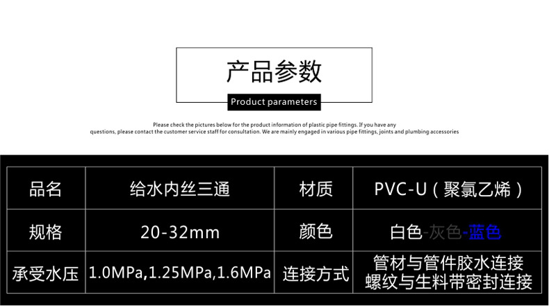 Белый тройник с внутренним проводом 20*1/2 (700/коробка); Серый 20*1/2 водопроводный внутренний Тройник (700 шт./Кор.); Синий 20*1/2 Воды Внутренний провод Тройник (700/коробка); Белый 25*1/2 сокращение водоснабжения Внутренний провод Тройник (500/коробка); Серый 25*1/2 уменьшение водоснабжения Внутренний провод Тройник (500/коробка); Синий 25*1/2, уменьшающий внутренний тройник провода подачи воды (500 шт./Кор.); Белый тройник провода водоснабжения 25*3/4 внутренний (450/бокс); Серая резьба водоснабжения 25*3/4 (450/коробка); Синий 25*3/4 водопроводный внутренний Тройник (450 шт./Кор.); Белый 32*1/2 уменьшая внутренний провод подачи воды тройник (350 PCs/box); Серый 32*1/2 уменьшая тройник внутреннего провода подачи воды (350 PCs/box); Синий 32*1/2 уменьшение подачи воды Внутренний провод Тройник (350/коробка); Белый 32*3/4 уменьшающий тройник с внутренним проводом подачи воды (300 шт./Кор.); Серый 32*3/4 уменьшая тройник провода подачи воды внутренний (300/коробка); Синий 32*3/4 сокращение водоснабжения Внутренний провод Тройник (300/коробка); Белый тройник провода водоснабжения редуктора 32*1 инч внутренний (240/бокс); Серый 32*1-дюймовый редуктор с внутренним проводом для водоснабжения (240 шт./Кор.); Синий 32*1 дюймовый редуктор с внутренним проводом для водоснабжения (240/коробка)