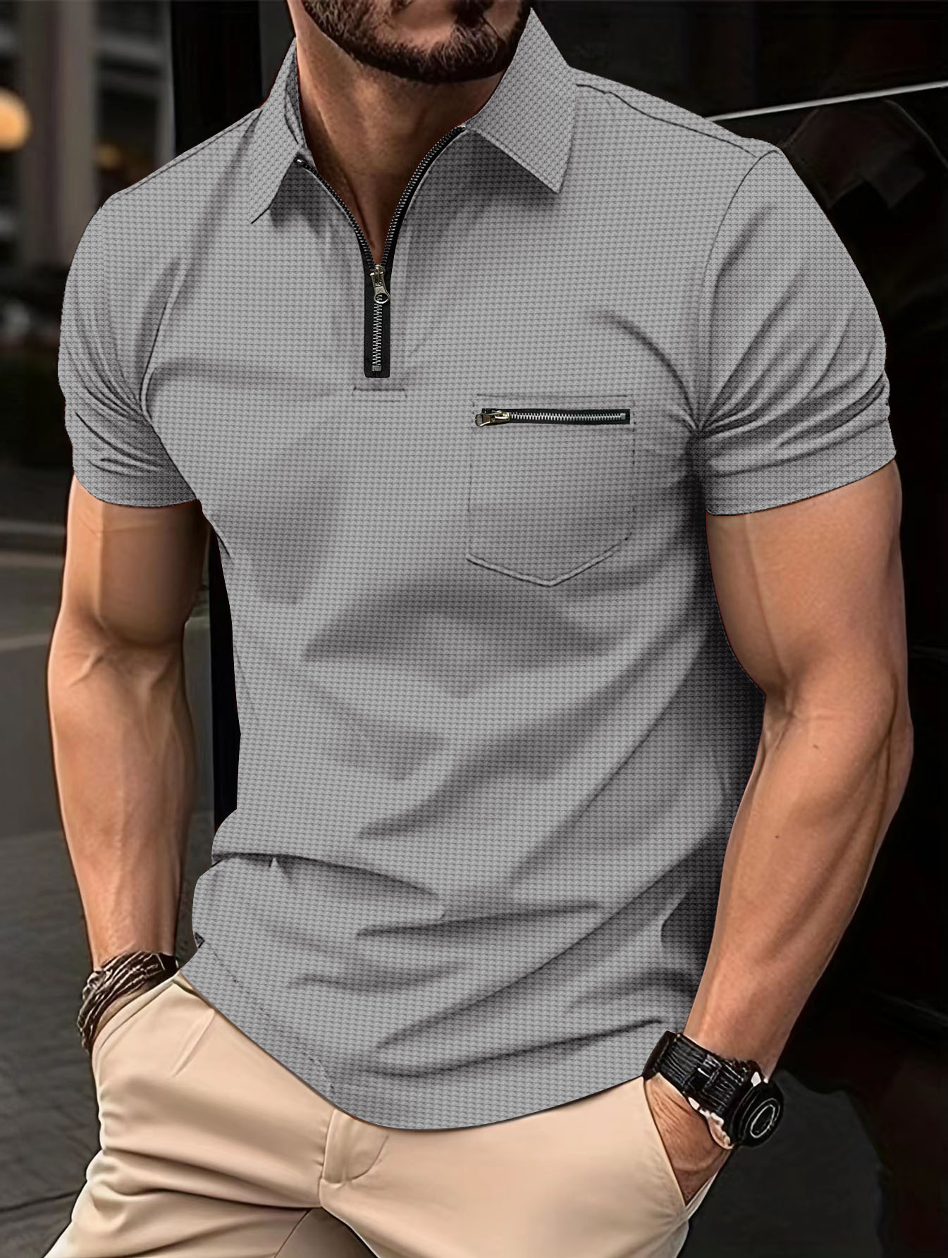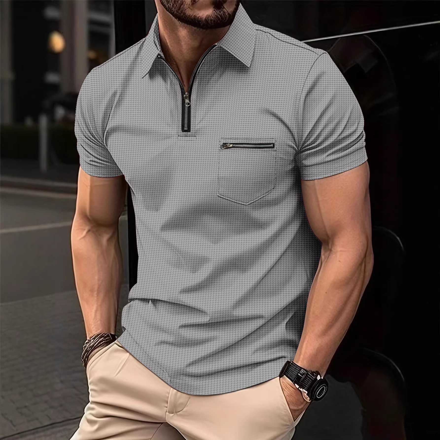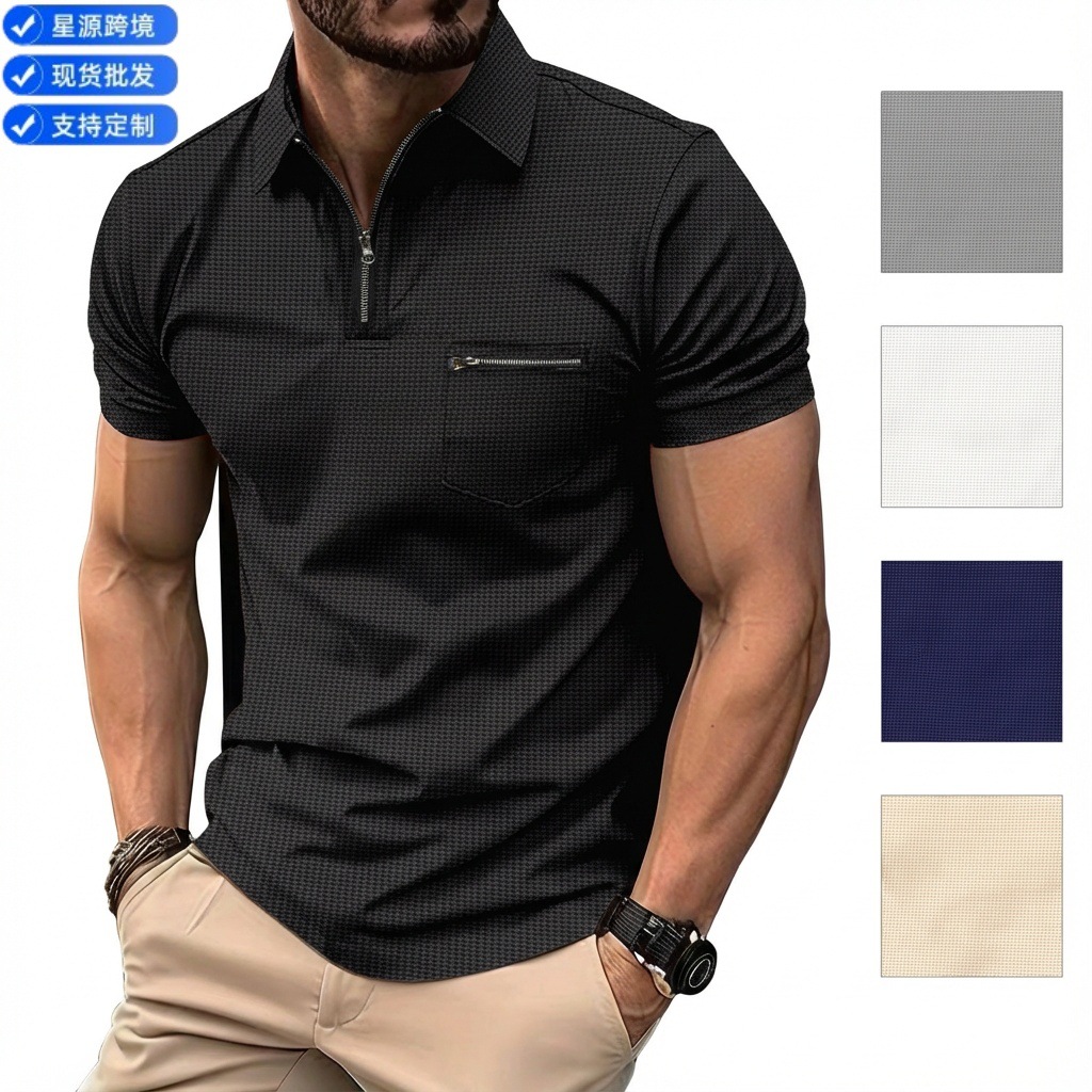 Мужская поло-футболка с коротким рукавом, вафельной вязки, с карманом и отложным воротником, для спорта, летняя коллекция 2023 года, Amazon, для международной торговли