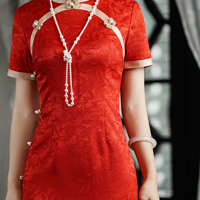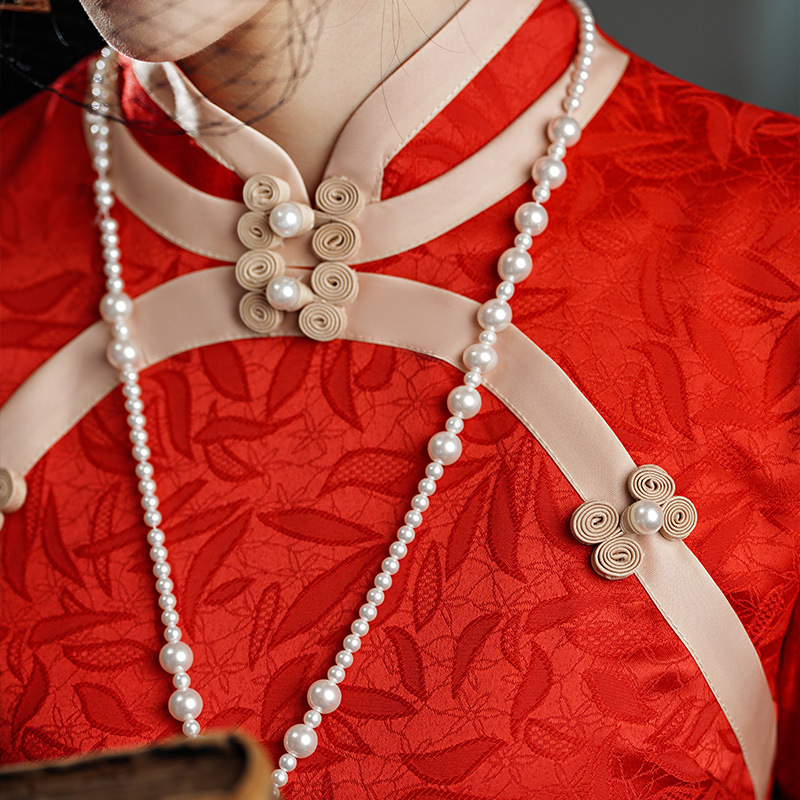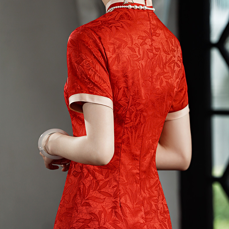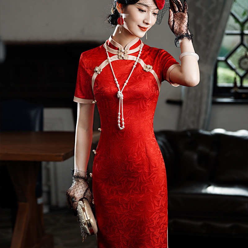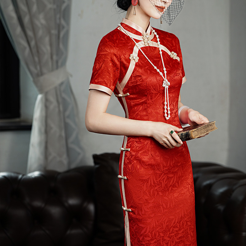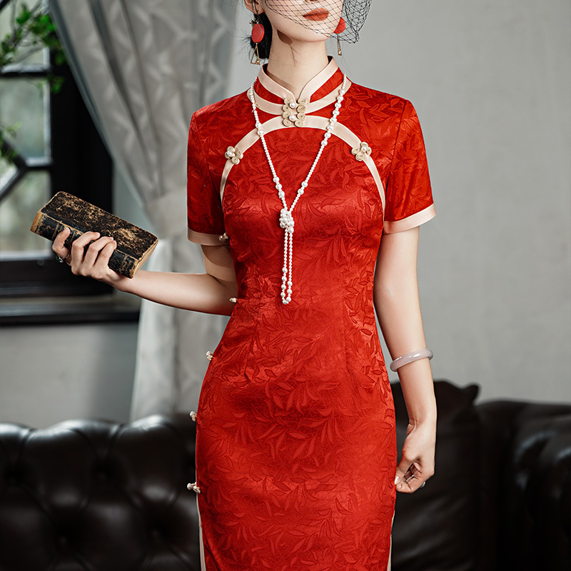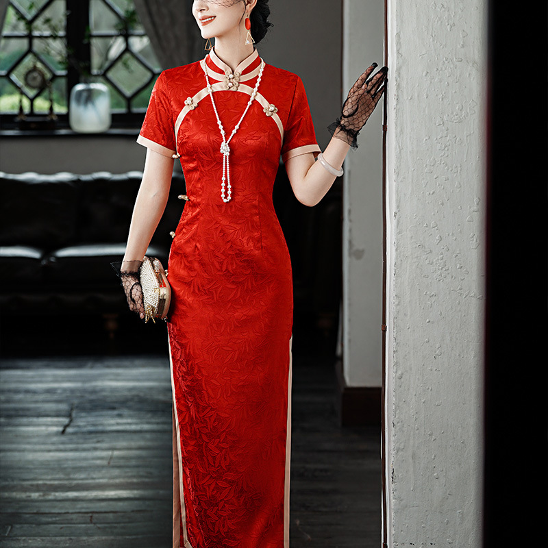 Лето 2023 Новое двустороннее жаккардовое атласное платье-Ципао с рукавами в трех точках, длинное модифицированное боковое двухслойное платье-Ципао с восемью пуговицами