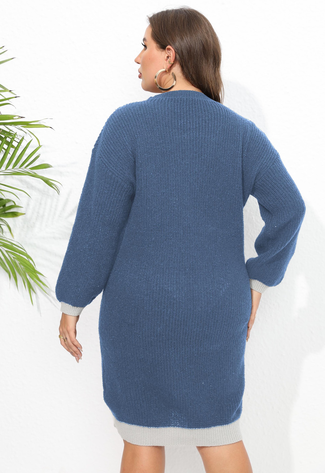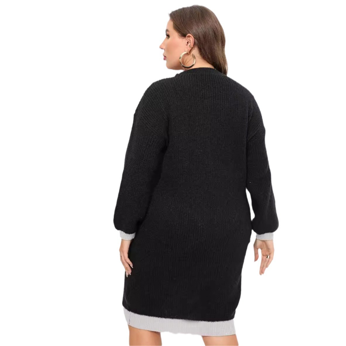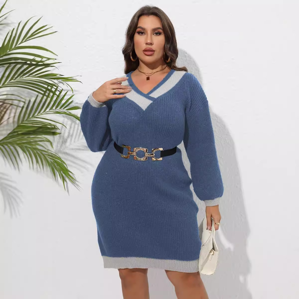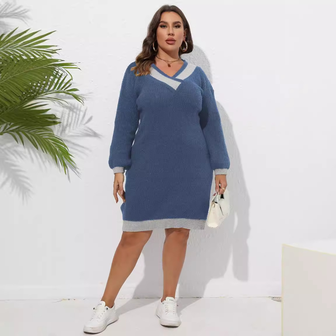 Женское платье Трансграничные европейские и американские большие размеры Женский тканый свитер V-образным вырезом Контрастная строчка хип-свитер платье 622