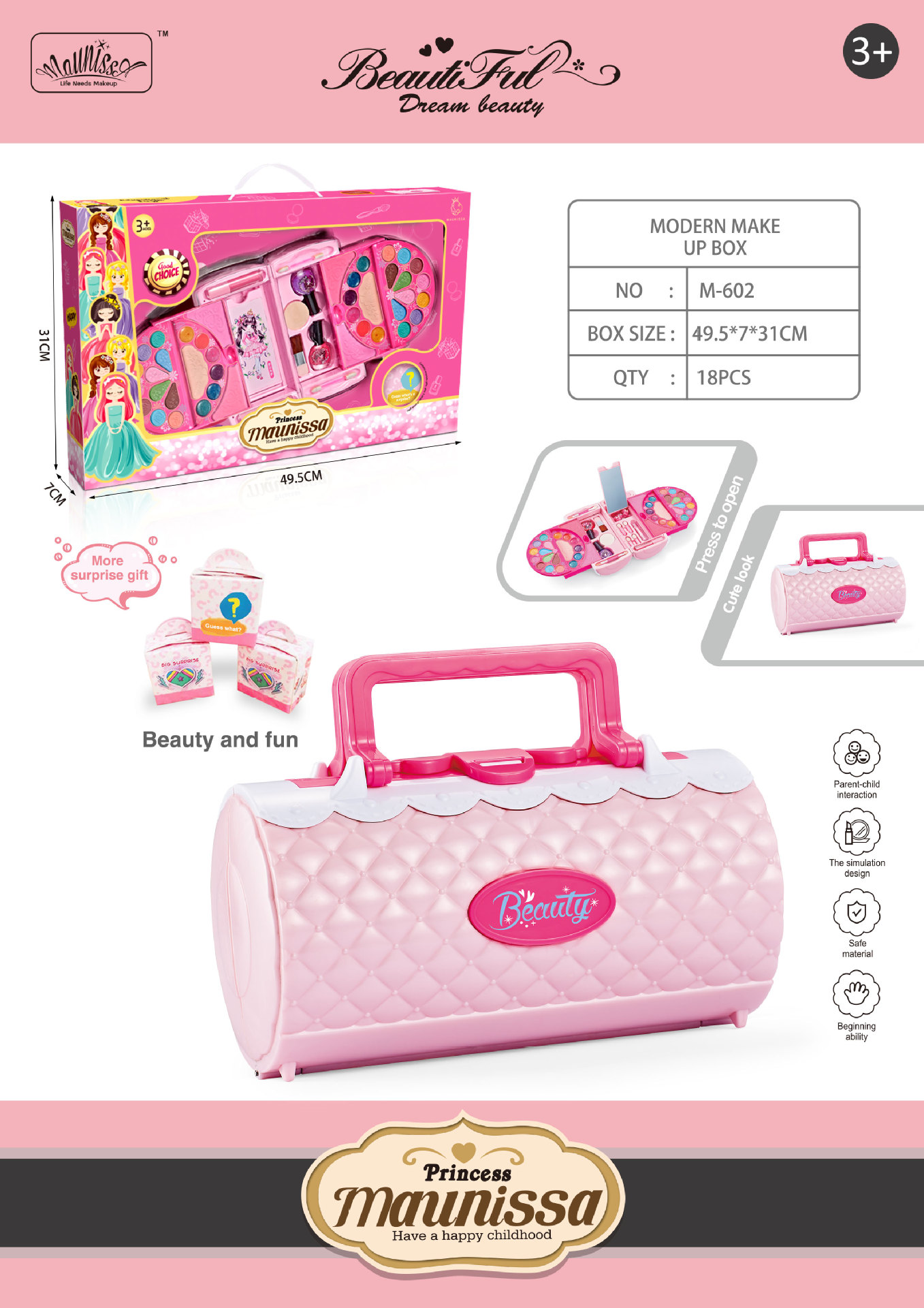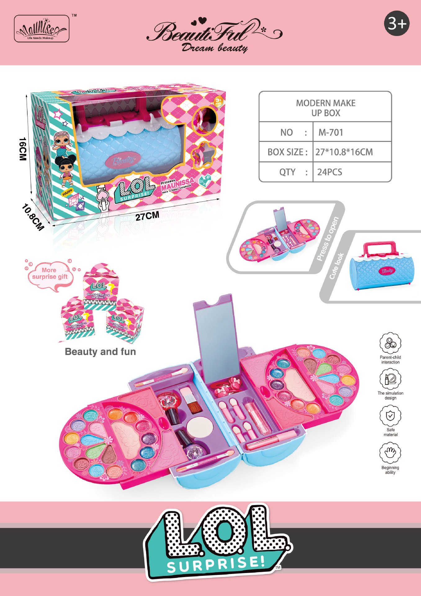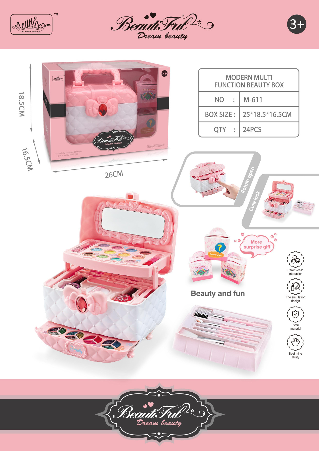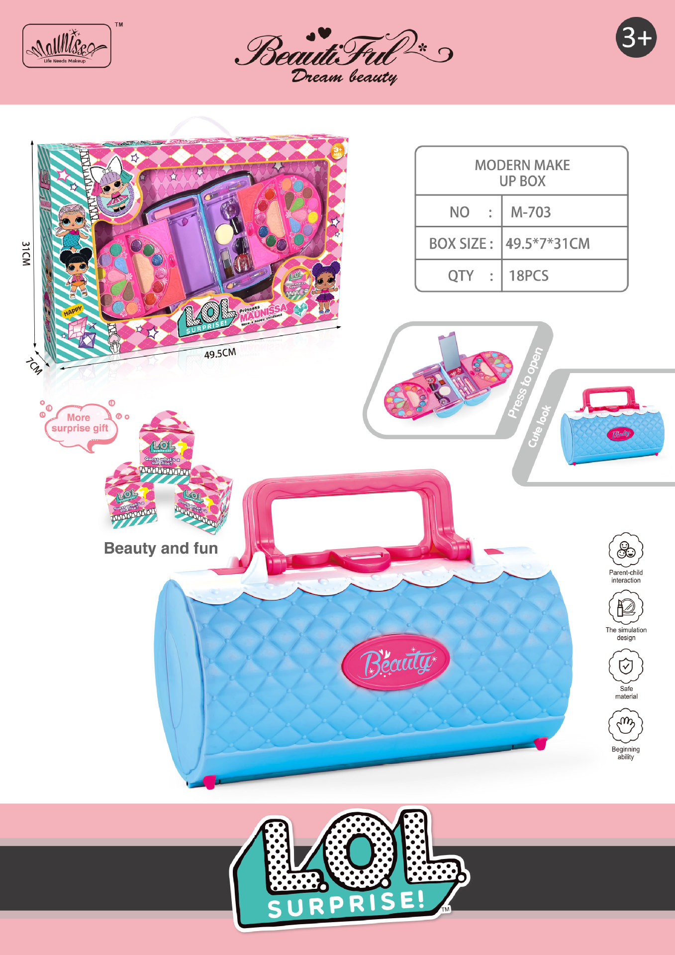 710 портативная косметичка; 601 Современный чемодан для макияжа; 602 Современный чемодан для макияжа (демонстрационный набор); 611 многофункциональный чемодан для макияжа; 617 многофункциональный чемодан для макияжа (дисплей); 623 многофункциональный чемодан для макияжа; 624 Современный чемодан для макияжа; 626 Современный чемодан для макияжа; 633 Косметика Косметический чемодан с сокровищами; 701 Современный чемодан для макияжа (голубой); Современный чемодан для макияжа 703 (розово-синий демонстрационный набор); Чемодан для макияжа Сяо Кер; Чемодан для макияжа Xiaomi; Косметический чемодан для макияжа котенка