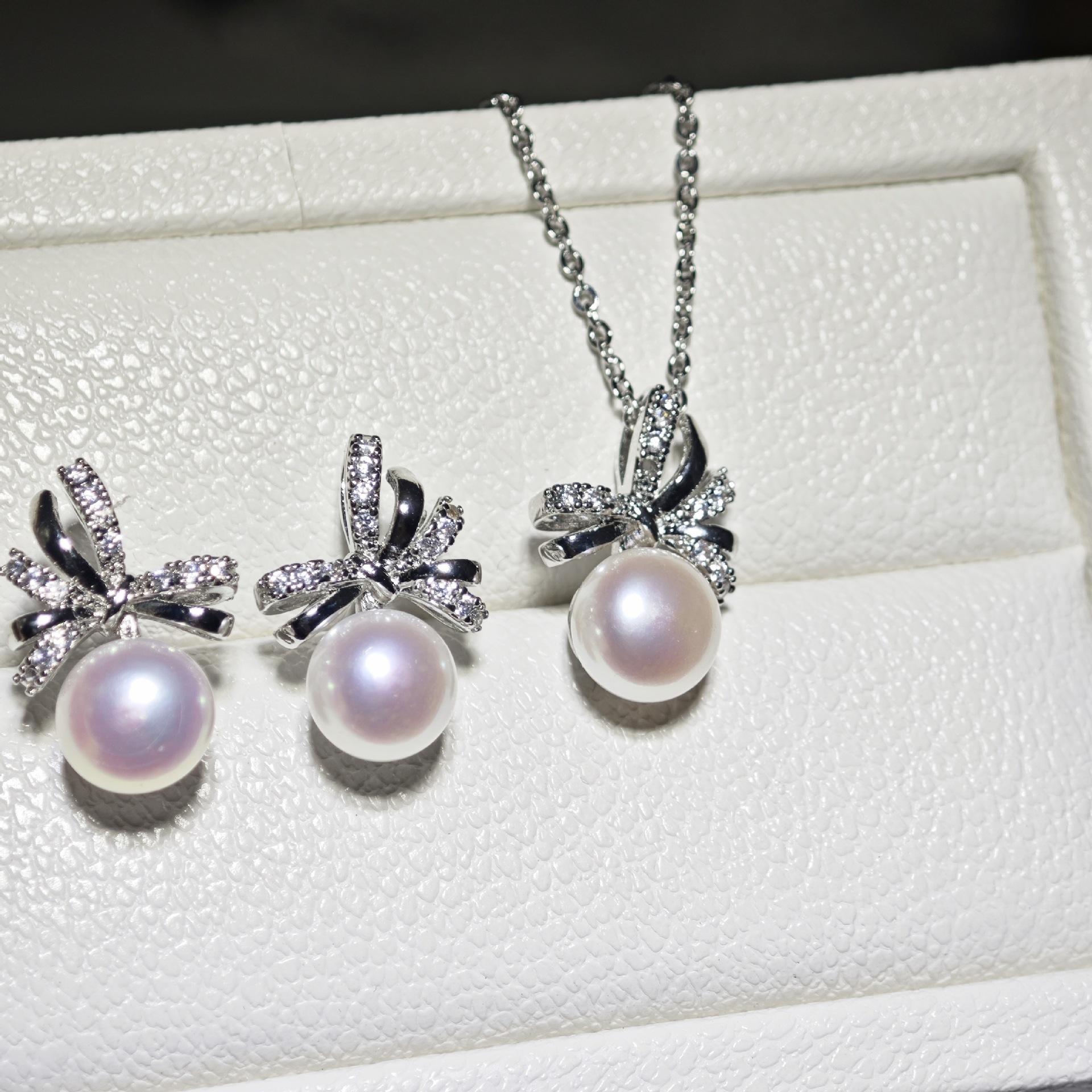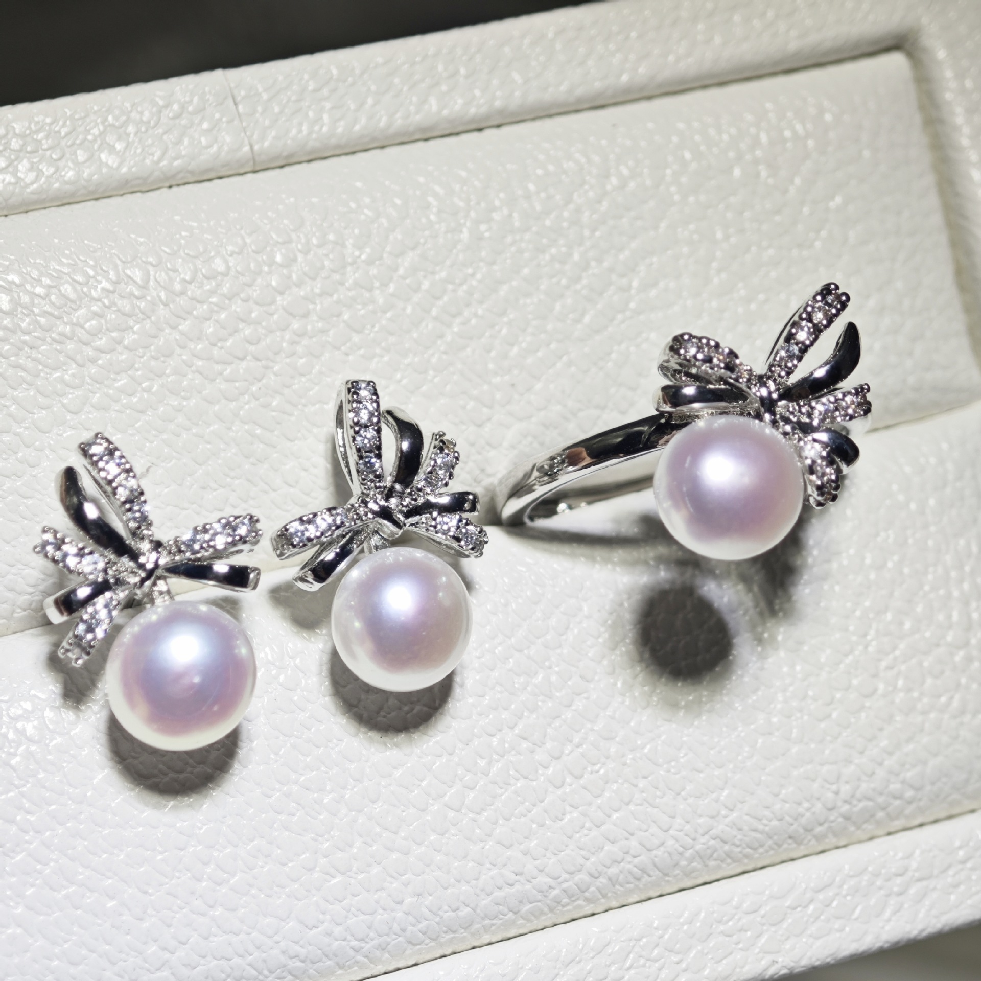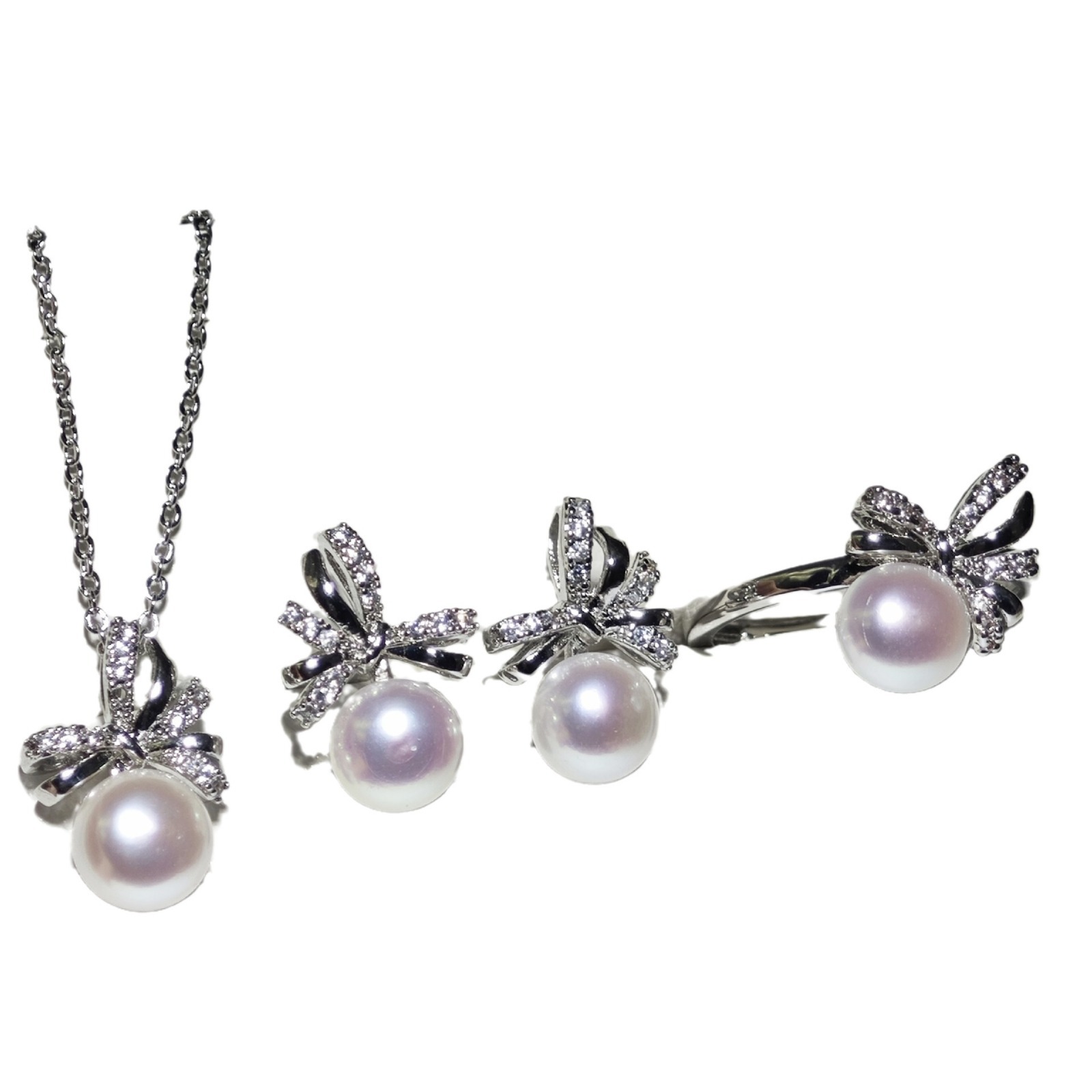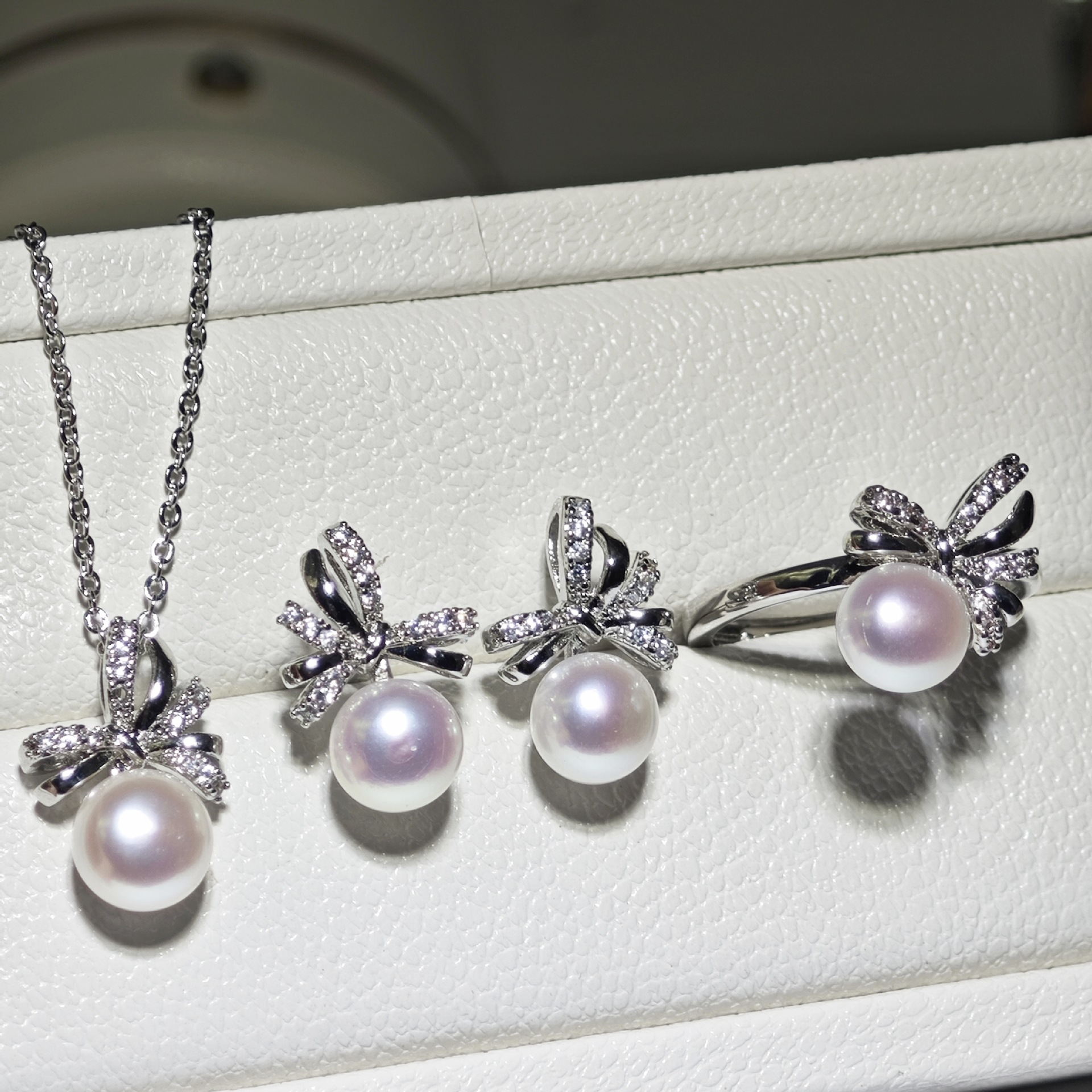 Жемчужные серьги Zhuji с серебряными штифтами S925, бренд M, в том же стиле, что и у Реба, серьги-бантики, кулон и кольцо — комплект украшений из трех предметов.