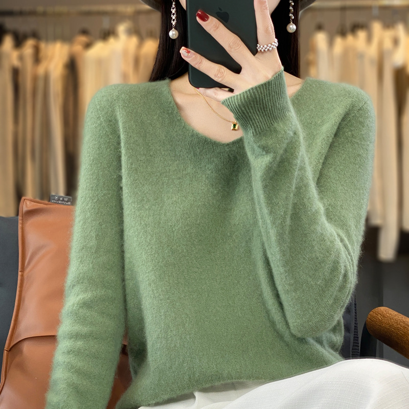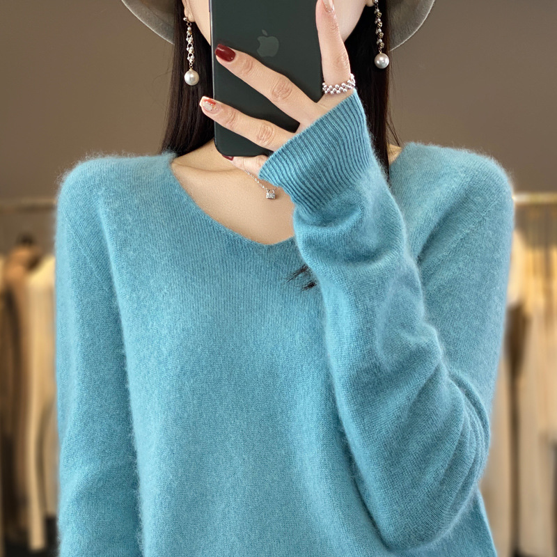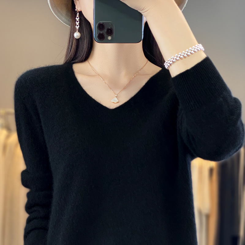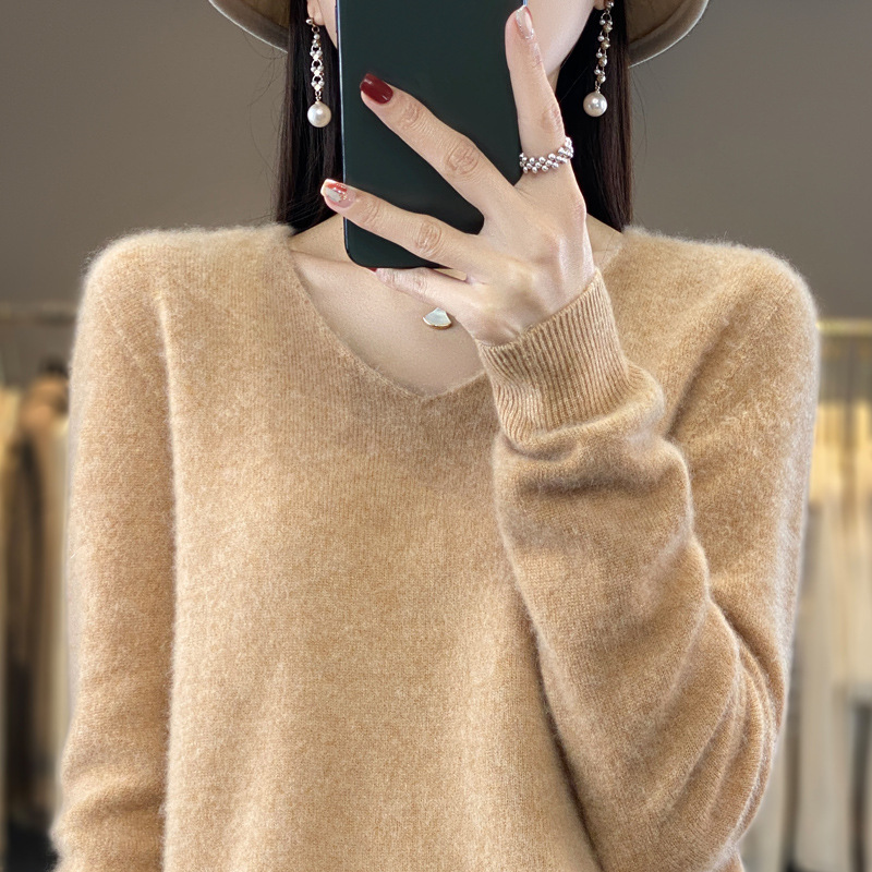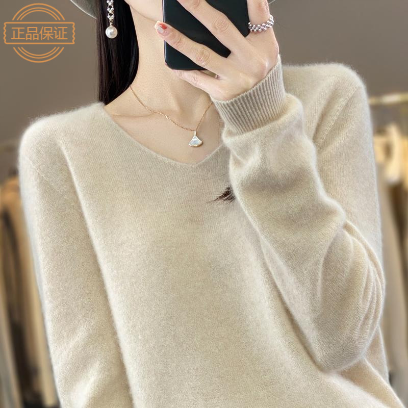 Первая линия одежды 100 чистый шерстяной вязаный свитер женский V-образный пуловер свободный нижний свитер осень зима новый сплошной свитер