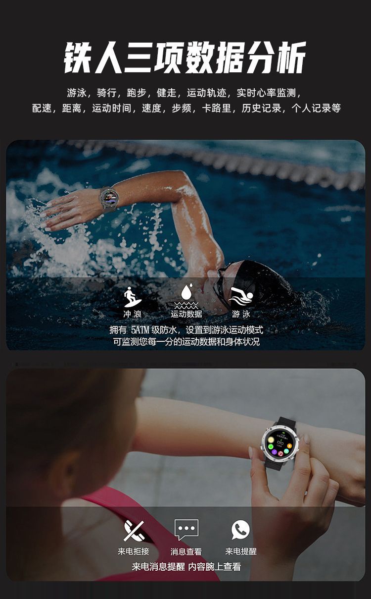 3. 专业运动数据分析:跑步、自行车、登山、铁人三项,浮潜、游泳、钓鱼、指南针、天气预报、动态心率、血氧,海拔高度,气压,最佳个人记录、历史数据存储等。