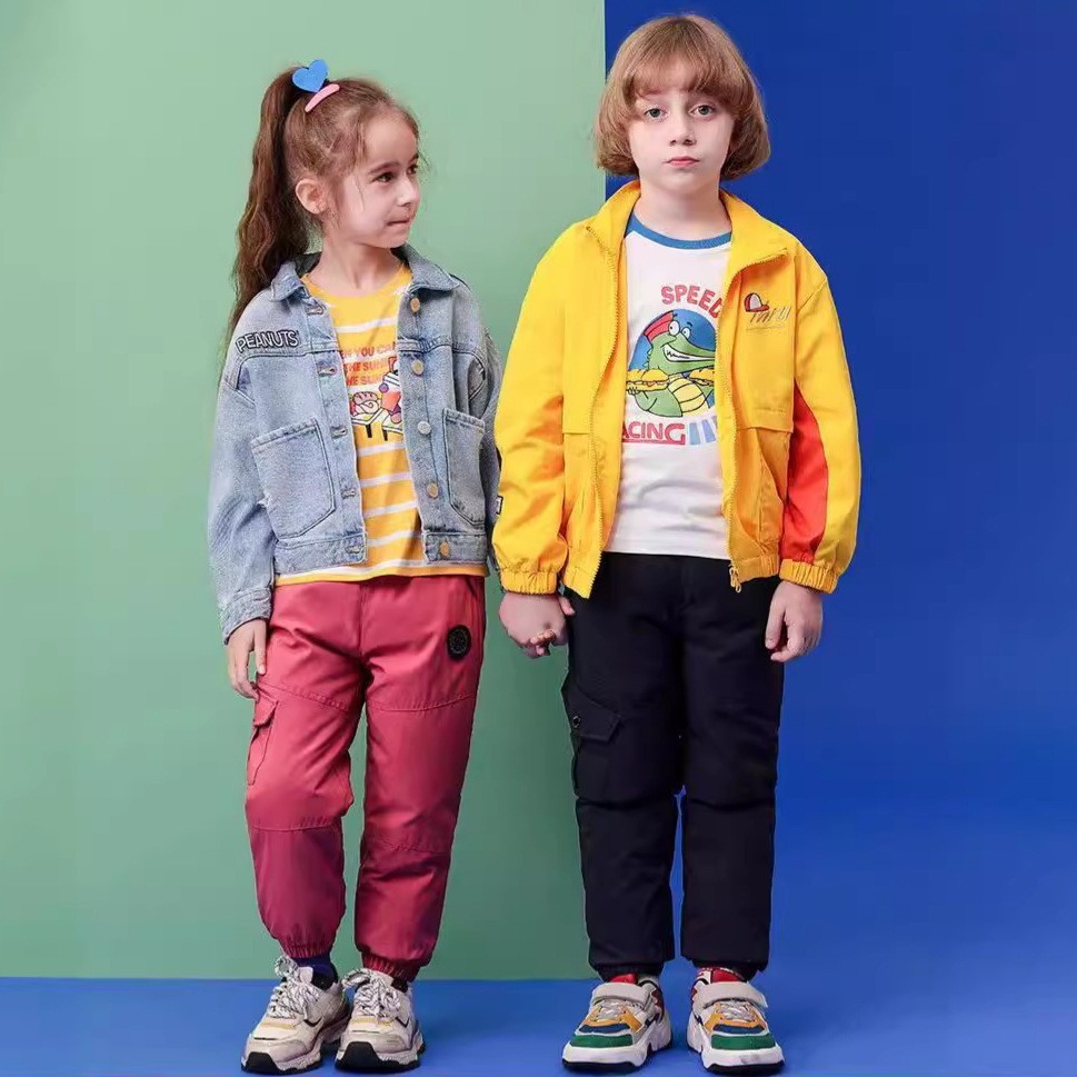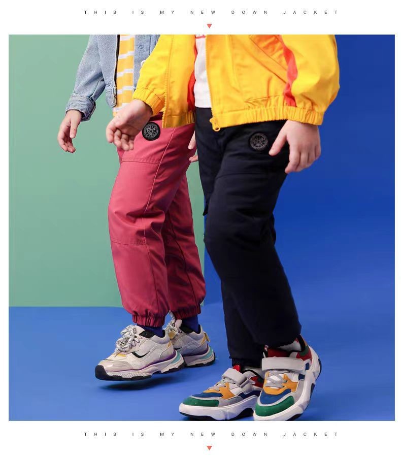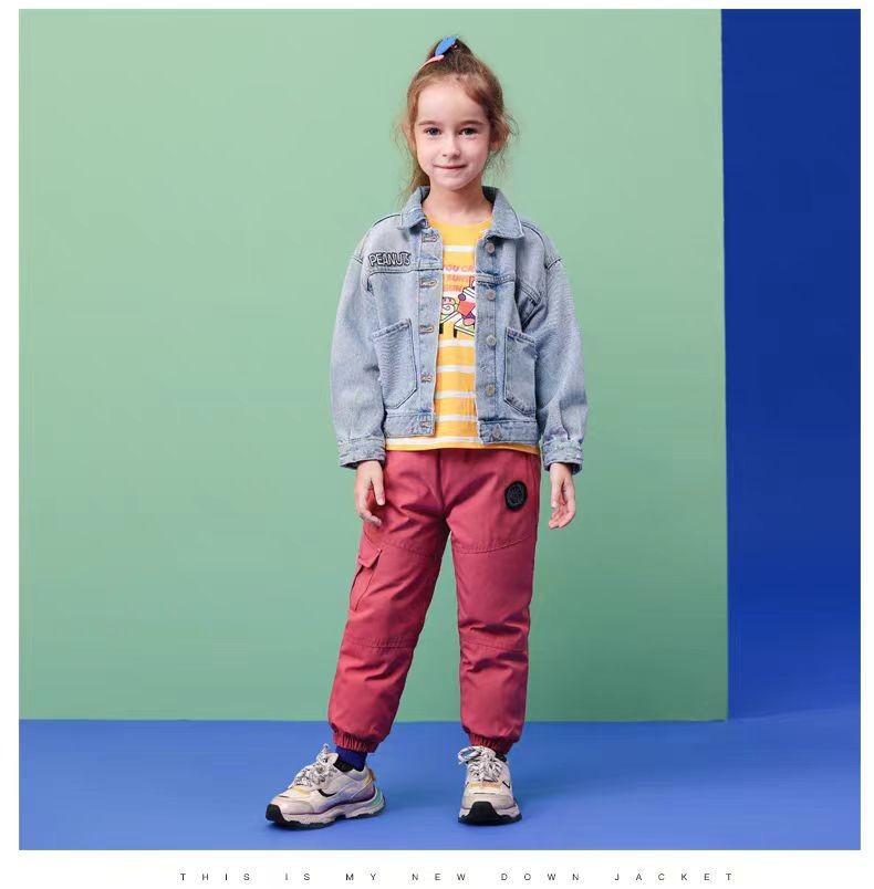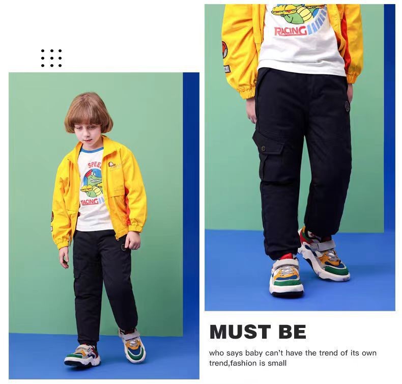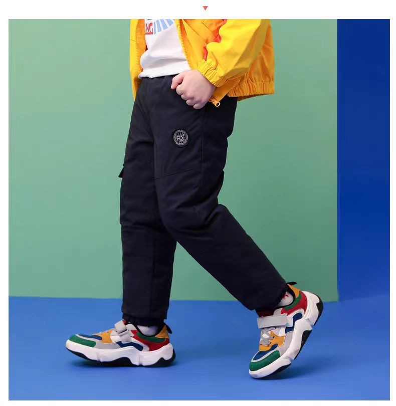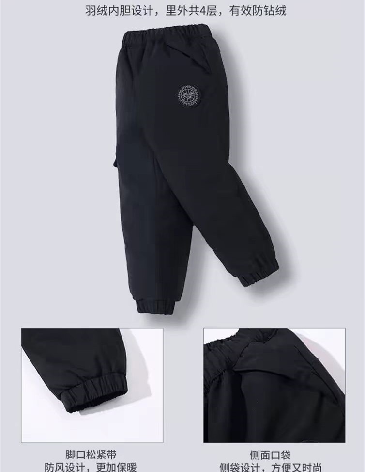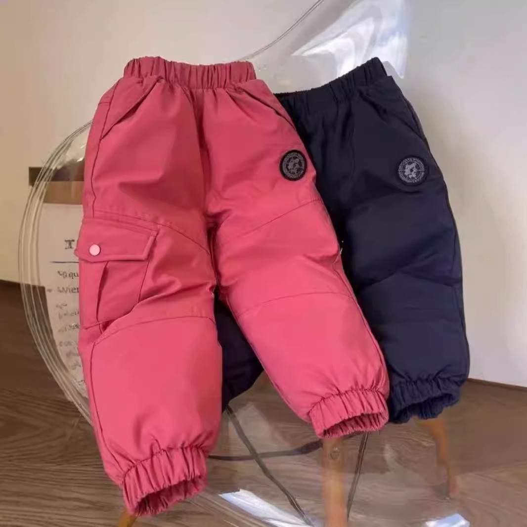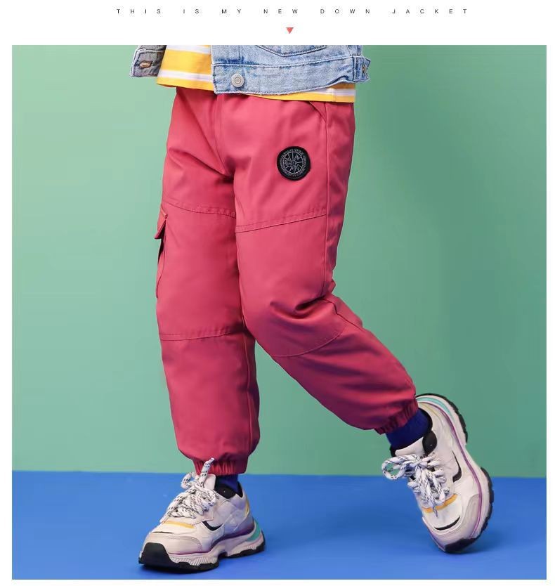 Детские перья шелковые брюки комбинезоны зимний новый ребенок ребенок мальчик толстый и теплый, чтобы носить длинные брюки
