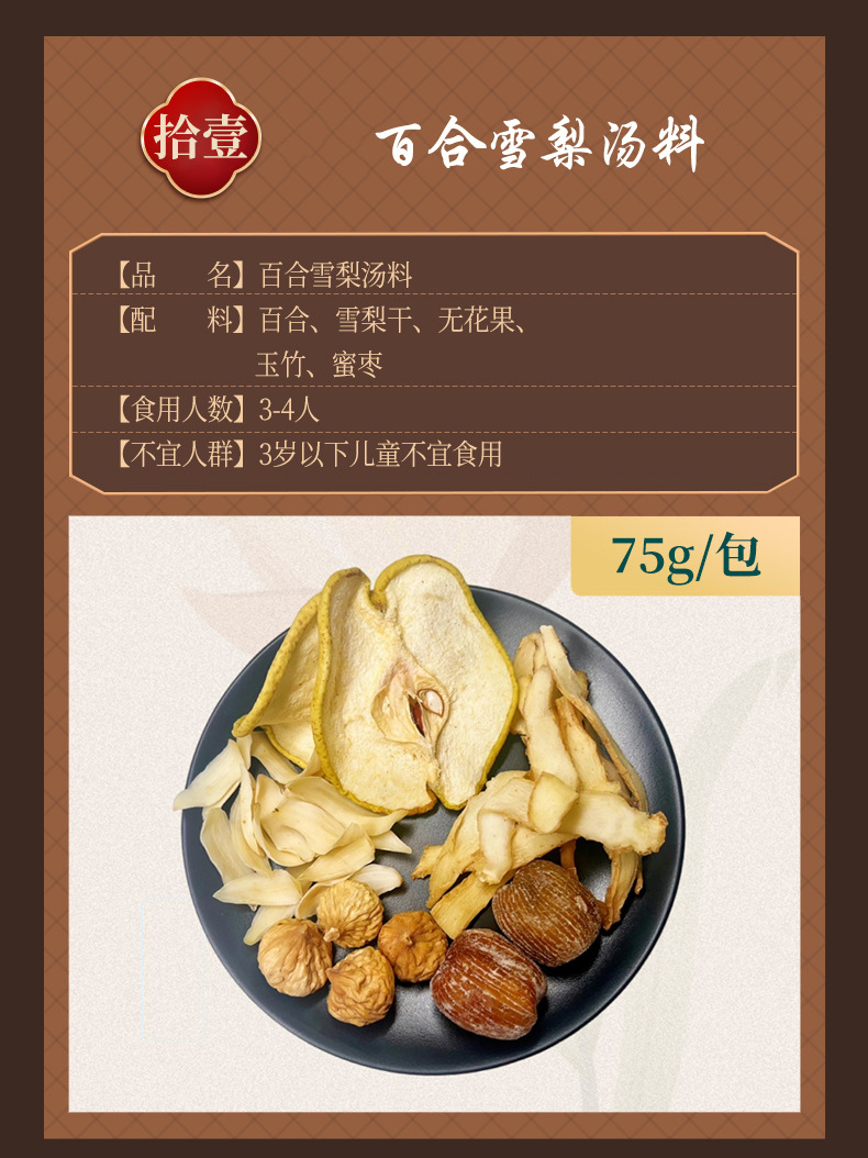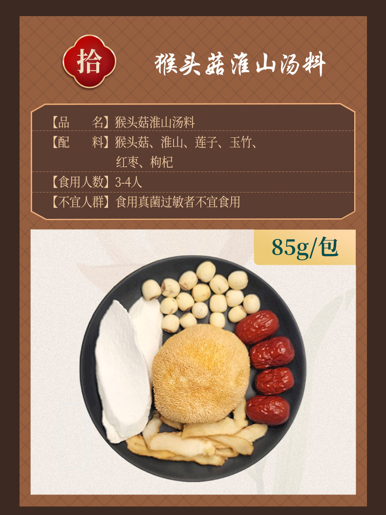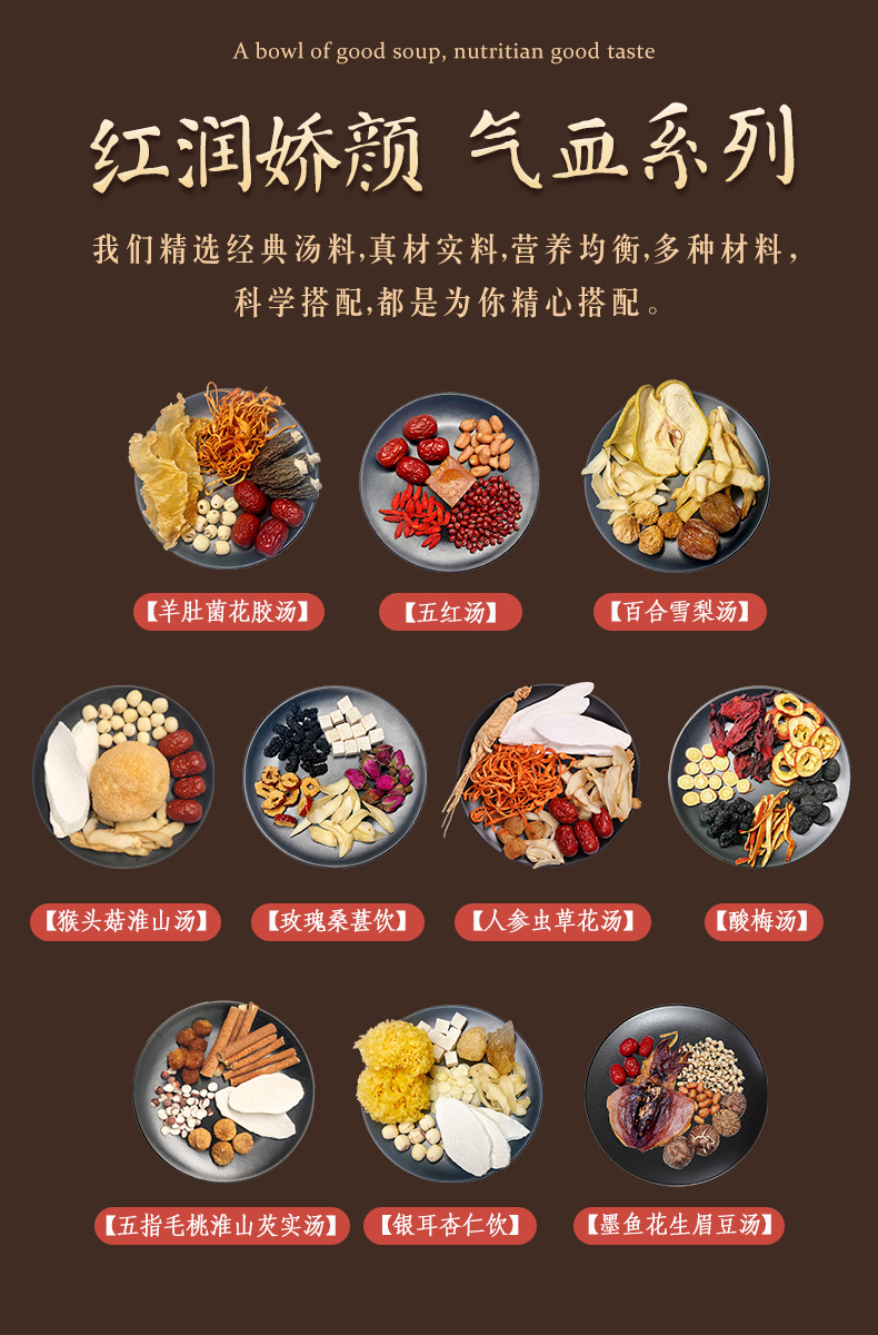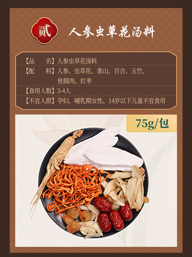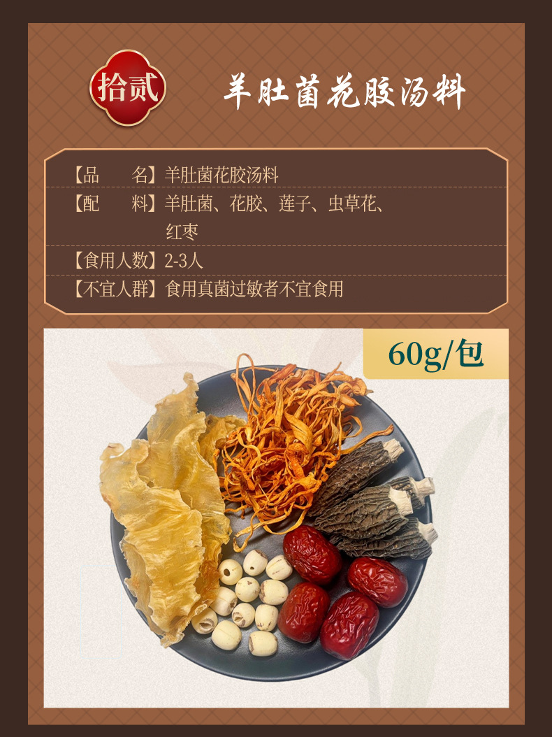 Сморчок из цветочного супа 28g; Пять красных супов 36 г; Лили Сидней Суп 35 г; Обезьяна гриб Huaishan суп 38 г; Розовая шелковица напиток 25 г; Женьшень Кордицепс суп 40 г; Пять пальцев Maotao Huaishan Zhishi Суп 25 г; Тремелла миндальный напиток 30 г; Кислый суп из сливы 15 г; Суп из арахиса и бобов из каракатицы 42 г; Суп из сморчьего цветка 60 г; Пять красных супов 80 г; Лили Сидней Суп 75 г; Обезьяна гриб Huaishan суп 85 г; Розовая шелковица напиток 50 г; Женьшень Кордицепс суп 75 г; Пять пальцев Maotao Huaishan Zhishi Суп 80 г; Тремелла миндальный напиток 100 г; Кислый суп из сливы 60 г; Суп из арахиса и бобов из каракатицы 90 г