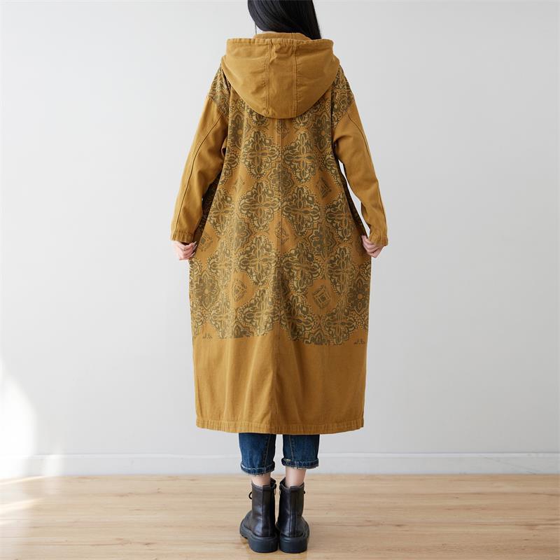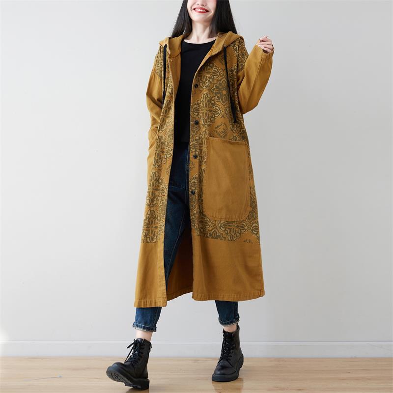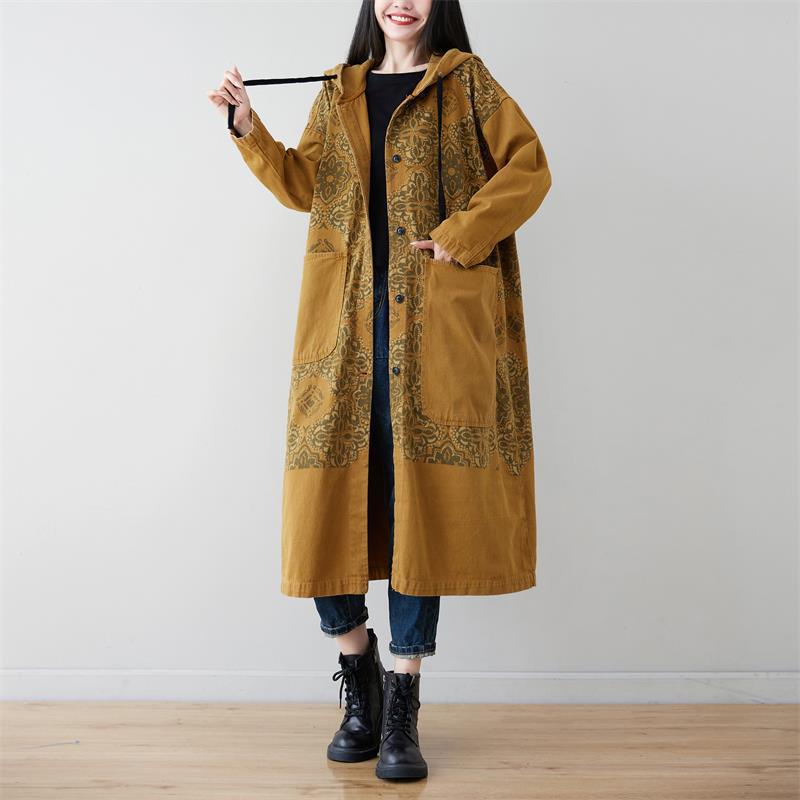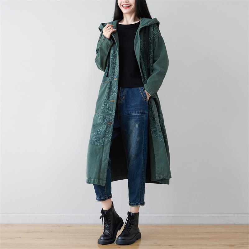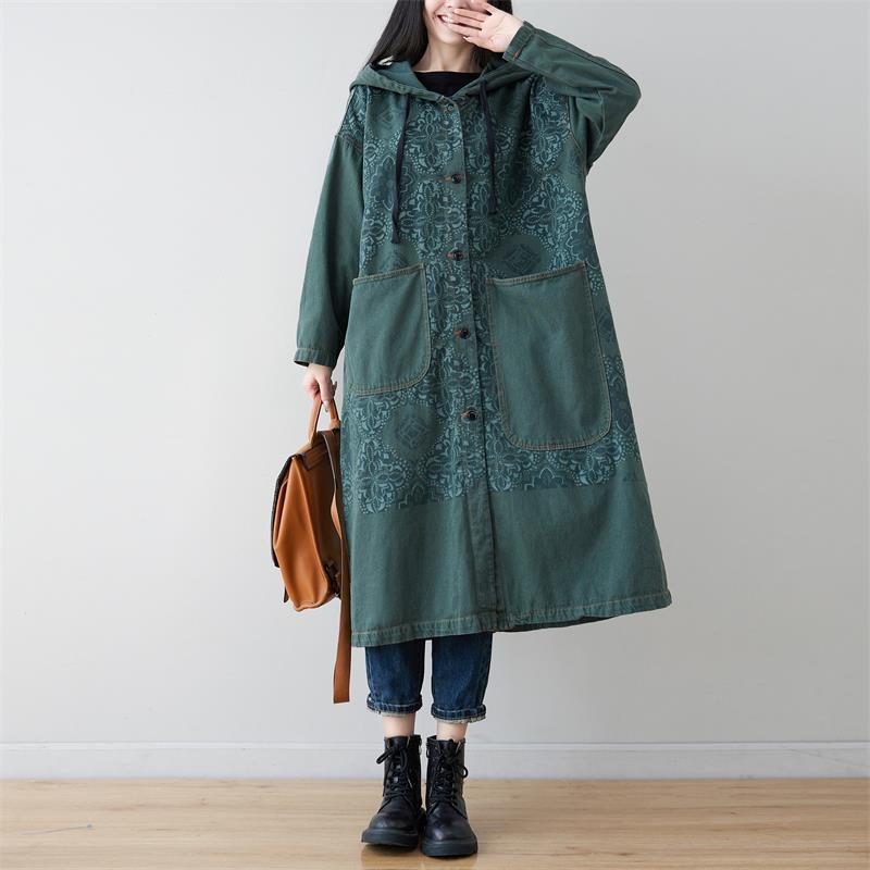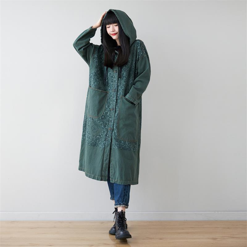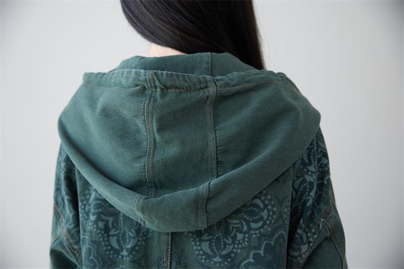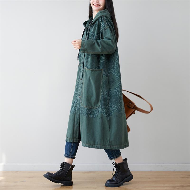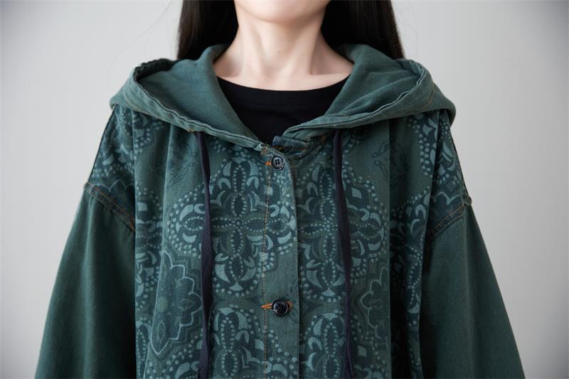 Длинная джинсовая куртка-кардиган с капюшоном, свободного кроя, больших размеров, с ромбовидным цветочным принтом, 2025 Wandering Story Literary Female.