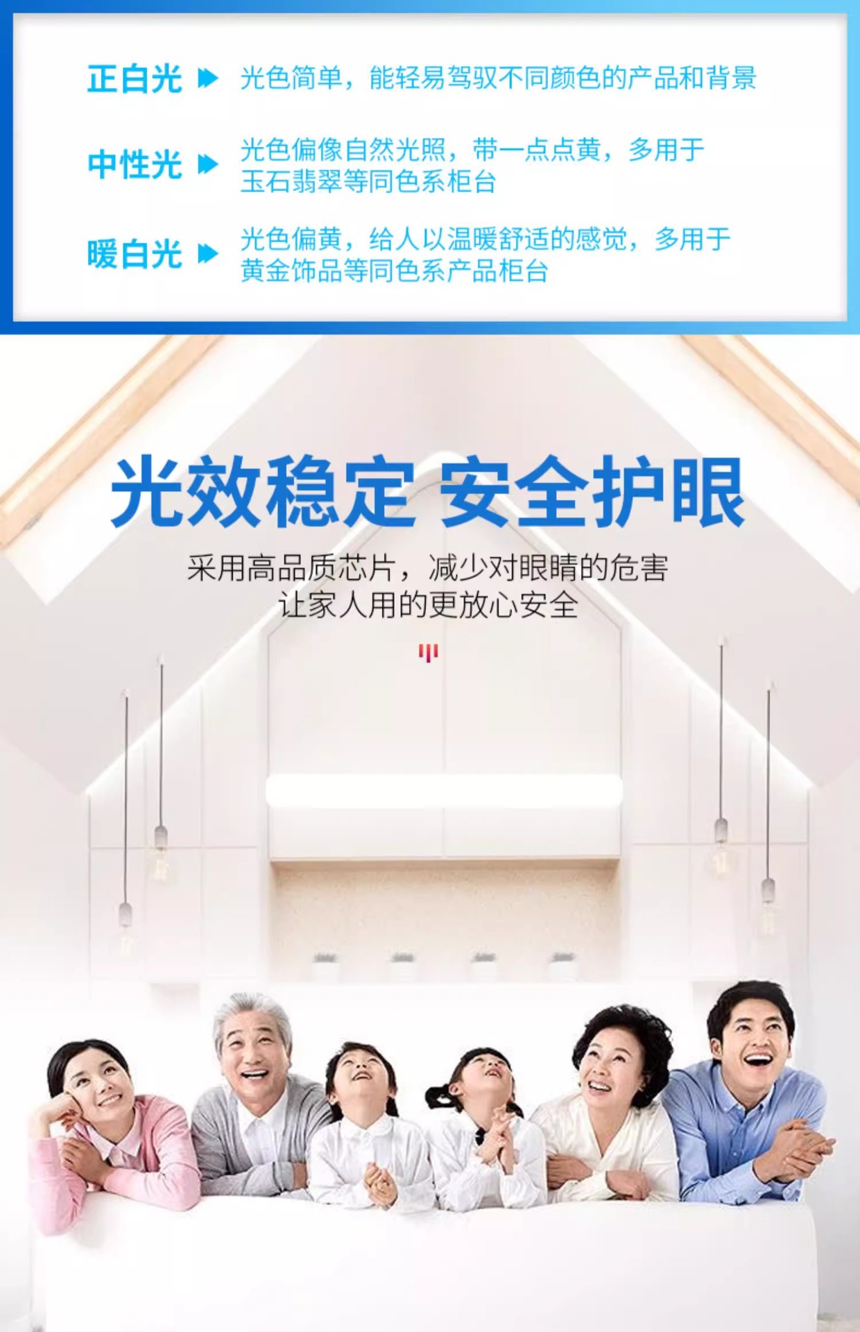 6000K/белый свет; 4000K/нейтральный свет; 3000K теплый свет