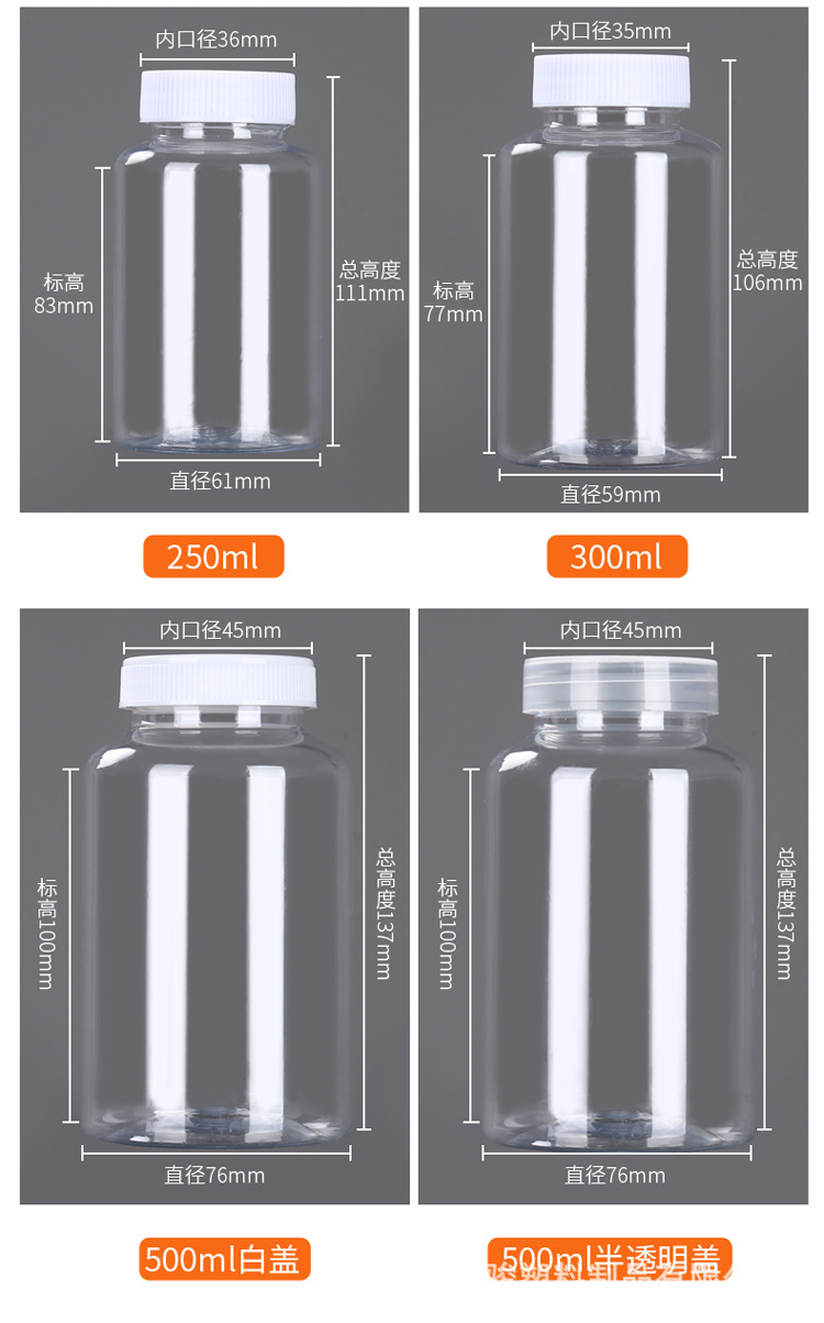 15 мл; 20 мл; 30 мл; 30 мл со шкалой (24 крышки); 30 мл квадрат; 30 мл коричневый со шкалой (24 крышки); 50 мл; 50 мл квадрат; 80 мл; 80 мл Площадь; 100 мл; 100 мл Квадрат; 150 мл; 200 мл; 250 мл; 300 мл; 500 мл белая крышка; 500 мл прозрачная крышка