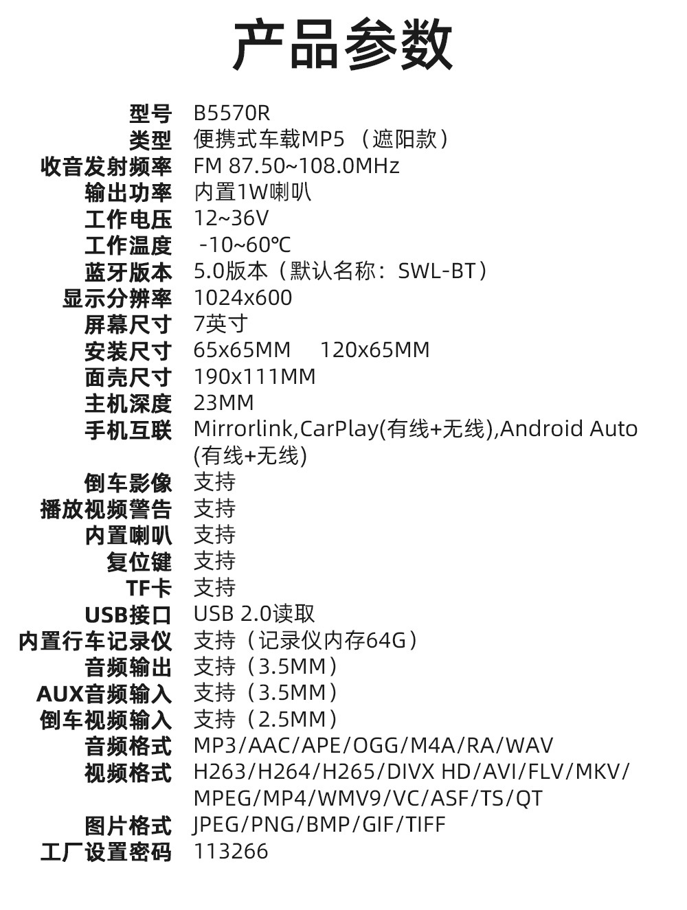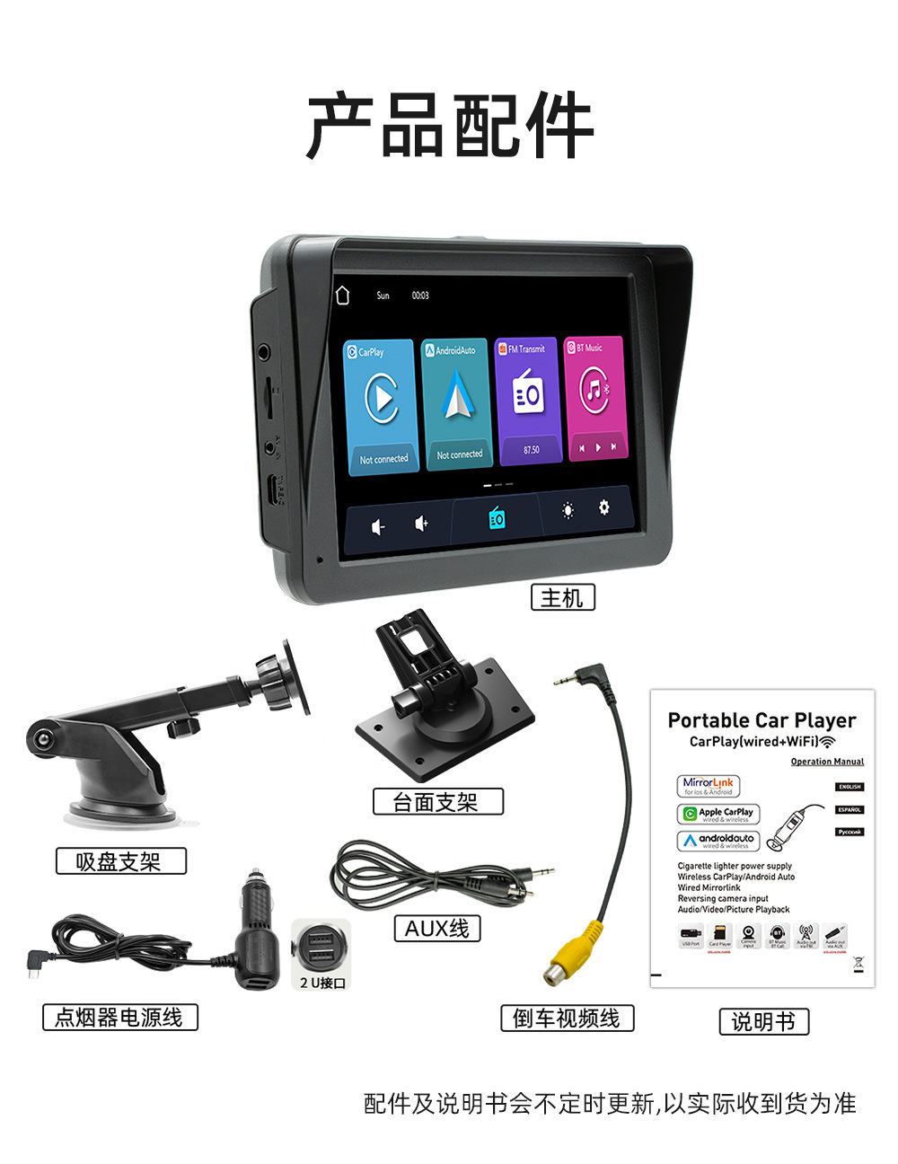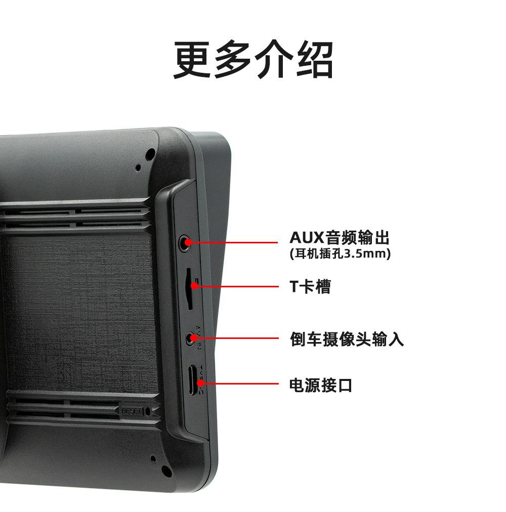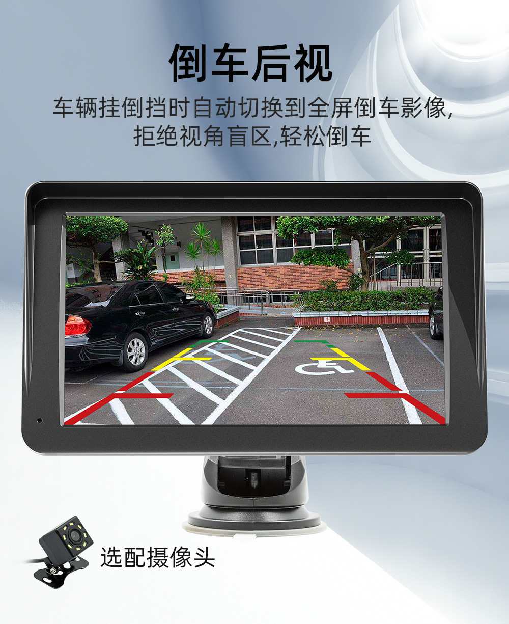 配 件:1.主机 2.说明书 3.专用点烟器电源线 4.吸盘支架 5.倒车视频线(配件、说明书、包装会不定时更新,以实际收到货为准)
