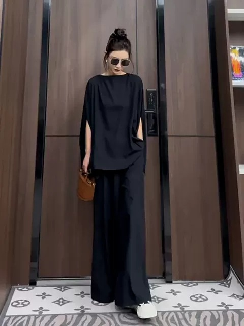 Модный темпераментный соляной шифоновый топ высокого класса с чувством интернет-знаменитостей Fried Street Lively, уменьшающий возраст, брюки с широкими штанинами, женский летний костюм из двух предметов