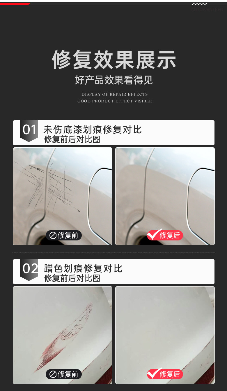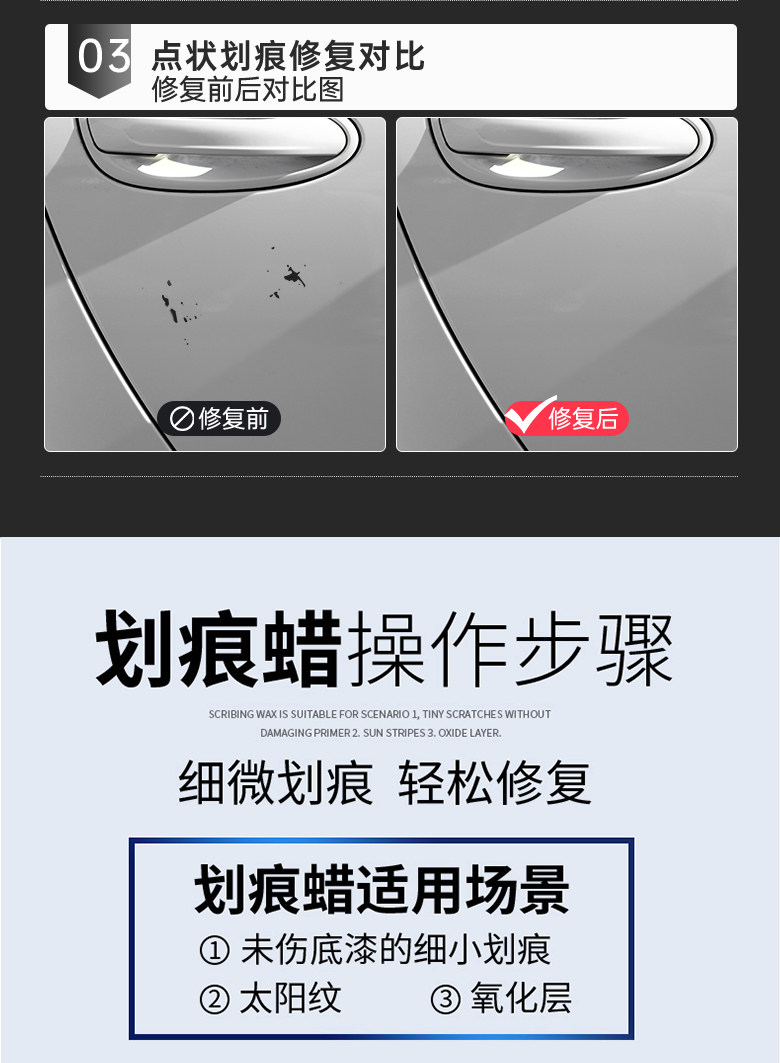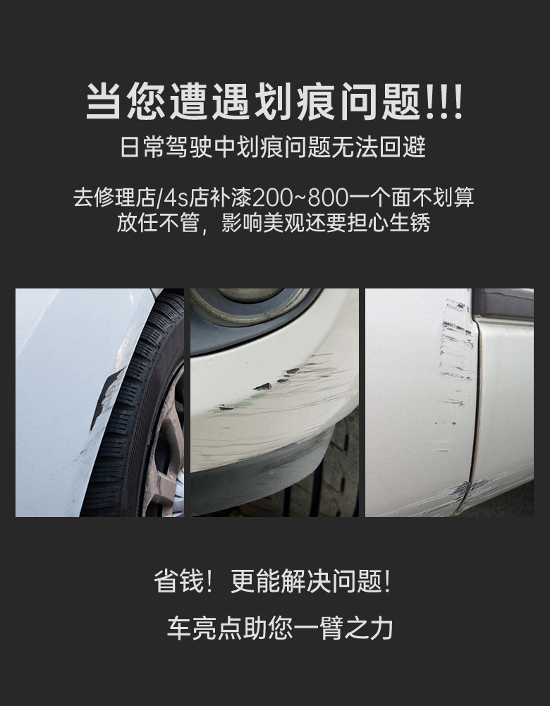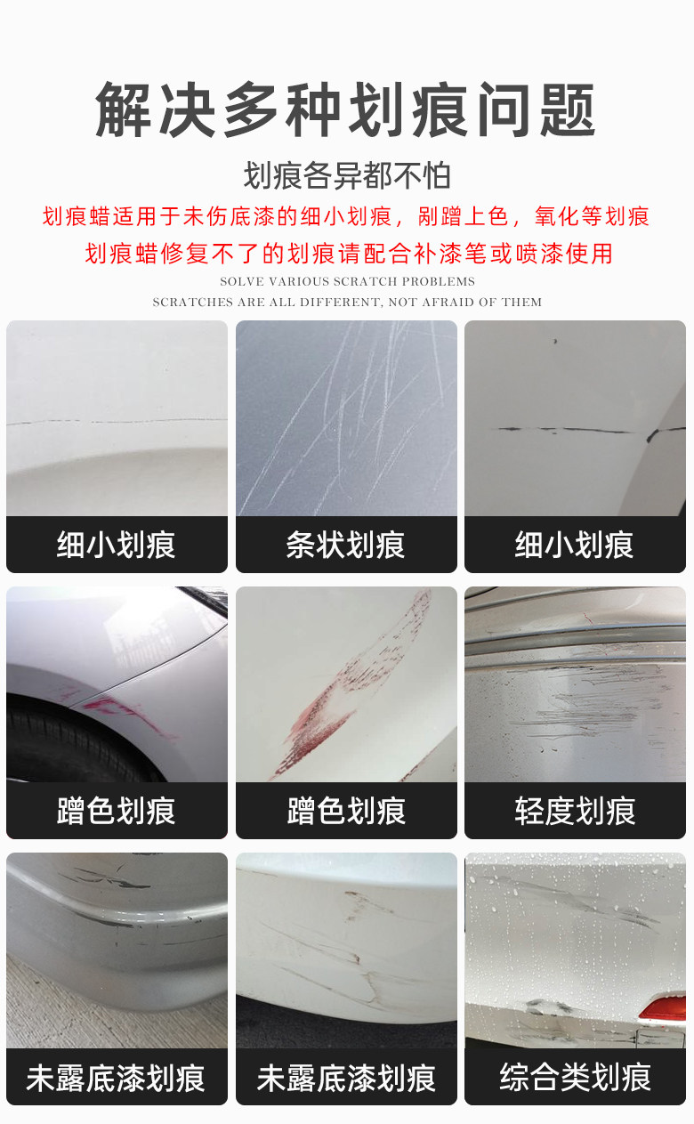 【注意事项】:本产品只对补漆后的砂纸打磨过的小擦痕、树枝刮痕、及车身一般污渍才有效果,对伤及底漆了是没有效果的。