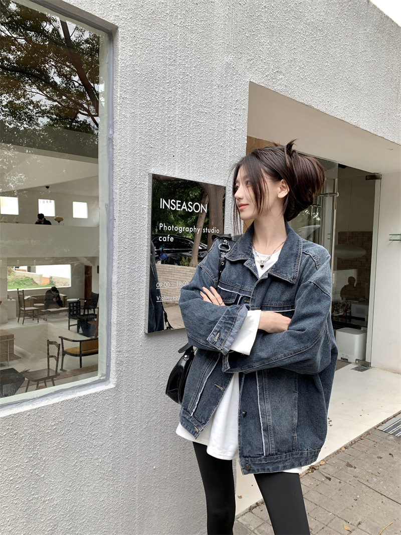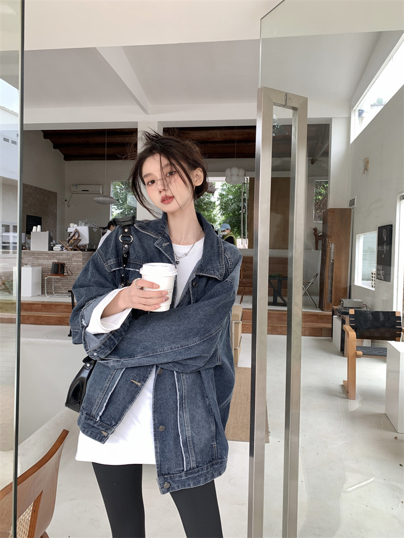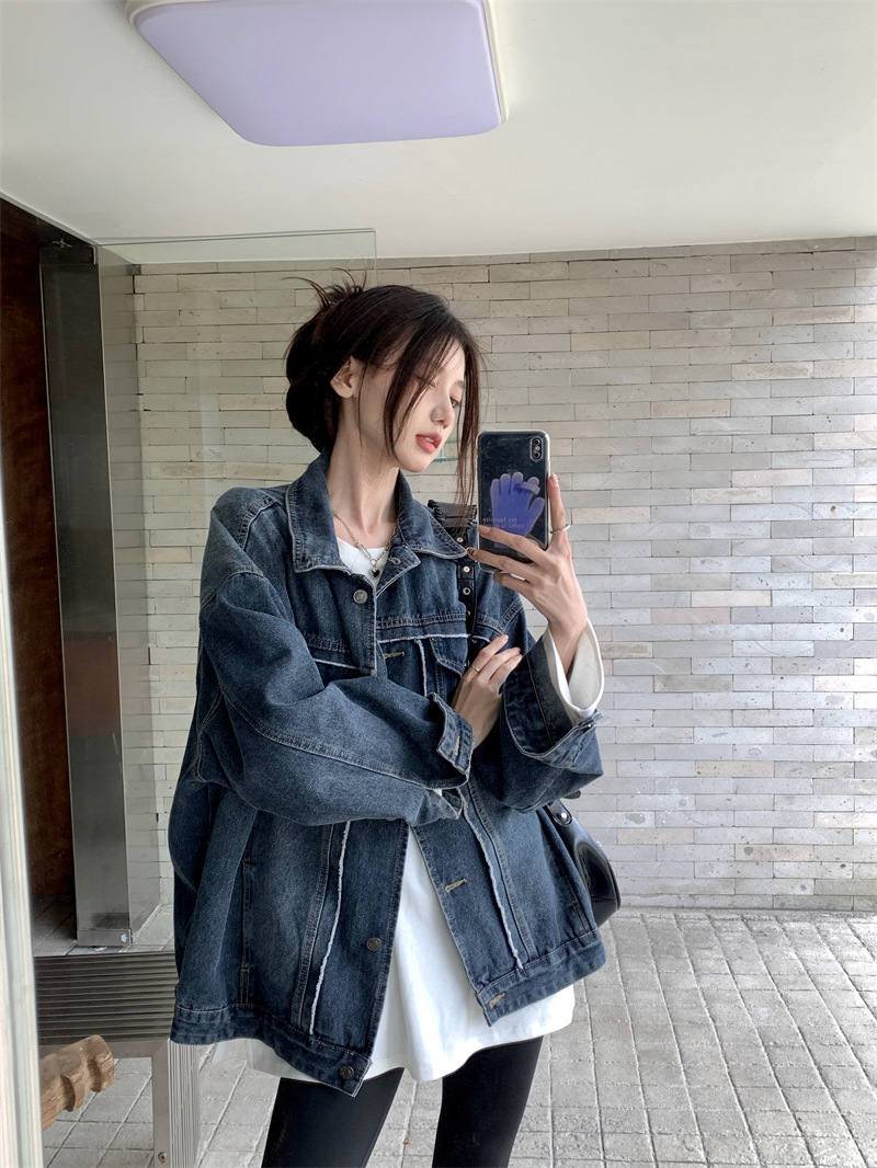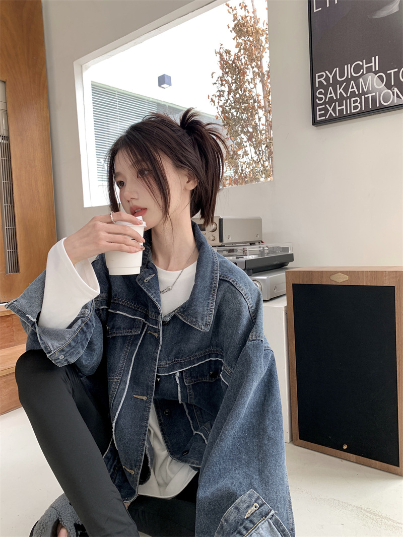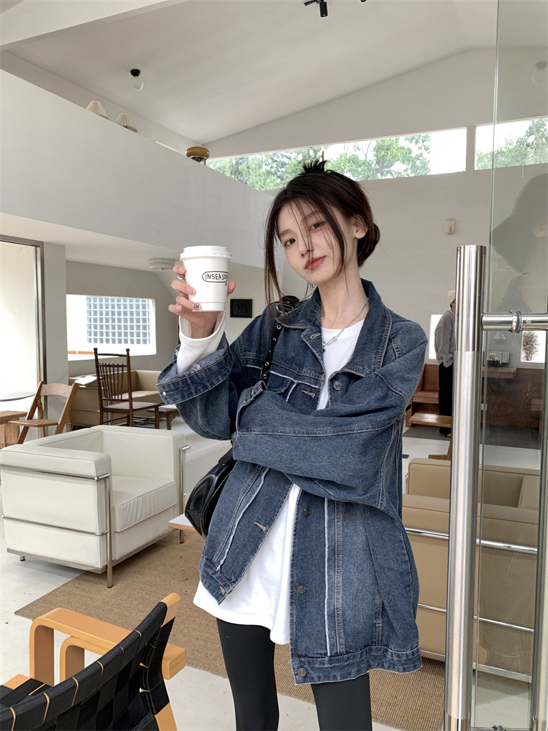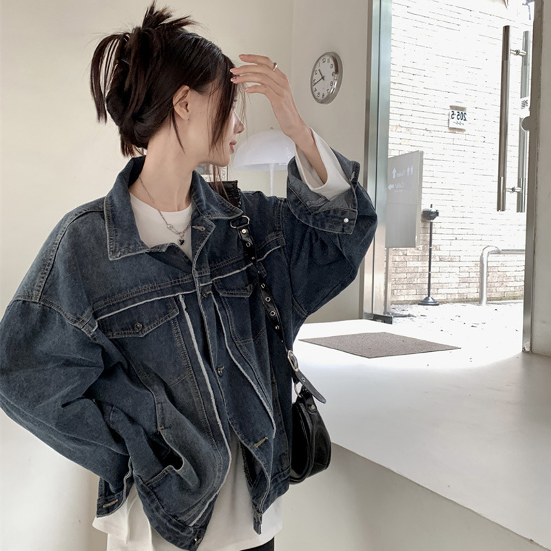 Синяя джинсовая куртка в стиле ретро с Выстиранным воротником POLO, женская новая свободная кофта в Корейском стиле с градиентным цветом, весна-осень 2023 года