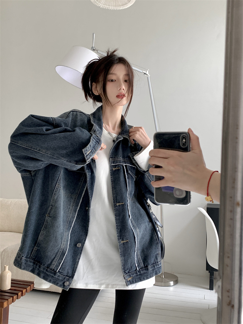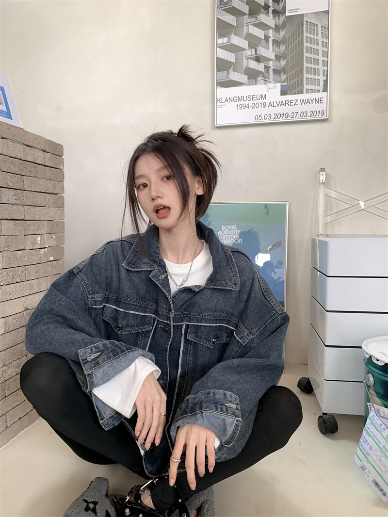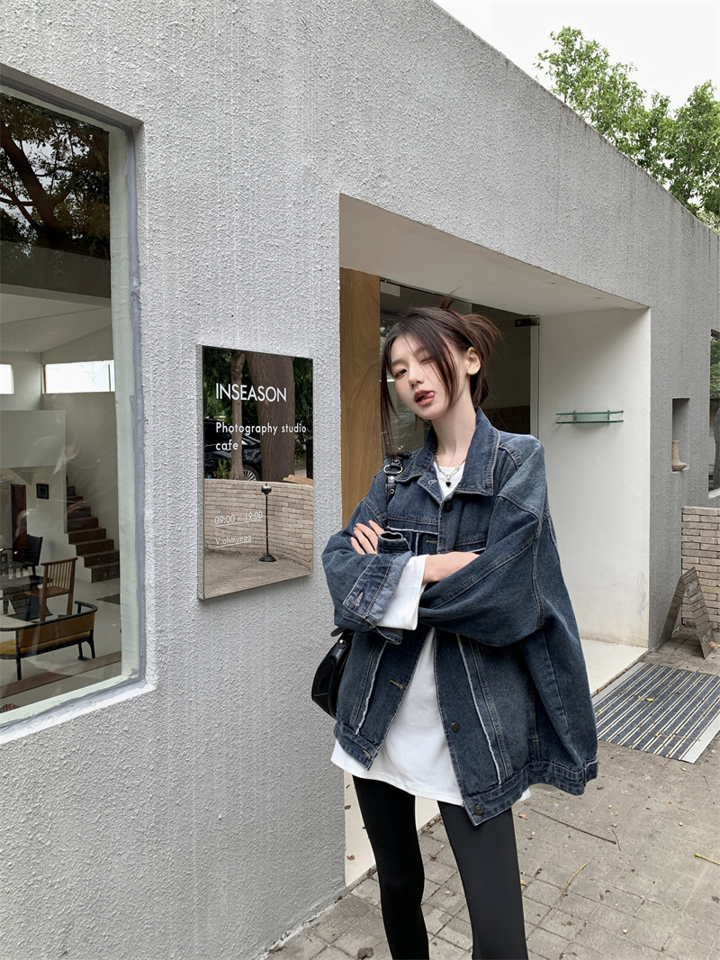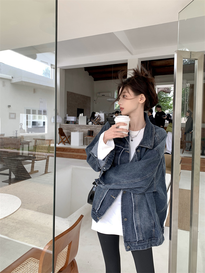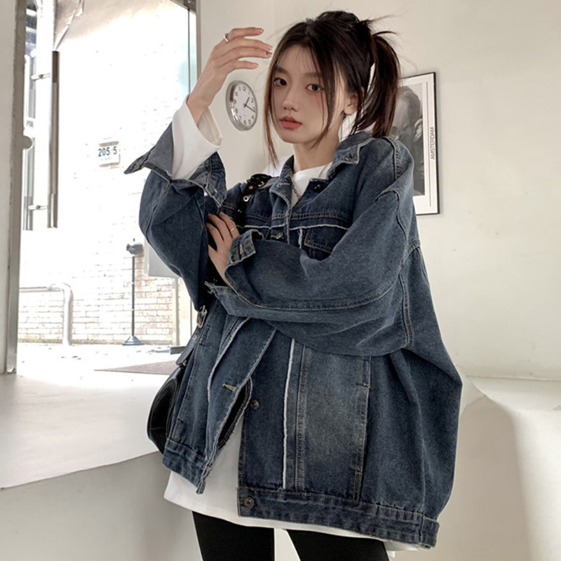 Синяя джинсовая куртка в стиле ретро с Выстиранным воротником POLO, женская новая свободная кофта в Корейском стиле с градиентным цветом, весна-осень 2023 года