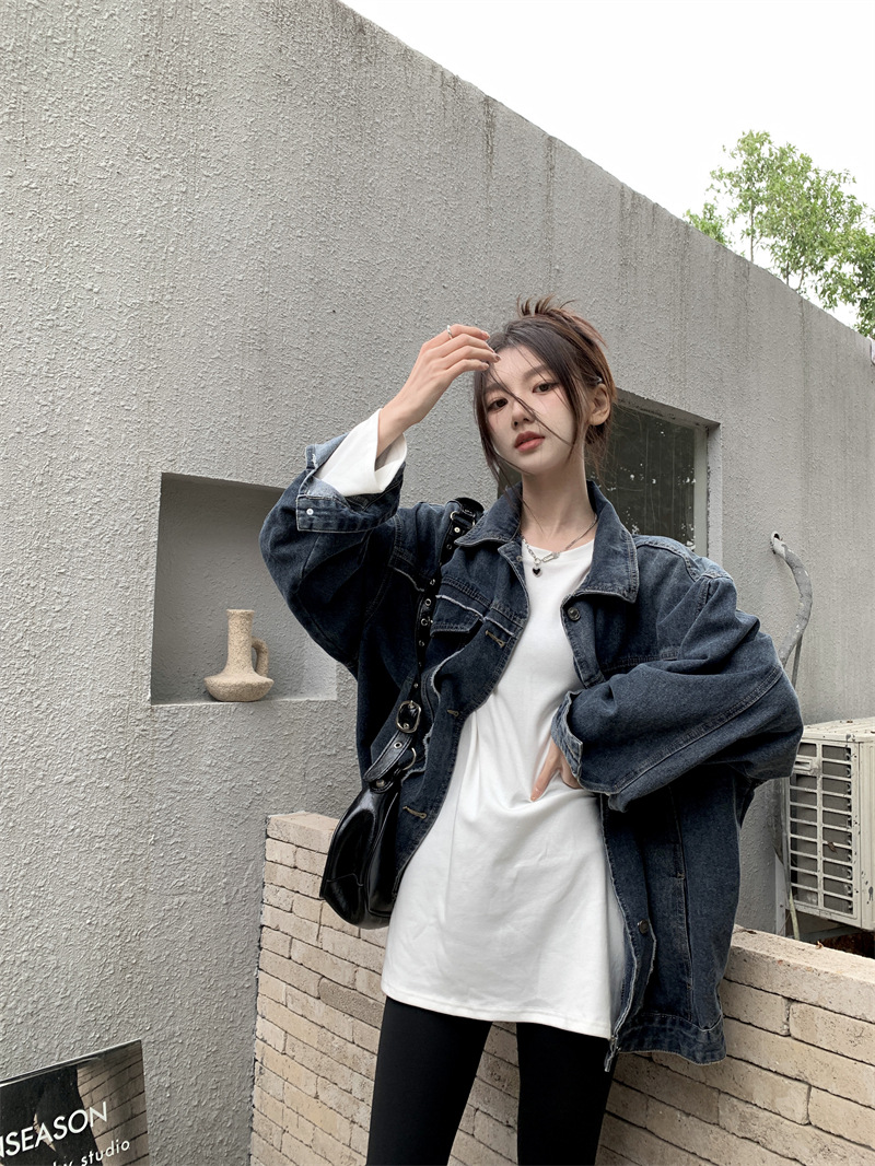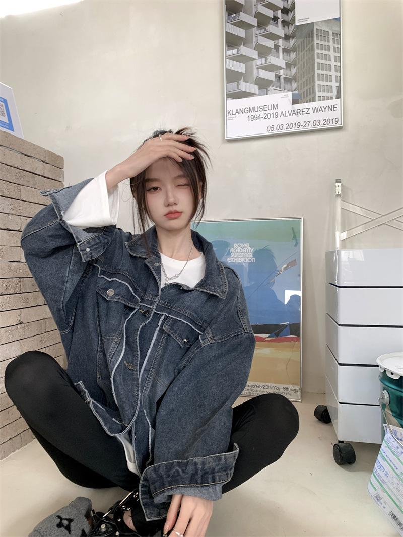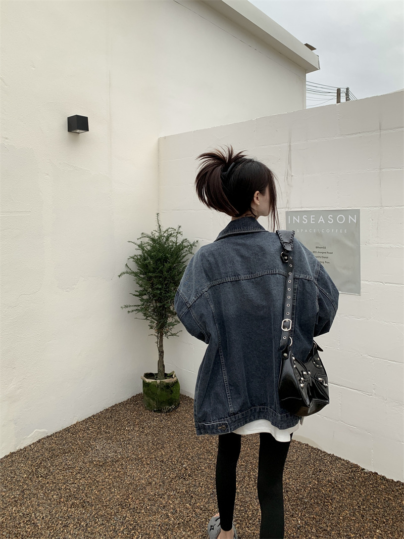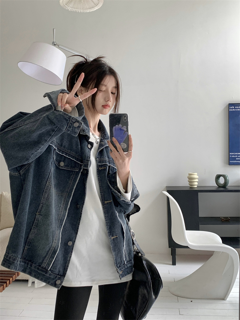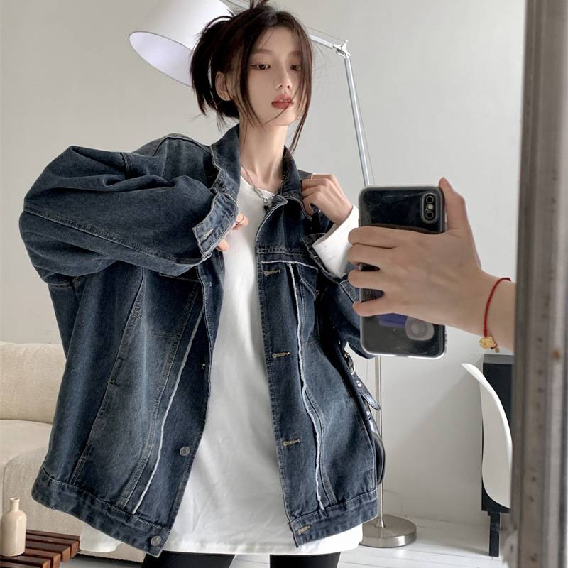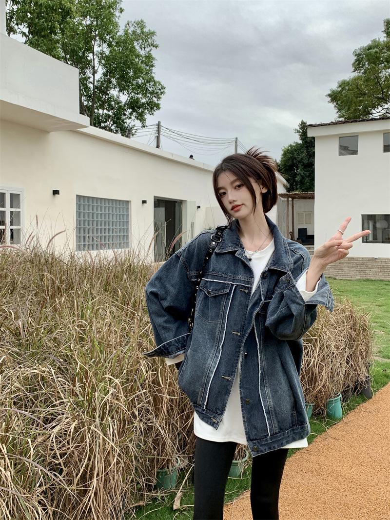 Синяя джинсовая куртка в стиле ретро с Выстиранным воротником POLO, женская новая свободная кофта в Корейском стиле с градиентным цветом, весна-осень 2023 года