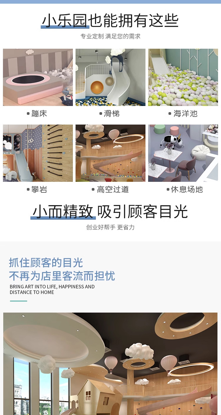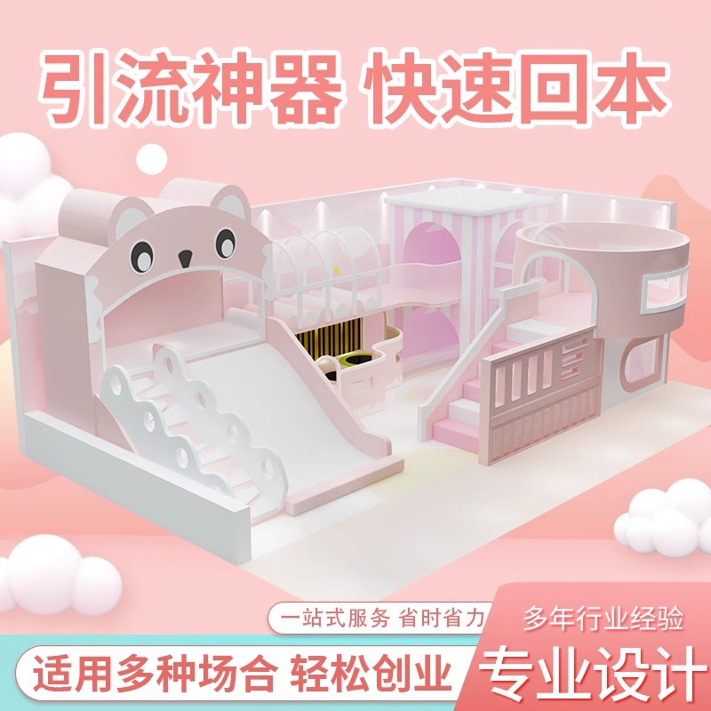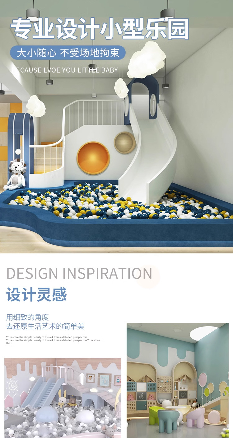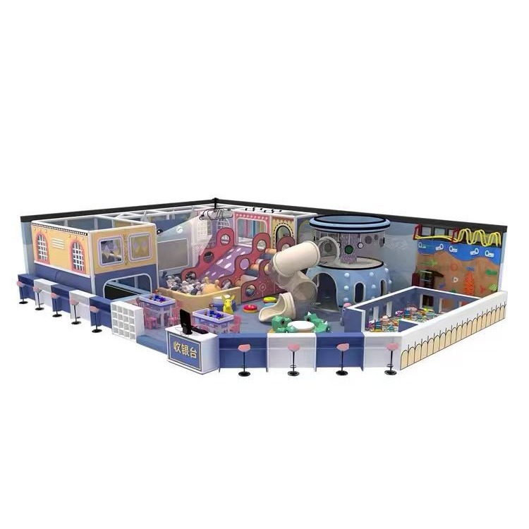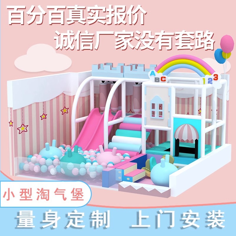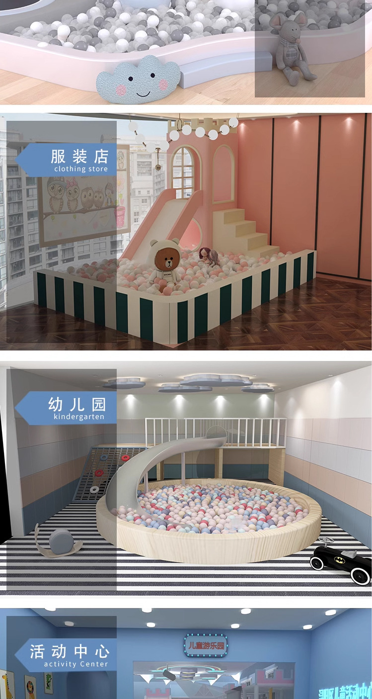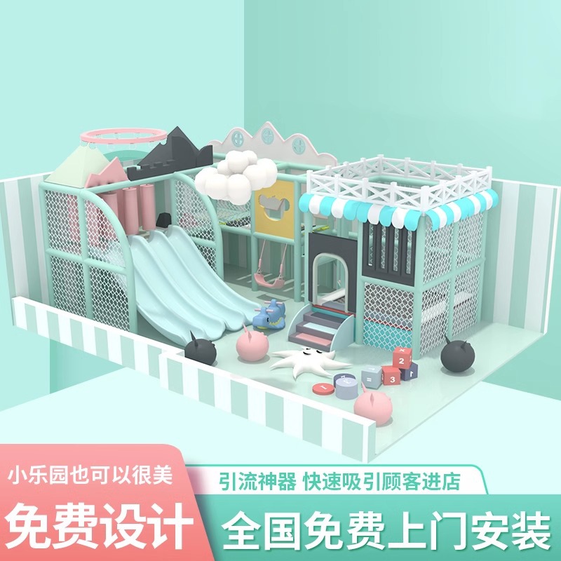 Маленькая крытая игровая зона для детей, отдел продаж на антресольном этаже, привлекает детей детских садов, с горками для малышей.