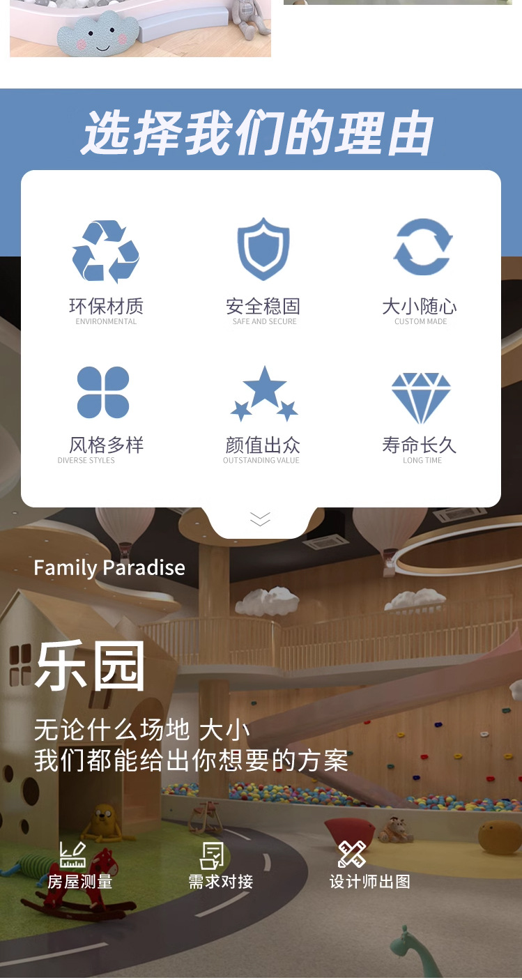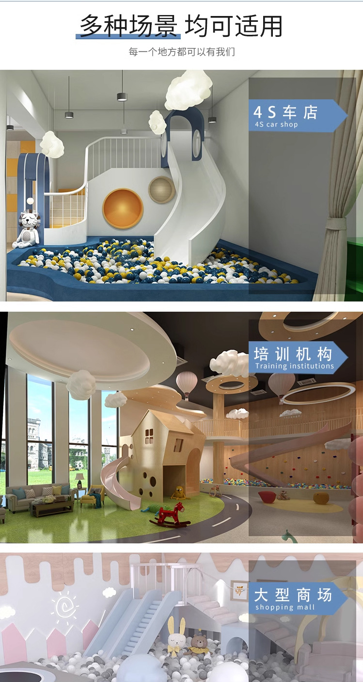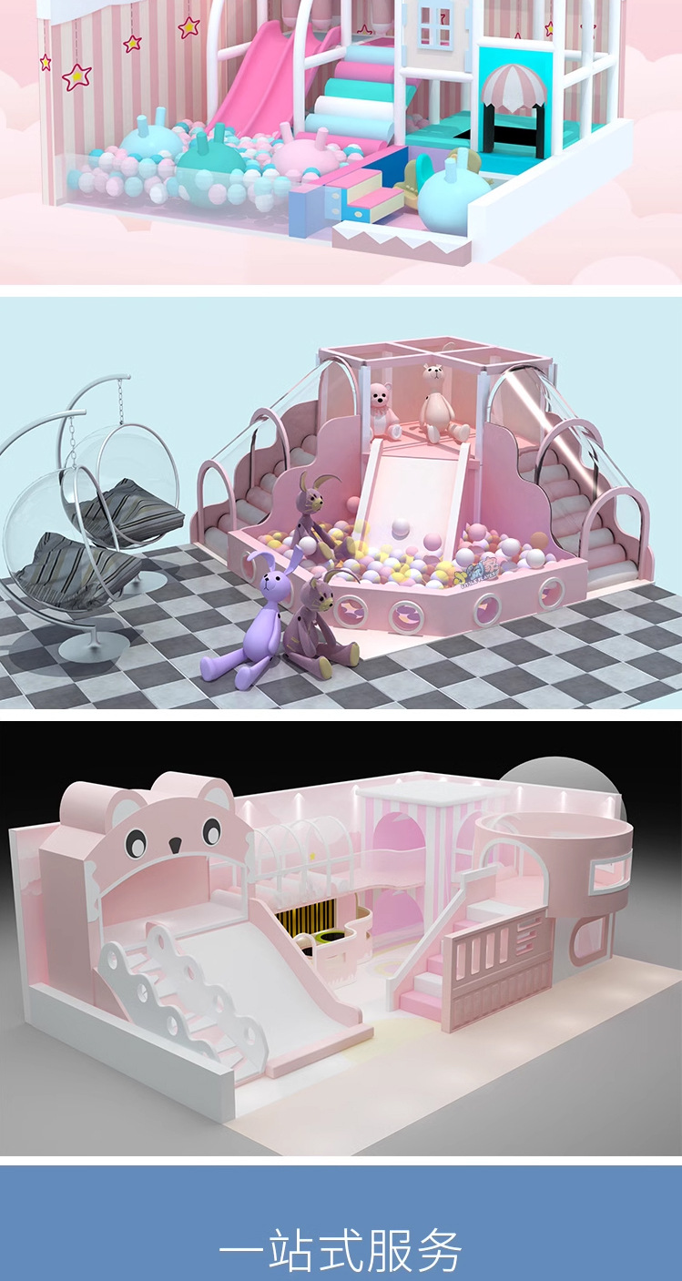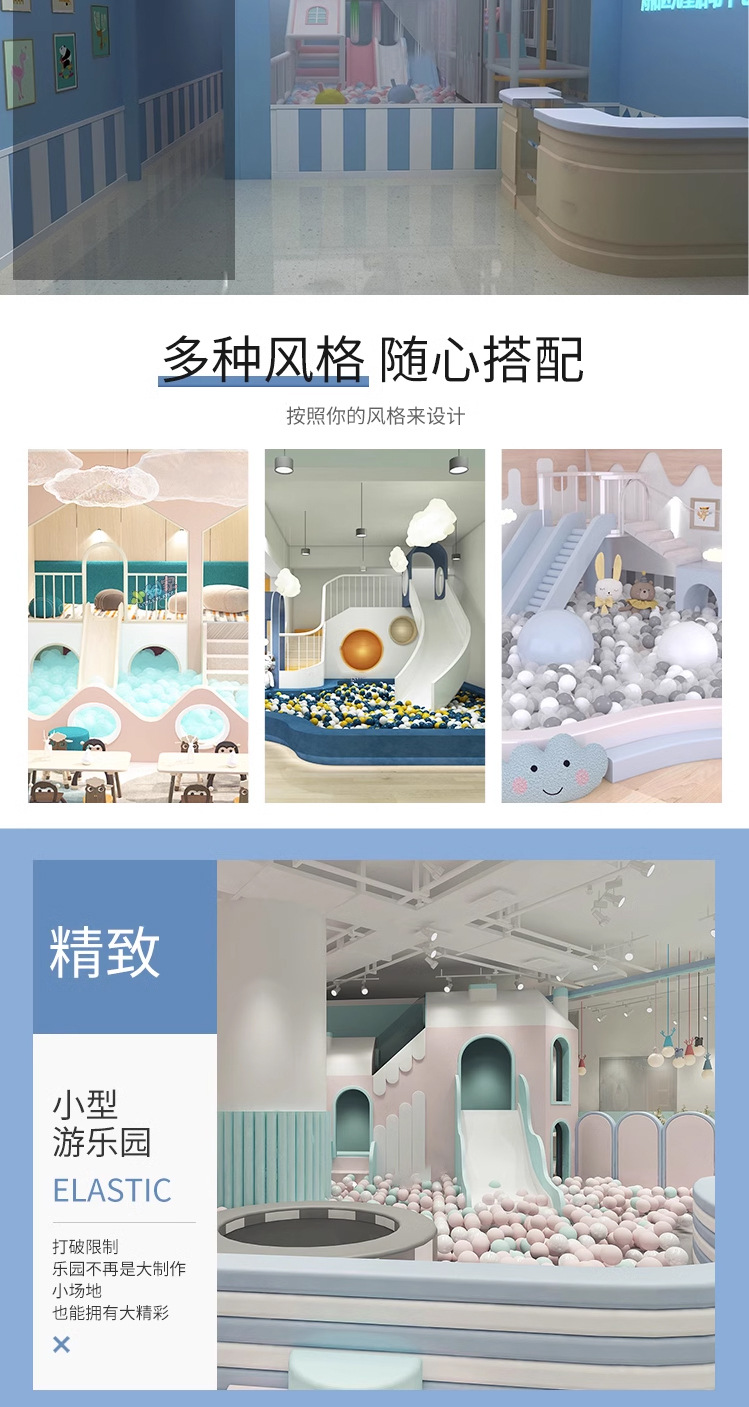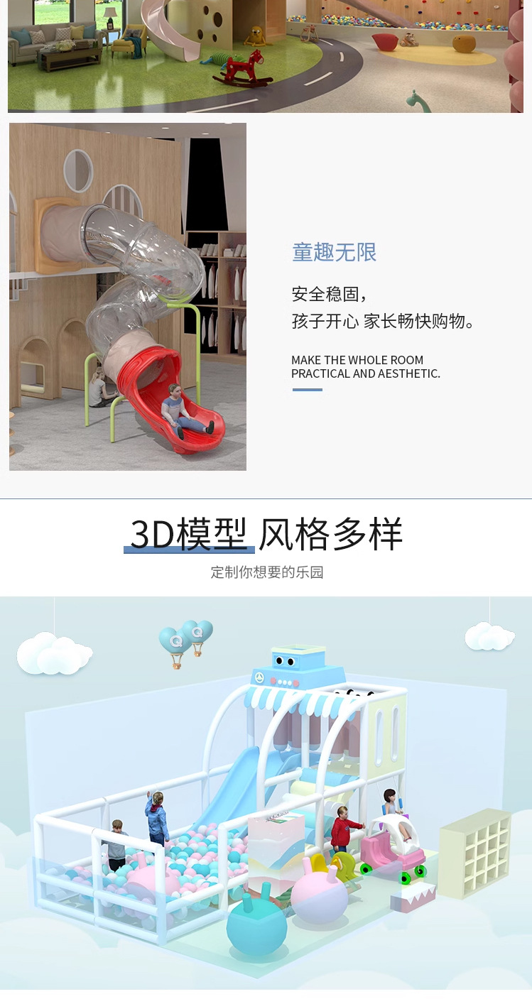Маленькая крытая игровая зона для детей, отдел продаж на антресольном этаже, привлекает детей детских садов, с горками для малышей.