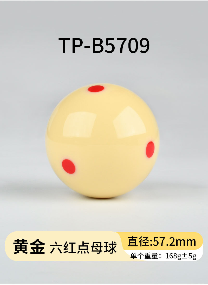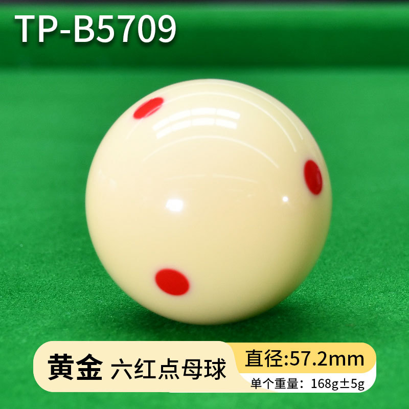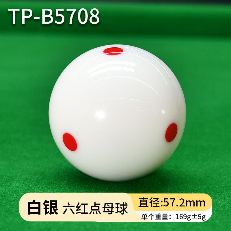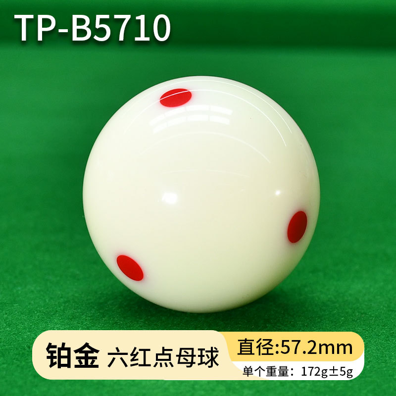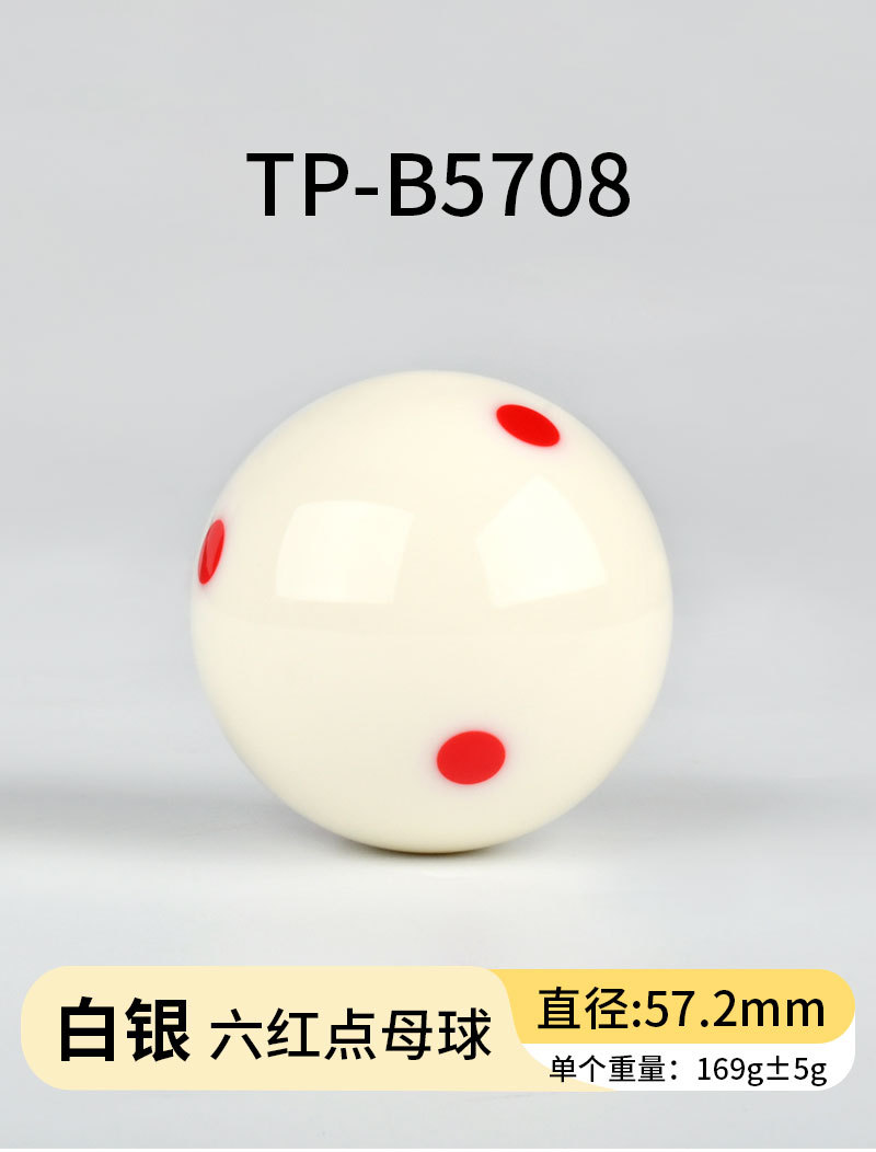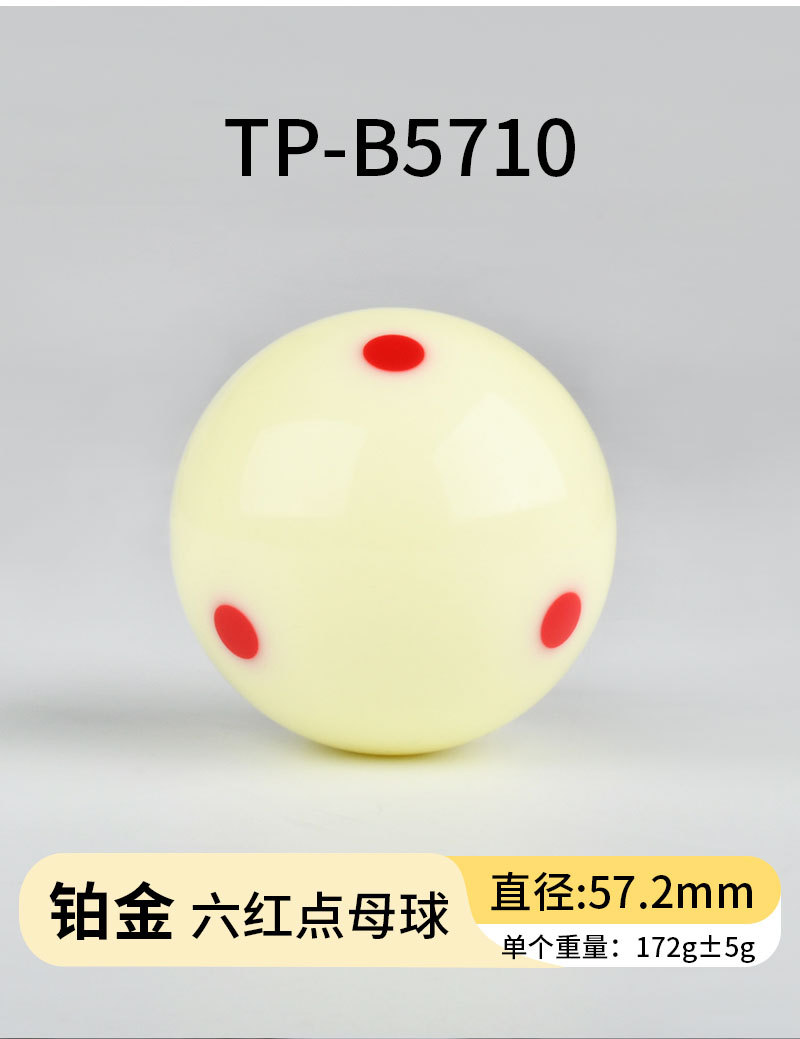 белый бильярдный шар; Шеститочечный синий бильярдный шар (1 штука) TP-B5702; Шеститочечный красный бильярдный шар (1 штука) TP-B5703; Тренировочный бильярдный шар с черной точкой (1 штука) TP-B5704; Красный профессиональный тренировочный бильярдный шар (TP-B5705); Серебристый бильярдный шар с красной точкой (TP-B5708); Золотой бильярдный шар с красной точкой (TP-B5709); Платиновый бильярдный шар с красной точкой (TP-B5710)