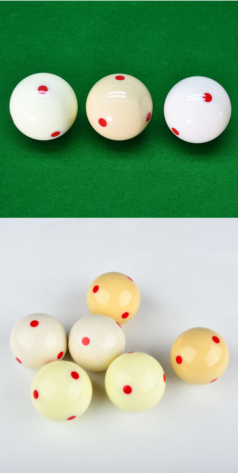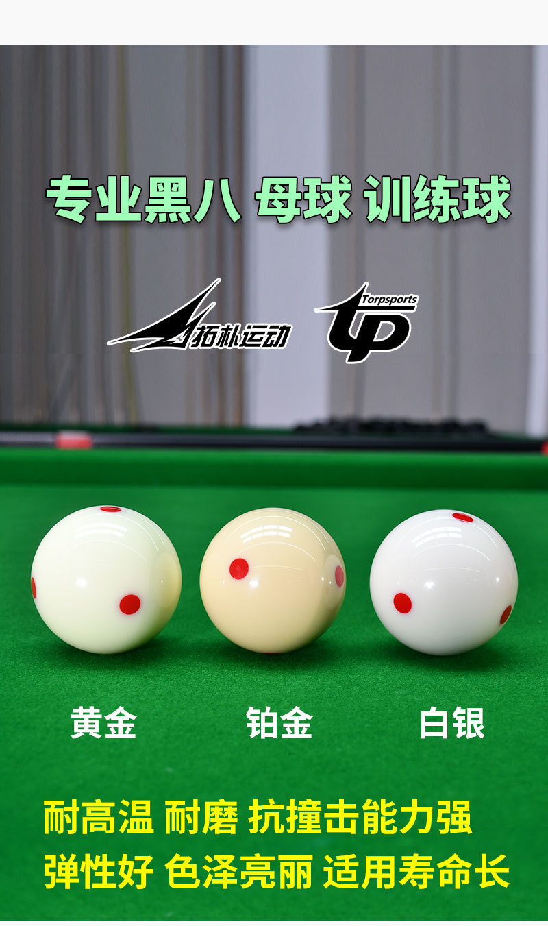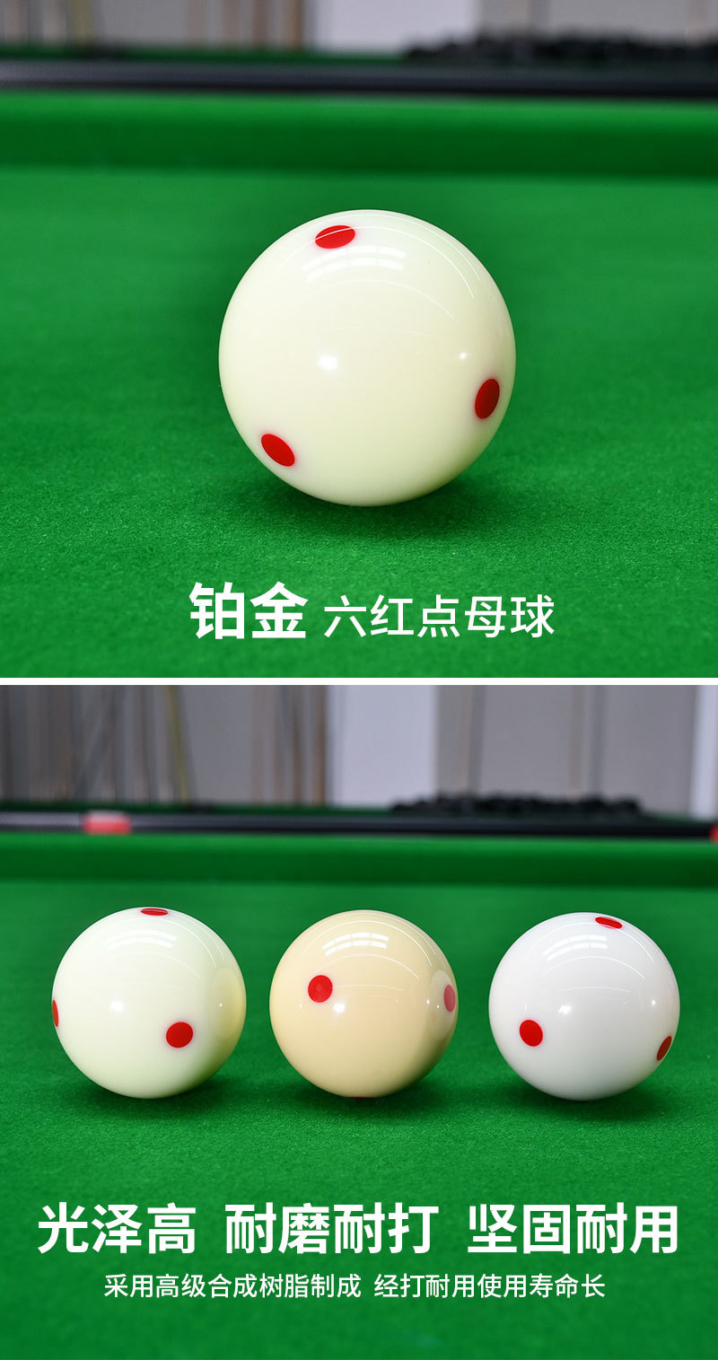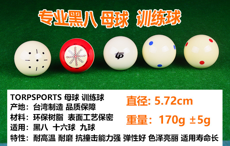 белый бильярдный шар; Шеститочечный синий бильярдный шар (1 штука) TP-B5702; Шеститочечный красный бильярдный шар (1 штука) TP-B5703; Тренировочный бильярдный шар с черной точкой (1 штука) TP-B5704; Красный профессиональный тренировочный бильярдный шар (TP-B5705); Серебристый бильярдный шар с красной точкой (TP-B5708); Золотой бильярдный шар с красной точкой (TP-B5709); Платиновый бильярдный шар с красной точкой (TP-B5710)