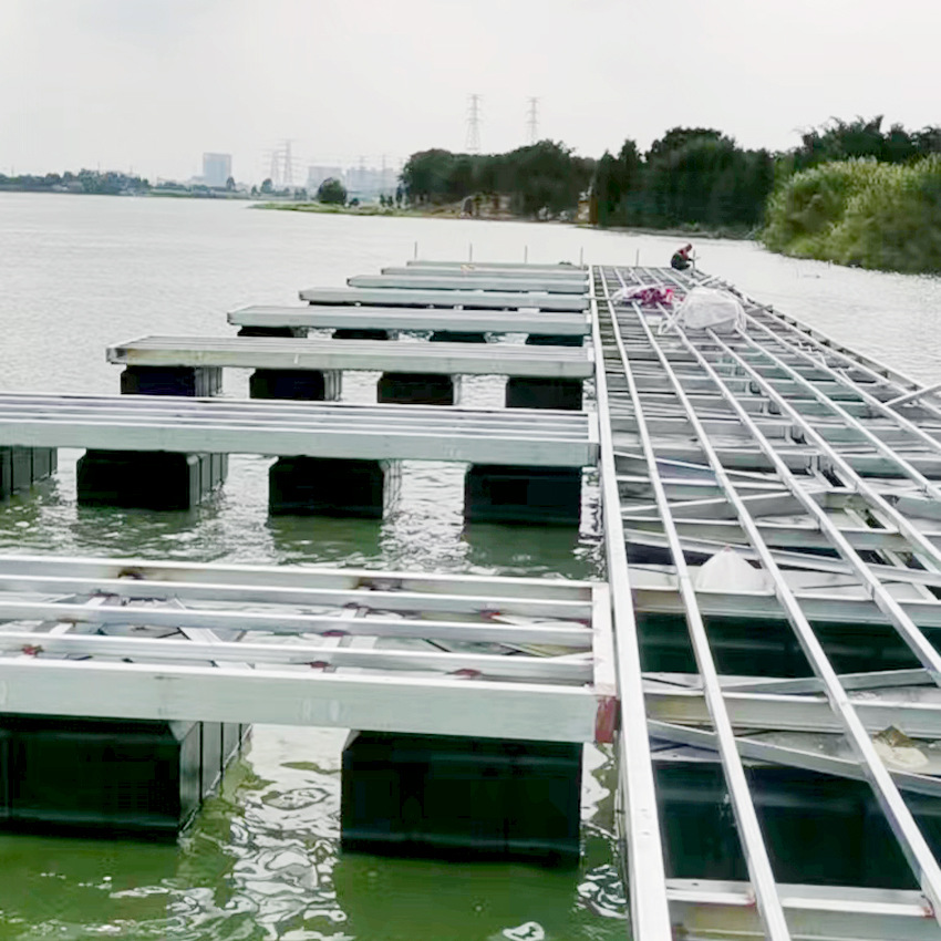 新型铝合金游艇码头采用航海级的6061铝合金,T6热处理,MIG焊制而成,表面经过科学的处理,增强了框架的抗氧化能力和抗腐蚀能力,具备良好的耐腐蚀性,适用于江河湖海,通用性强。浮桥表面可选用进口户外防腐松木,塑木,坤甸木作为铺板材料。经过严格测试,产品质量达到国外先进水准。