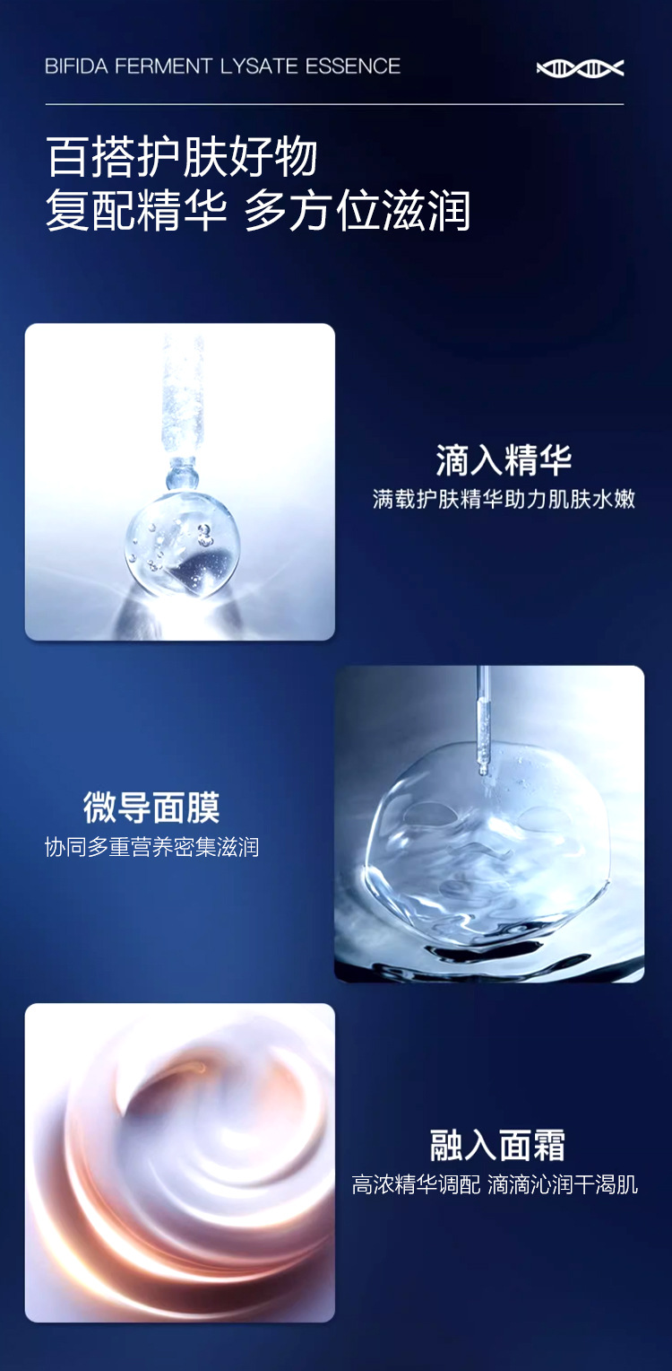 【功效】蕴含二裂酵母、玻尿酸护肤精华,滴滴精粹,轻轻一抹,水感清润易吸收,不粘腻,补水保湿,匀净提靓,紧致抗皱,淡化细纹及干纹,使肌肤焕发年轻光采。