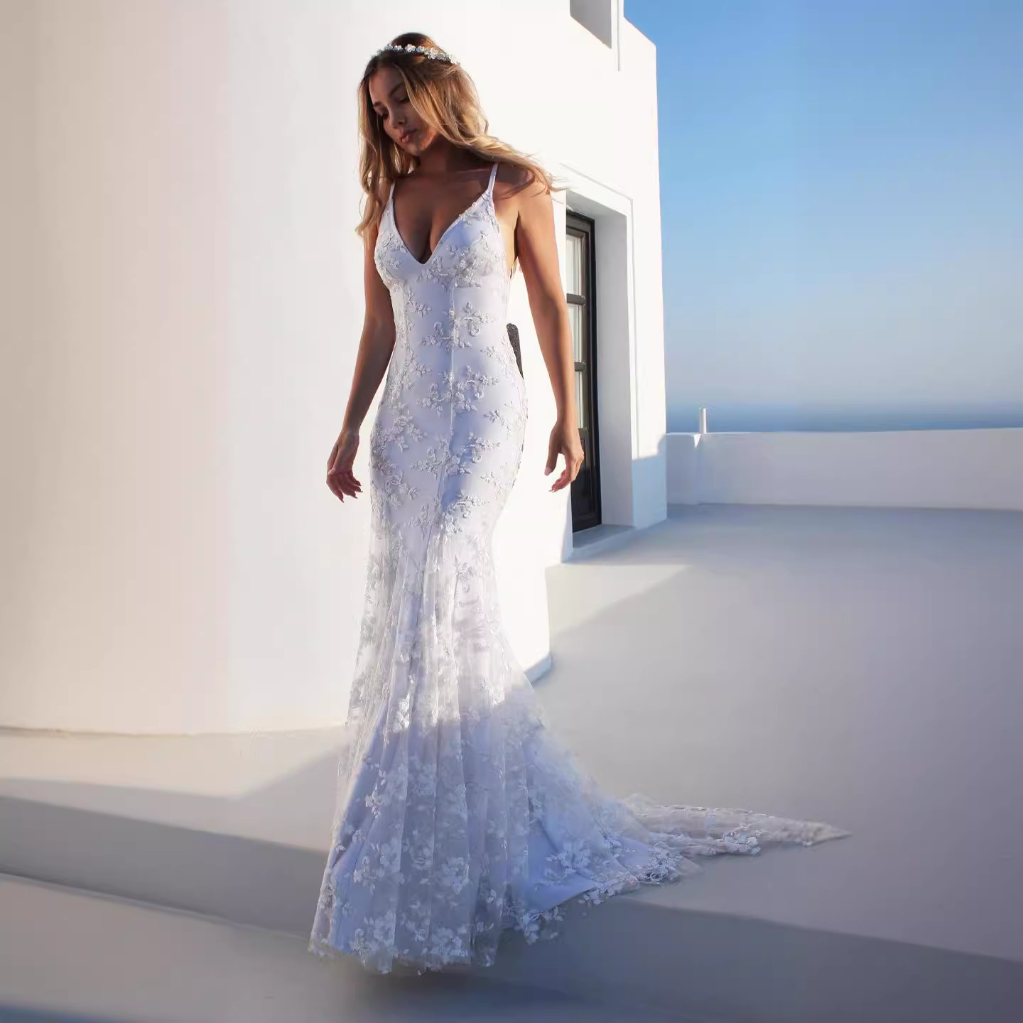 Новое платье для экспорта в Европе и Америке 2025 года, длинная юбка ebay Amazon, сексуальное белое платье с v-образным вырезом и подтяжками