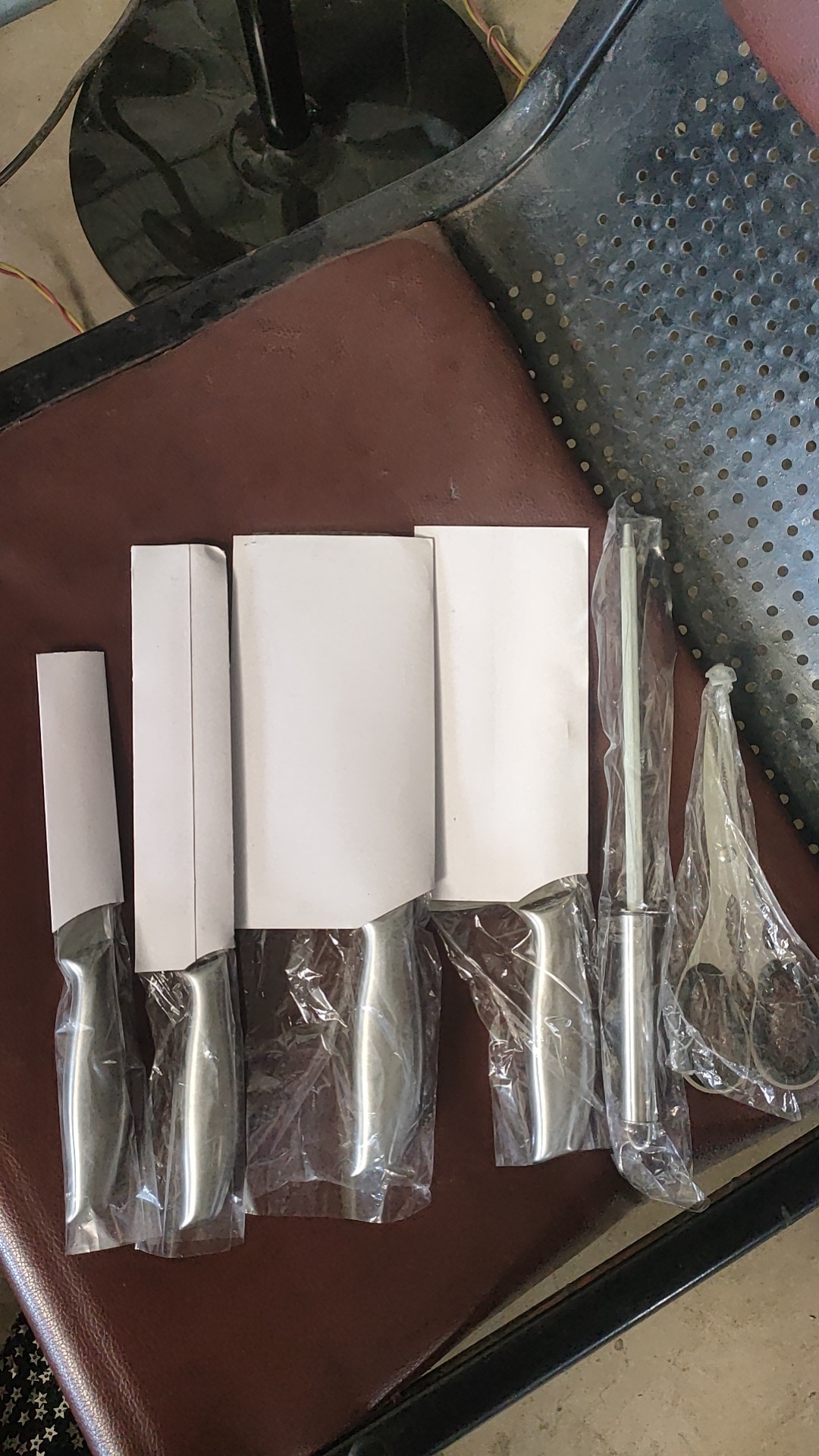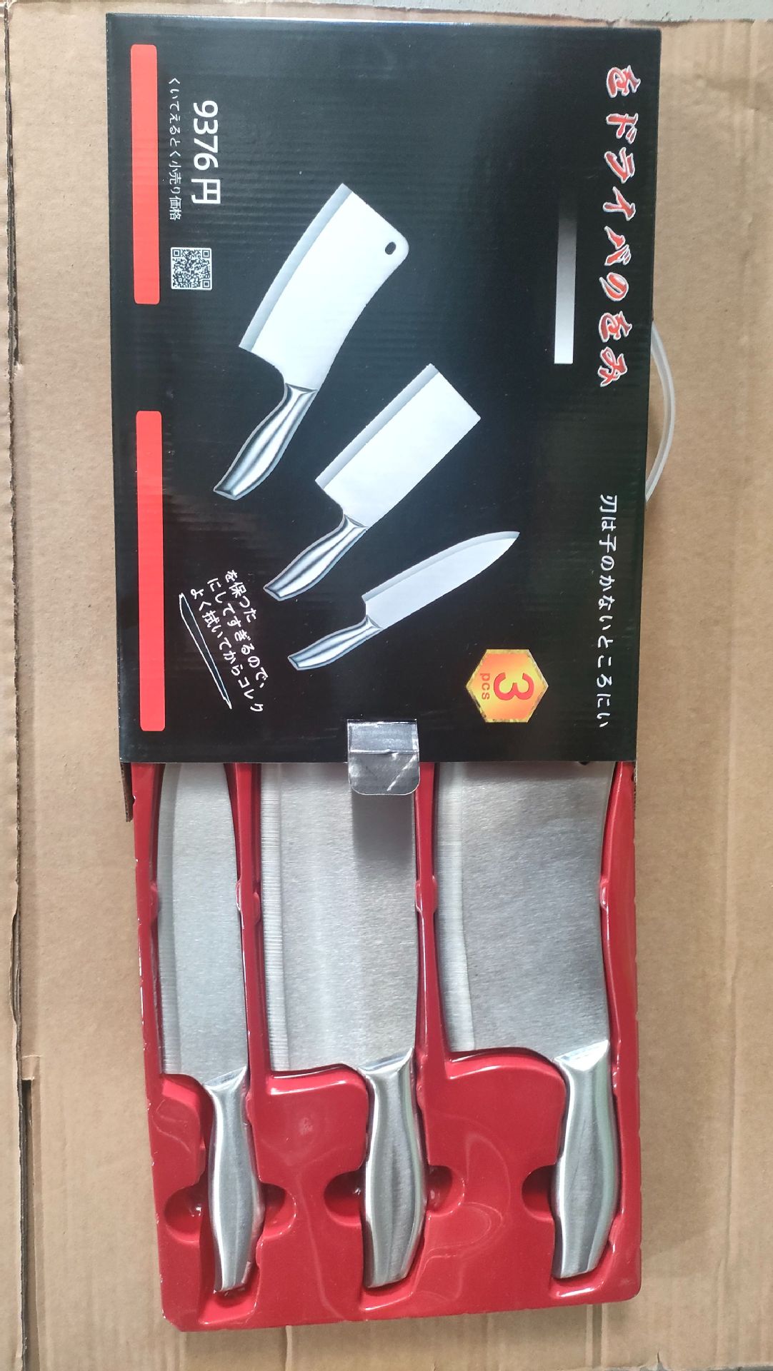 Практичный цельнометаллический набор из трех предметов.; Нож для измельчения костей из нержавеющей стали толщиной 2,2.; Лезвие полностью из нержавеющей стали толщиной 1,4.; Нож шеф-повара из нержавеющей стали толщиной 1,4.; Овощечистка из нержавеющей стали толщиной 1,4.; Цельнометаллический набор из пяти предметов (обычная коробка); Цельнометаллический набор из шести предметов (обычная коробка); Практичный набор из двух цельностальных ручек (в индивидуальной упаковке); Подарочный набор из трех предметов (японская портативная цветная коробка)