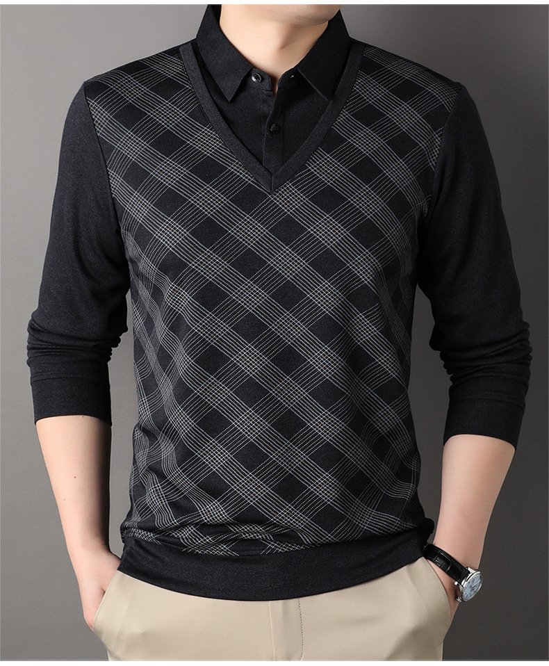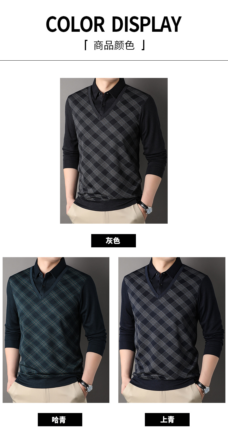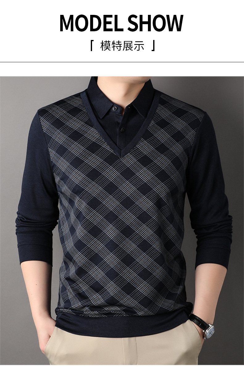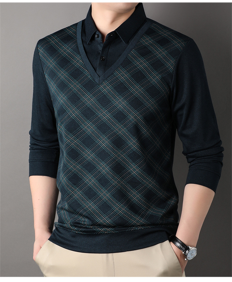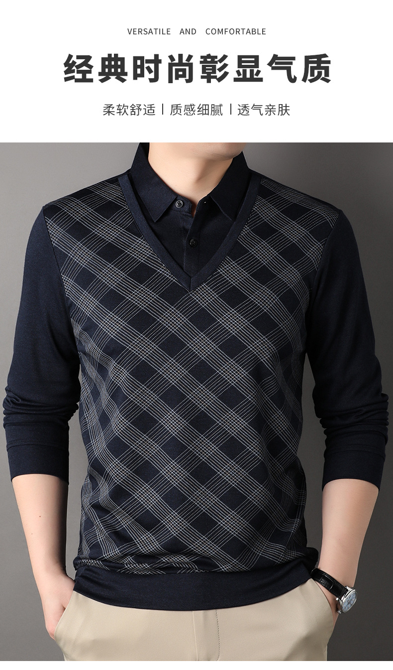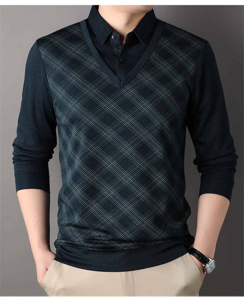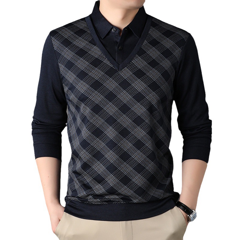 Осенняя футболка с длинными рукавами для папы Весенне-осенняя Тонкая Повседневная Базовая рубашка с отворотами из двух предметов из искусственной кожи для среднего возраста