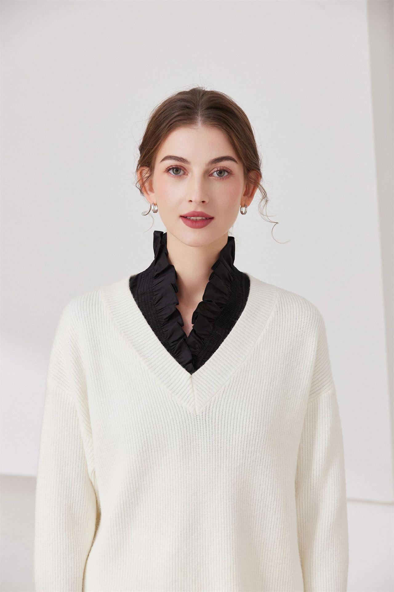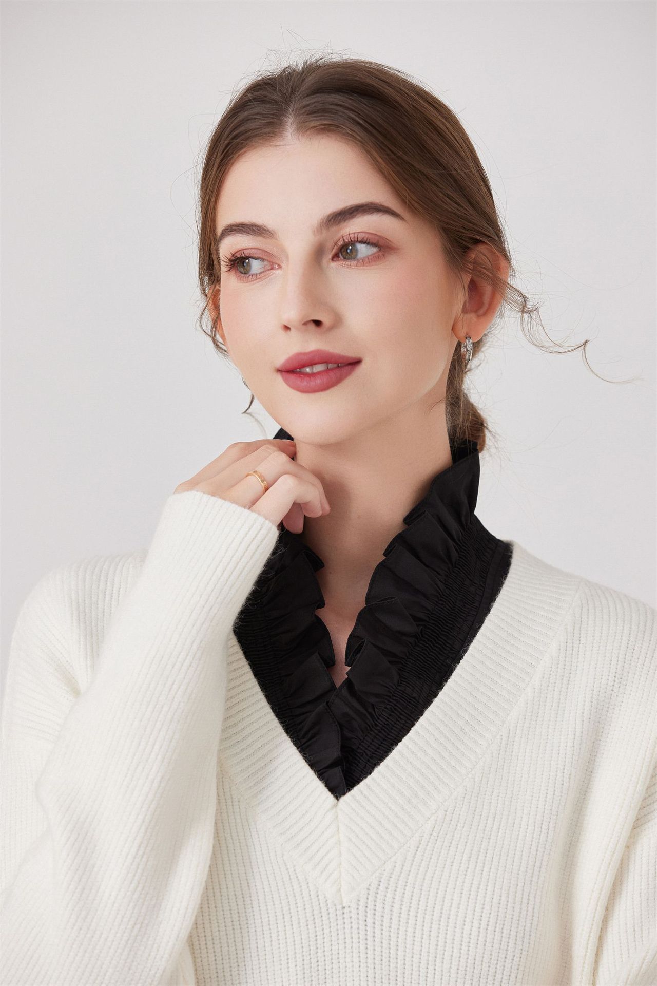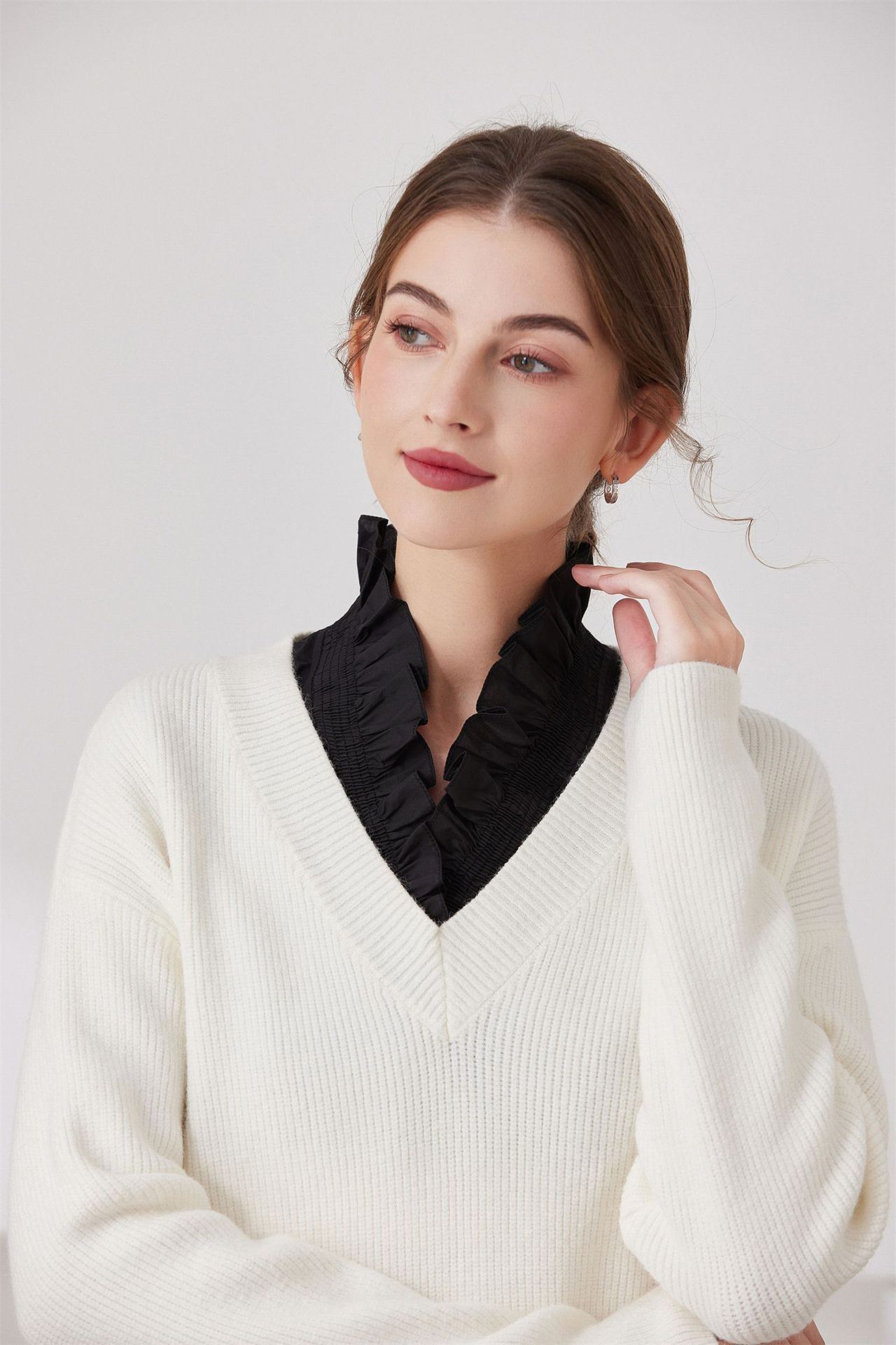 Плиссированная блузка с глубоким v-образным вырезом и искусственным воротником с декоративным воротником, осенне-зимний одинаковый свитер, кардиган, белый пролет