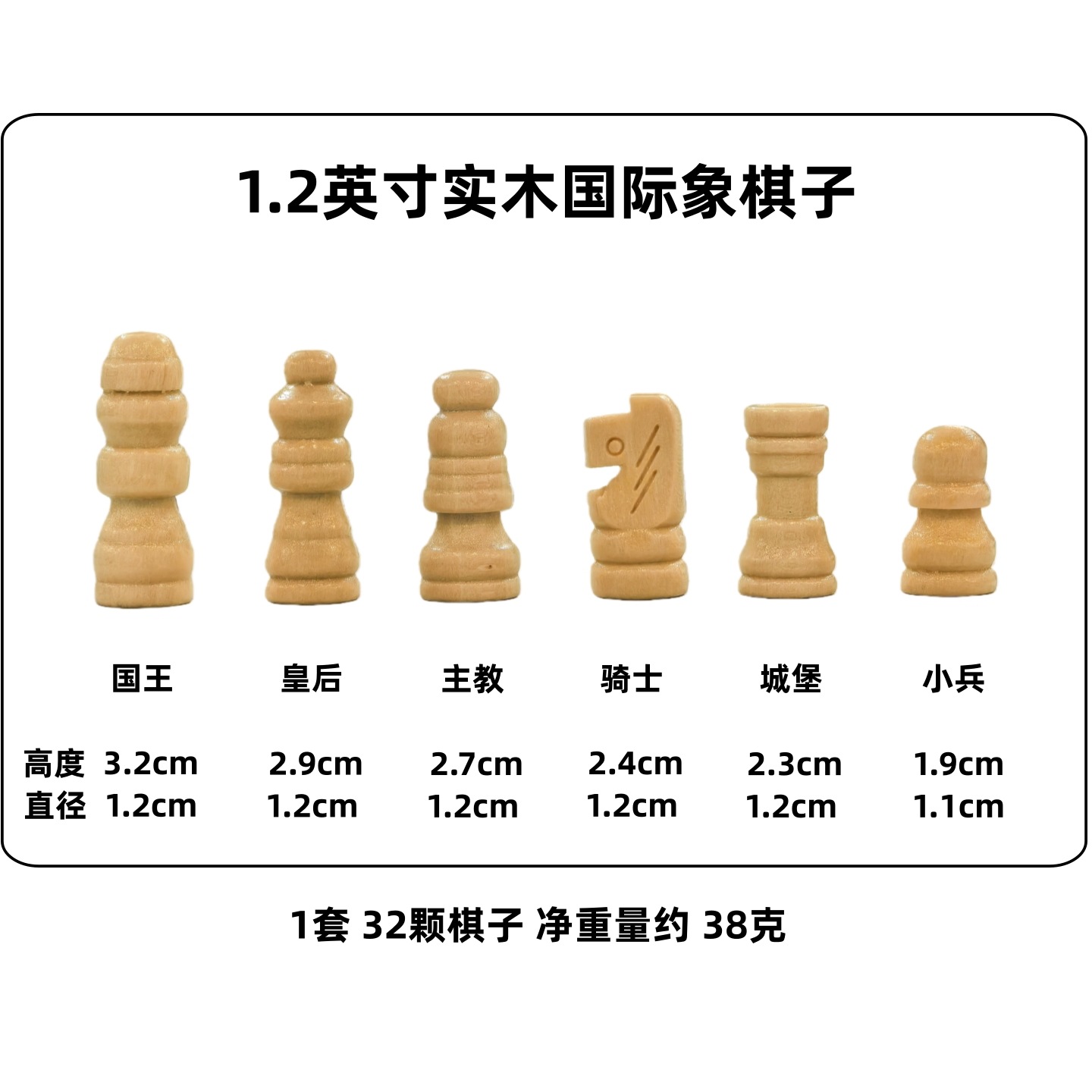 3.5inch шахматные фигуры (бархатные); 3inch шахматные фигуры (бархат); 2.5inch шахматные фигуры (бархат); 2.2inch x Шахматные фигуры; 2inch Шахматный суб (черный и белый); 2inch шахматные фигуры; 1.2inch шахматных фигуры; 1inch шахматные фигуры; Деревянные нарды (всего 24 шт.) диаметром 25 мм.