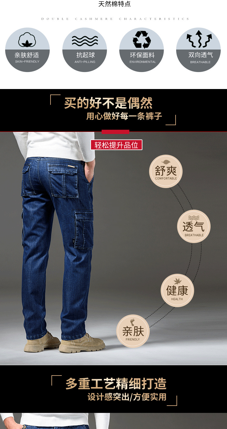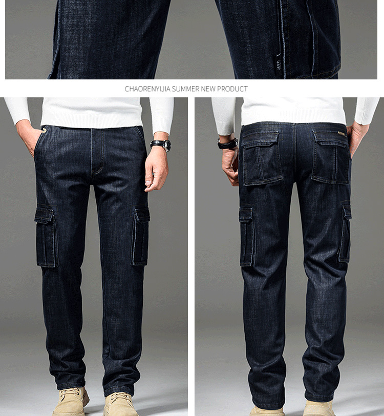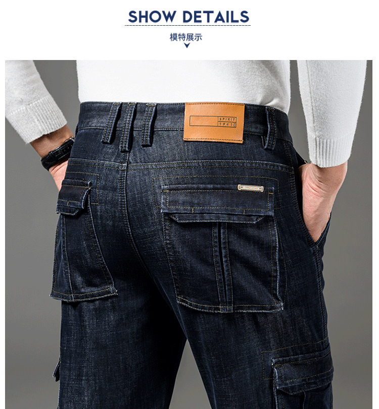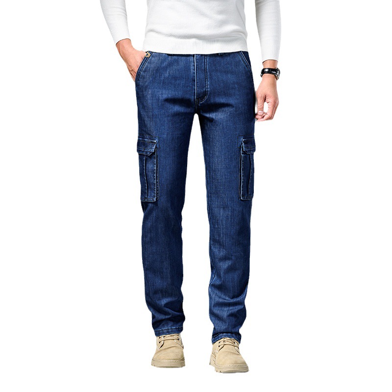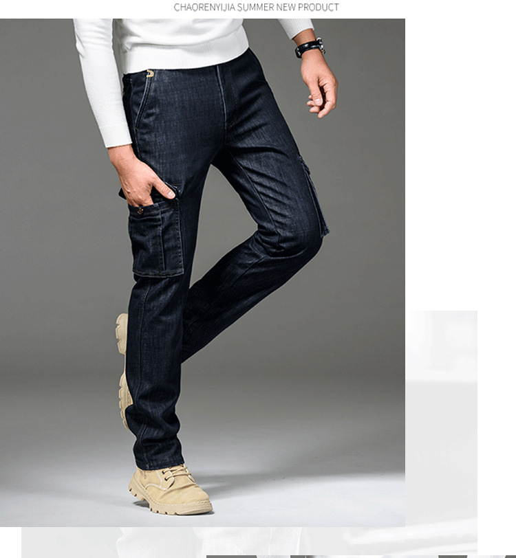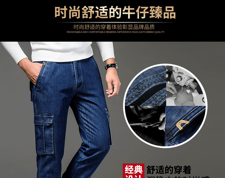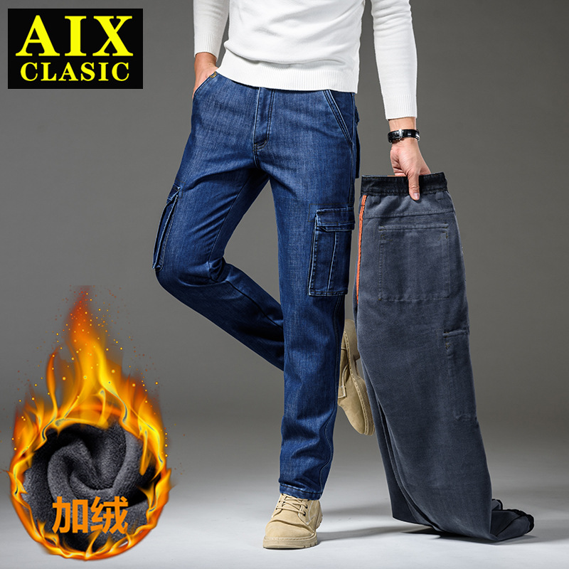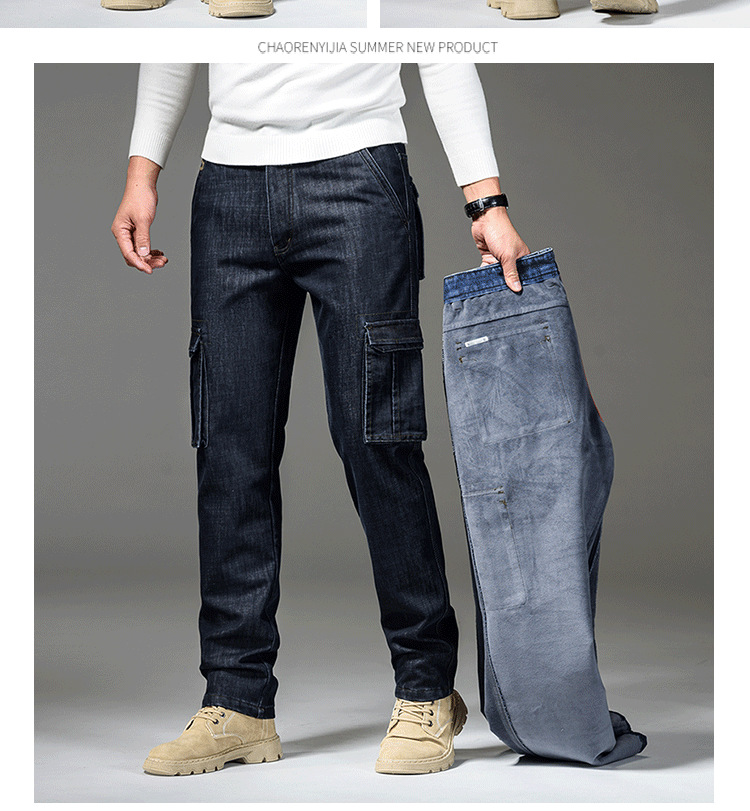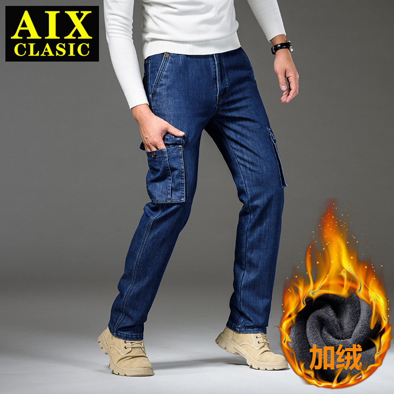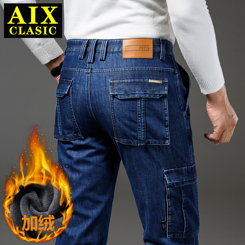 Осенне-зимние мужские джинсы, рабочая одежда, брюки с несколькими карманами, повседневные универсальные утепленные модные штаны на флисовой подкладке 125B Pass Plate