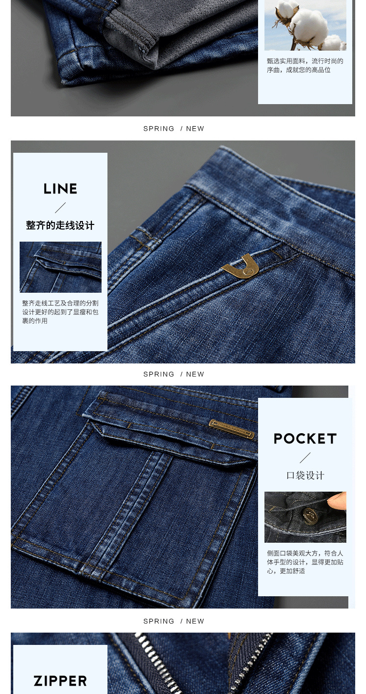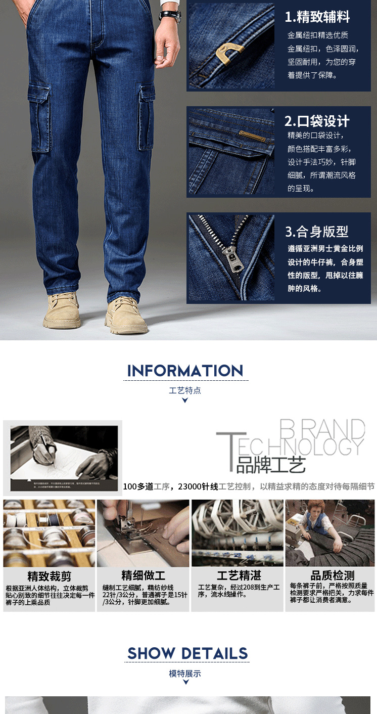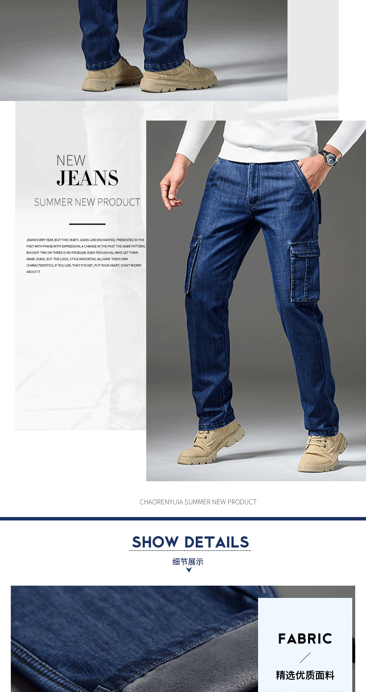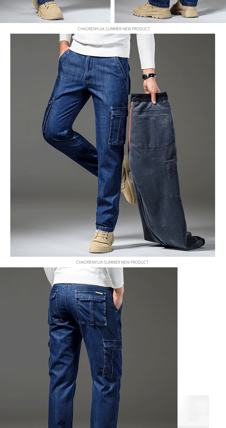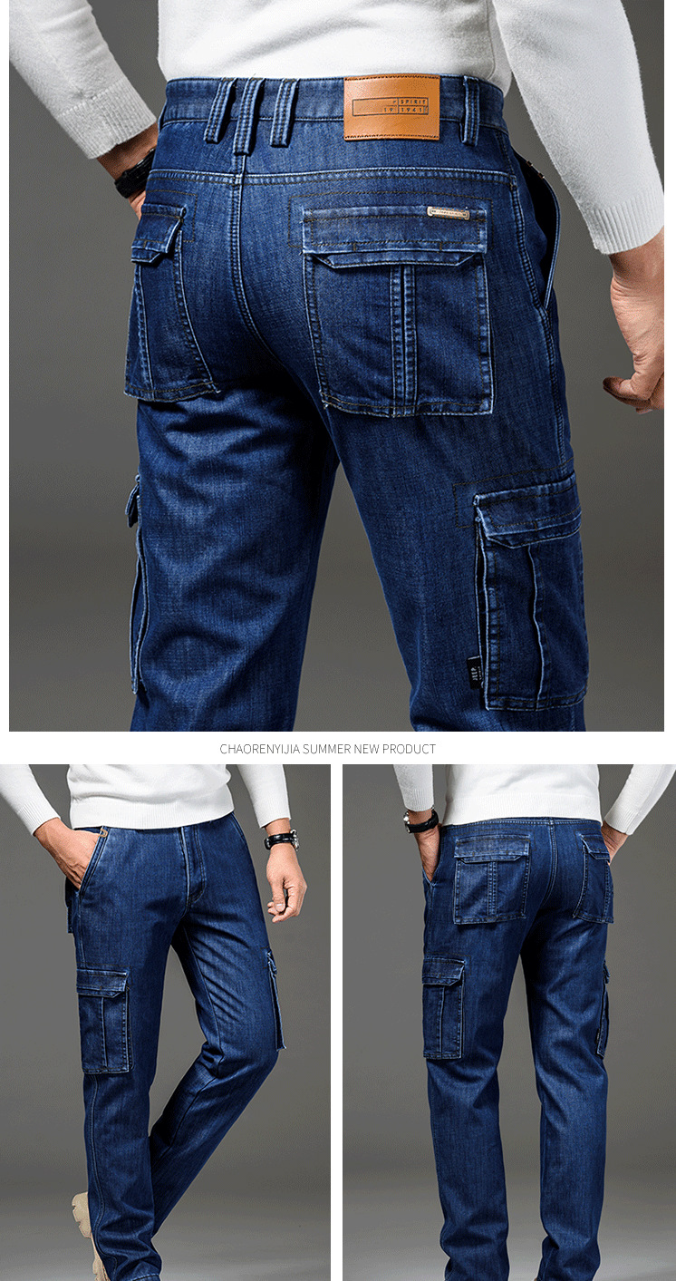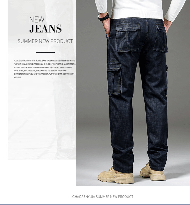 Осенне-зимние мужские джинсы, рабочая одежда, брюки с несколькими карманами, повседневные универсальные утепленные модные штаны на флисовой подкладке 125B Pass Plate