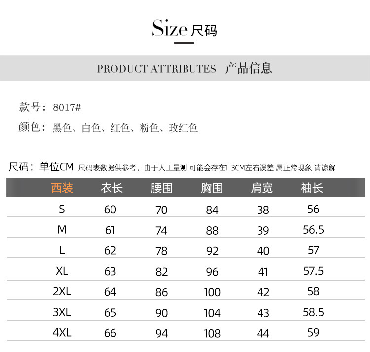 Белый жакет + брюки; Черная куртка + брюки; Розовая куртка + брюки; Розово-красная куртка + брюки; Красная куртка + брюки; Белая куртка + юбка; Черная куртка + юбка; Белая одинарная куртка; Черная одинарная куртка; Розовая цельная куртка; Розово-красная одинарная куртка; Красная одинарная куртка; Белые цельные брюки; Черные цельные брюки; Розовые цельные брюки; Розово-красные цельные брюки; Красные цельные брюки; Белая цельная юбка; черная цельная юбка