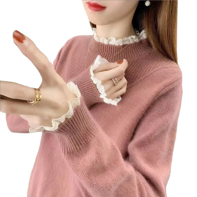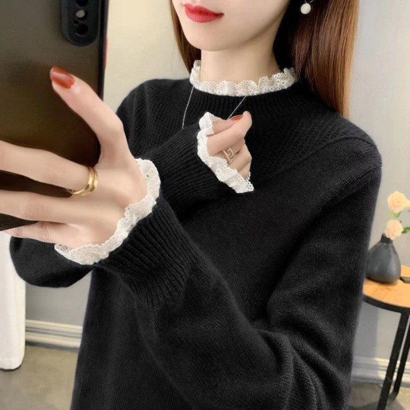 Кружевной свитер с высоким воротом, женская зимняя Новая Вязаная Базовая рубашка, однотонный теплый пуловер, свитер