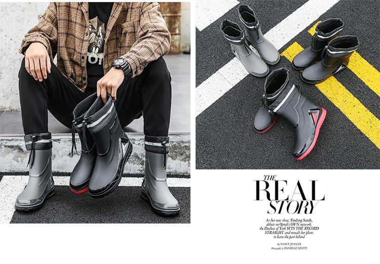 Комплект модных дождевых сапог, мужские новые Нескользящие резиновые сапоги средней длины с короткой трубкой, короткая Водная обувь на флисовой подкладке, работа на открытом воздухе, трансграничная