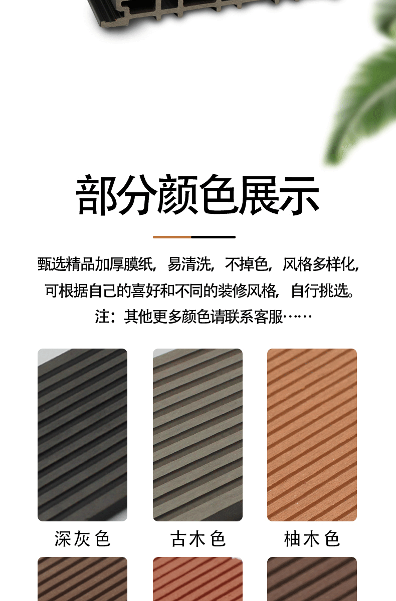 Цвет тика первого поколения; Цвет красного дерева первого поколения; Покол цвета шампанского; Поколение коричневое; Поколение элегантного серого; Поколение темно-кофейного цвета; Цвет черного дерева поколения; Второе поколение коэкструдированного материала цвета тик.; Коэкструдированный камфорный цвет второго поколения; Второе поколение коэкструдированного дымчато-серого цвета; Второе поколение коэкструдированного древесного цвета с эффектом состаренности; Второе поколение коэкструдированного орехового цвета