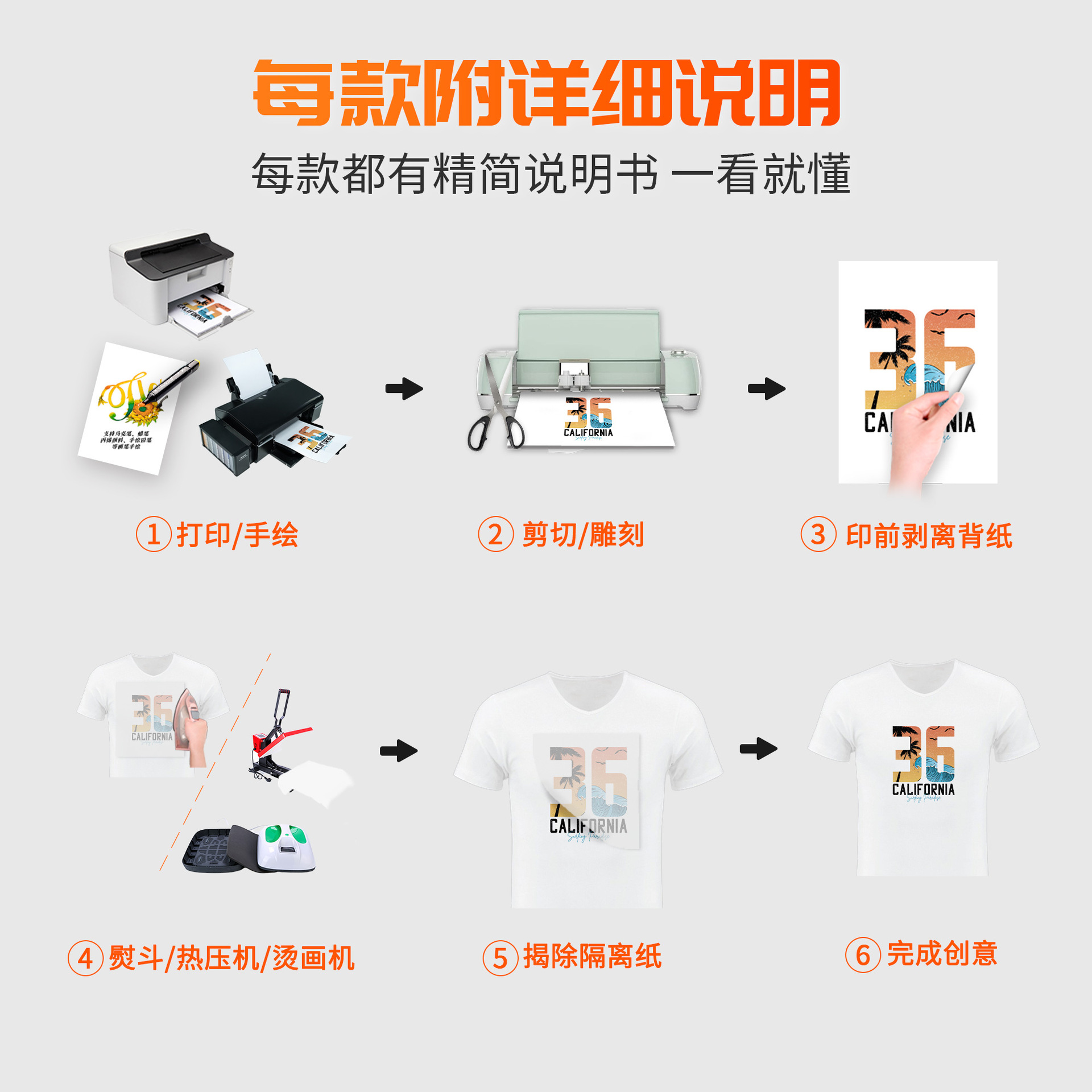 适用场景:适合儿童手工艺品、家庭聚会、体育赛事、生日聚会、学校派对和纪念日、角色扮演、舞台演出、学校奖励、DIY工艺套装或在圣诞节、复活节、感恩节、父亲节、母亲节、情人节、定制您的 T 恤、连帽衫、运动衫、家居装饰,包,抱枕,枕套,被套,背心、口罩、雨伞、手套,娃衣送给朋友或者家人。您也可以在家将 T 恤转印纸转化为您的创收项目,仅通过一台打印机和一个熨斗就能实现。