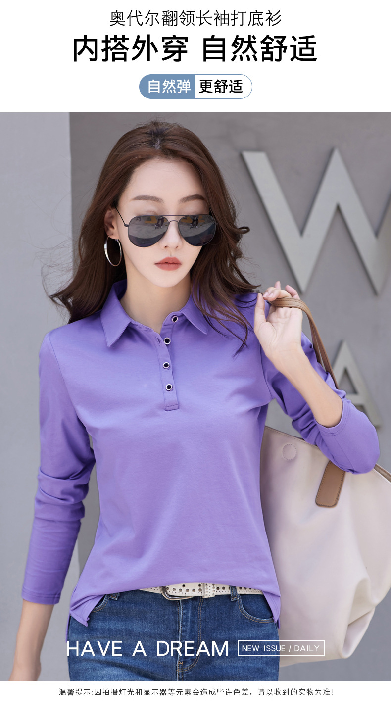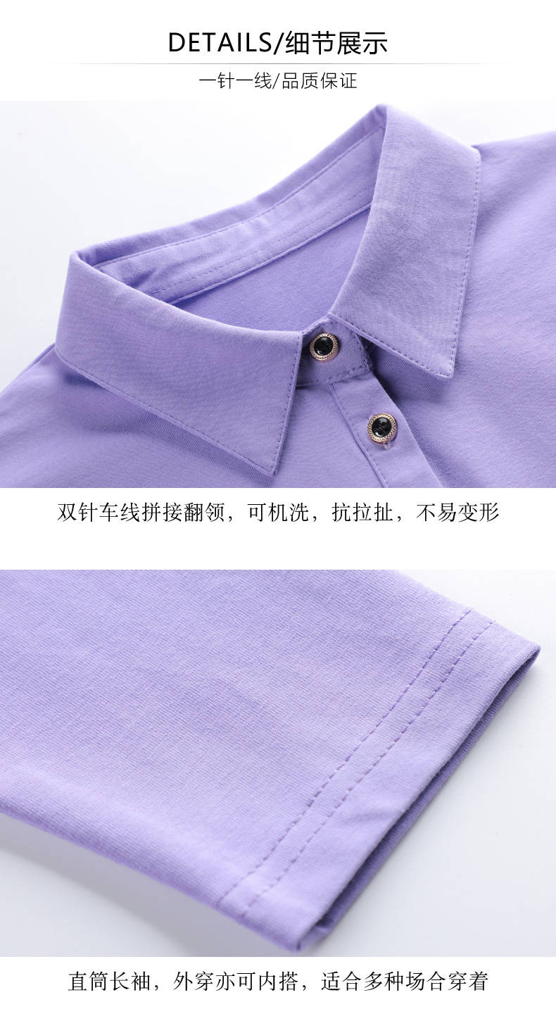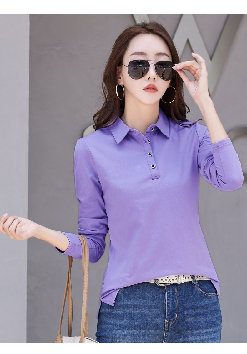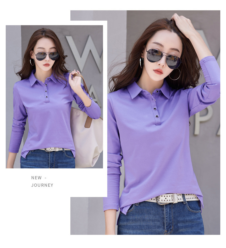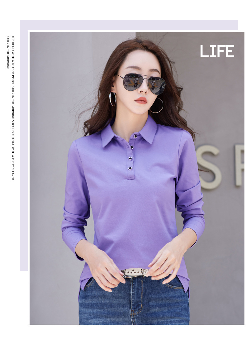 Футболка с длинными рукавами с отворотами из поколения в поколение женская корейская версия хлопчатобумажной простой пуговицы тонкая рубашка поло дикая фиолетовая женская одежда
