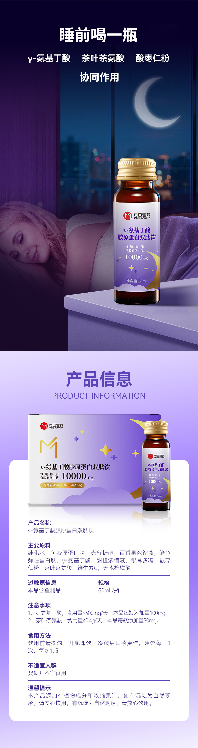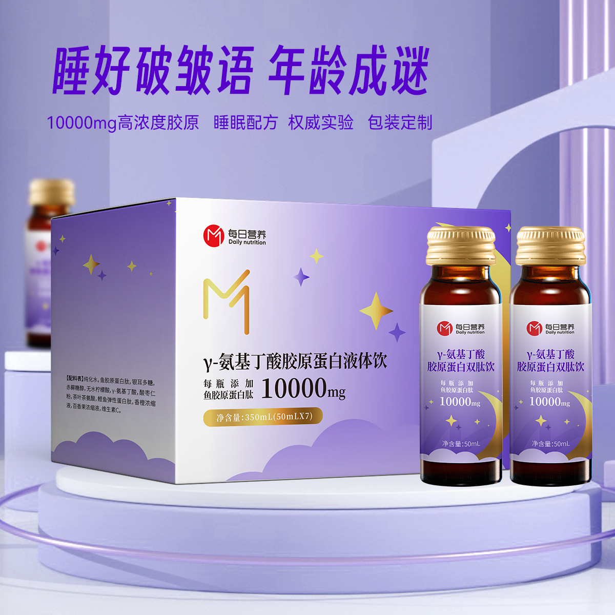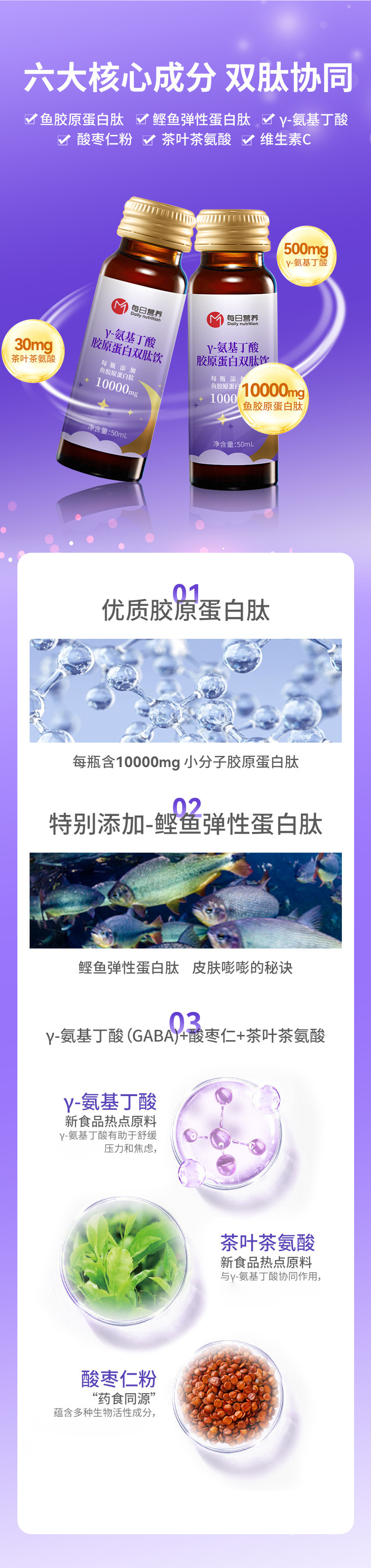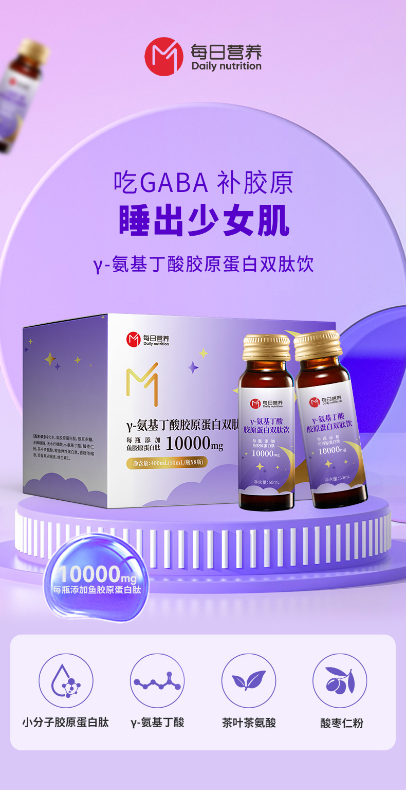 Пептид рыбьего коллагена, полисахарид Tremella, красный фруктоза, безводная лимонная кислота, Y-аминомасляная кислота, порошок ядер мармелада, чайный теанин, мозговой пептид рыбьего эластина.