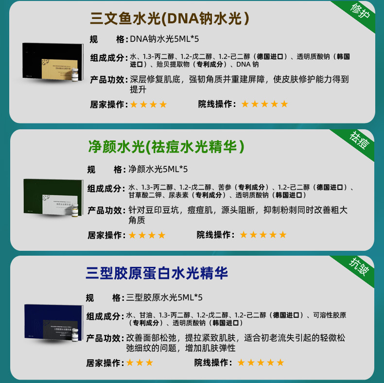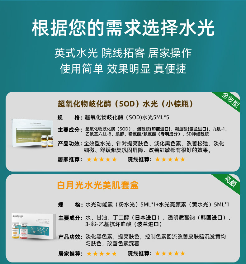 Белый лунный свет водяной рукав для мышц; SOD водяной свет эссенция (полный эффект водяного света 5 палок/коробка); Три типа коллагеновой водяной световой эссенции (5 палок/коробка против морщин воды); Гидротермический экстракт гиалуроновой кислоты (5 палат/коробка); Сущность от прыщей (5 палок/коробка); Лосось ДНК натрия водяная световая эссенция (5 палок/коробка); Яркая световая световая эссенция (подарочная коробка 5) коробка; Гидротермический экстракт гиалуроновой кислоты (одна ветвь); Коллагеновая эссенция (одна); Liangyan Shuiguang Essence (одна ветвь); Сущность от прыщей (одна ветвь); Лосось ДНК натрия Водная световая эссенция (одиночная ветвь); SOD Water Light Essence (одна ветвь)